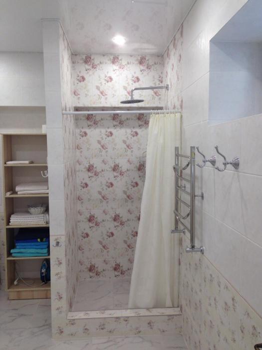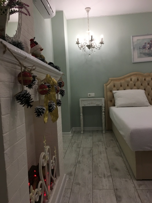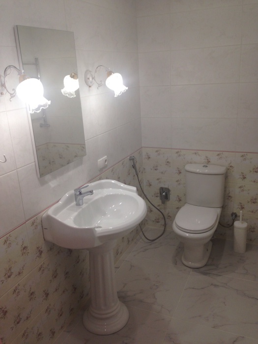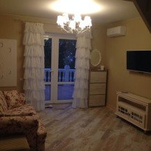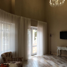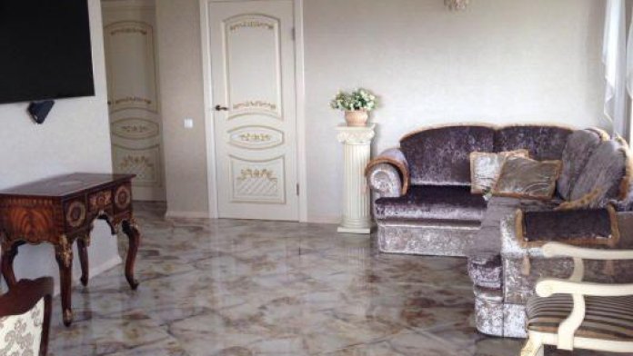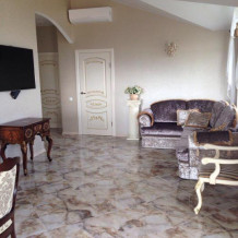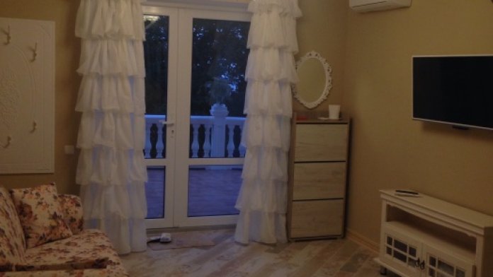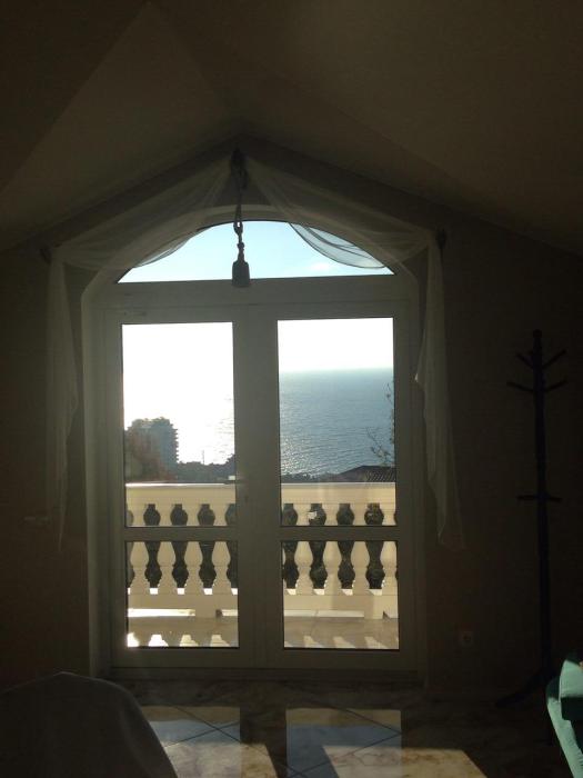 Апартаменты площадью 100 кв.м. занимают полностью третий этаж дома с отдельным входом с террасы площадью 33 кв.м., доступ на которую только у гостей, занимающих этот этаж. На террасе мягкий гарнитур из белой плетенной мебели с потрясающим видом на море, парк и горы. Из апартаментов тоже открывается панорамный вид на море. Дорогой ремонт и деревянная мебель в классическом стиле. В распоряжении гостей кухня с индукционной варочной поверхностью, спецпосудой для плиты, с микроволновой печью и холодильником. Есть весь необходимый комплект посуды-фраже, тарелки, фужеры, рюмки и т.д. Ванная комната с душем, феном, биде. 2 белые спальни с брендовым текстилем (в одной - вид на море и выход на террасу, во второй спальне-2 французских балкона с видом на парк). Огромная кухня- гостиная -столовая с ЖК-телевизором и шикарной мебелью. Есть так же небольшая гардеробная. Во всех номерах в гостиной, кухне, столовой и санузле -теплые полы.