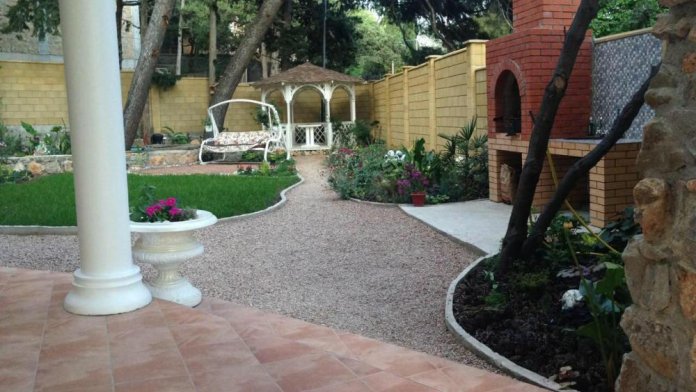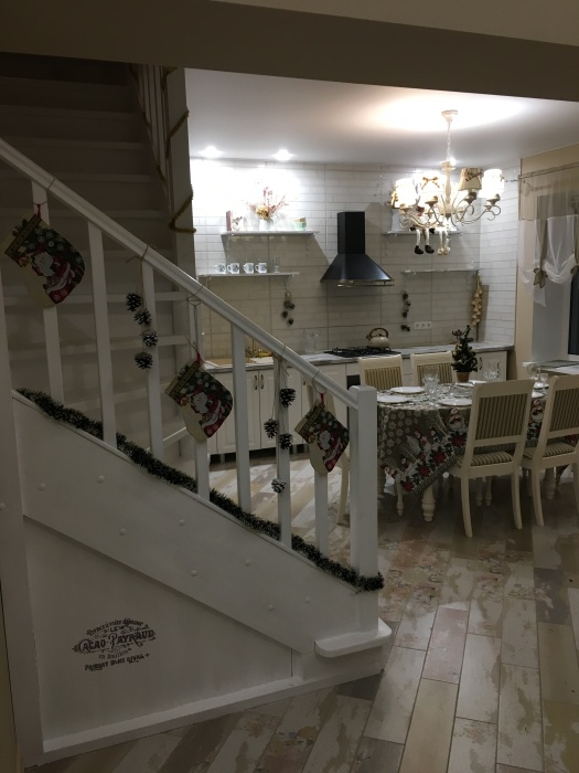 Из части дома на нижнем этаже, с интерьером в стиле шебби-шик, открывается вид на террасу 32 кв.м. и парк, частично на море. В распоряжении гостей кухня с газовой варочной поверхностью и холодильником. Ванная комната с душем, гигиеническим душем, 2 спальни на втором этаже, холл, столовая. Интерьер располагает на романтический отдых.