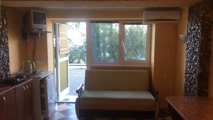 Апартамент на первом этаже и состоит из большой комнаты-студии (зал с кухонным блоком) и ванной комнаты. Современная отделка, все удобства (туалет, душ, кондиционер, спутниковое ТВ), холодильник, микроволновая печь, два диванчика, стол со стульями. Все кухонные принадлежности есть в наличии. Вместительность не больше 4 человек.