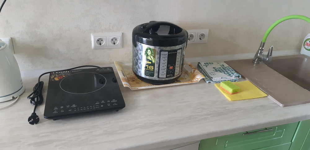На кухне в наличии микроволновая печь, холодильник, отсутствие плиты полностью компенсирует мультикухня (мультиварка+сковородка), кухонная мебель, необходимый набор посуды, кухонных принадлежностей и инструментов.