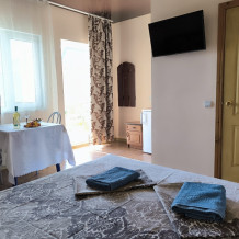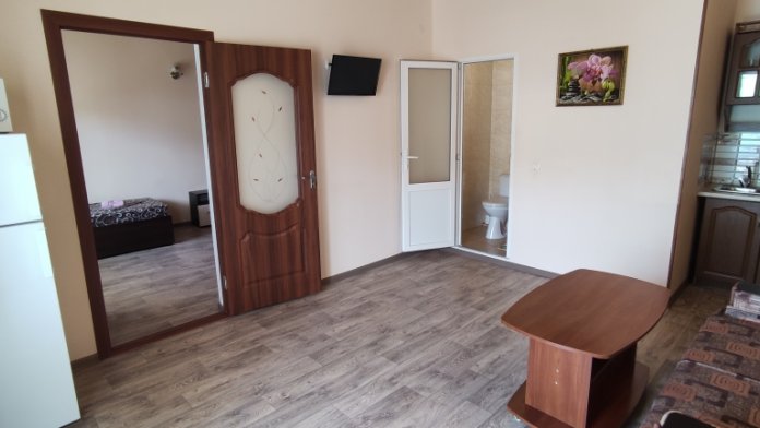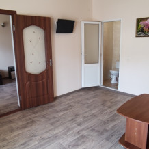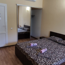 Номер Люкс 2-комнатный находится во 2 корпусе Гостевого Дома и представляет собой номер площадью до 40 кв. м. Номер оборудован мини-кухней с необходимой посудой, микроволновой печью, электрочайником. В спальной комнате расположены двухспальная и односпальные кровати, шкаф-купе телевизор и кондиционер. Во второй комнате номера находятся прихожка, раскладной диван, где могут разместиться еще 2 человека, мини-кухня, холодильник, телевизор и кондиционер. Душ и туалет находятся в номере. Перед номером на балконе имеется столик и стулья.