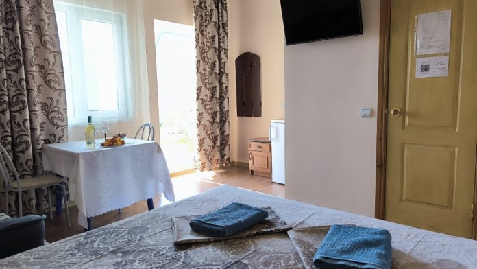 Номер Полулюкс 3 (4)-местный находится в 1 корпусе Гостевого Дома и представляет собой комнату с увеличенной площадью до 30 кв.м, в которой располагаются двухспальная кровать и раскладной диван, прикроватные тумбочки, шкаф для одежды, кондиционер, холодильник, телевизор с цифровым вещанием. Душ и туалет находятся в номере. У каждого номера есть свой столик и стулья на балконе.