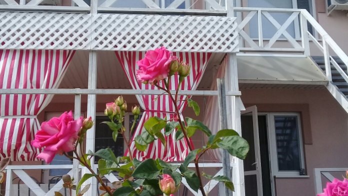 Один из 6-ти местных номеров - Студия имеет особый статус, так как он занимает весь первый этаж дома и имеет своею кухню с посудой и беседку для отдыха. В номере - кондиционер, стиральная машина, микроволновая печь, электрочайник, холодильник, телевизор, спутниковая антенна, еврокровать, два раскладных дивана, раскладное кресло и имеется возможность двух дополнительных мест. Два других 2-комнатных 6-местных расположены на отдельной территории площадью 4 сотки и еще два 2-комнатных 6-местных расположены на втором этаже, имеют большой балкон с видом на море, а также летнюю кухню и площадку для отдыха, которые используются только жильцами этих двух номеров.