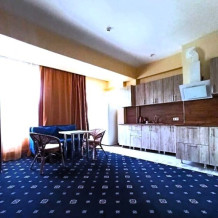 Просторный номер студия с двуспальной или двумя односпальными кроватями, одним дополнительным местом и мини-кухней.