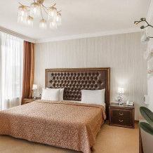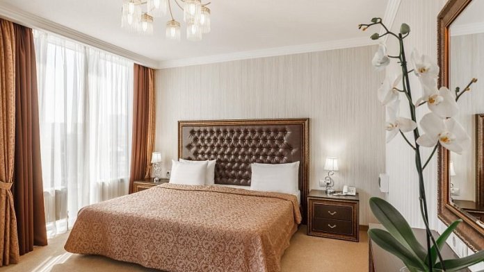 Просторный разделенный на две зоны номер. Гостиная с роскошным кожаным диваном и будуаром и спальня с одной большой кроватью. Возможна установка дополнительных спальных мест.