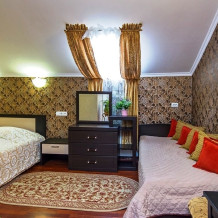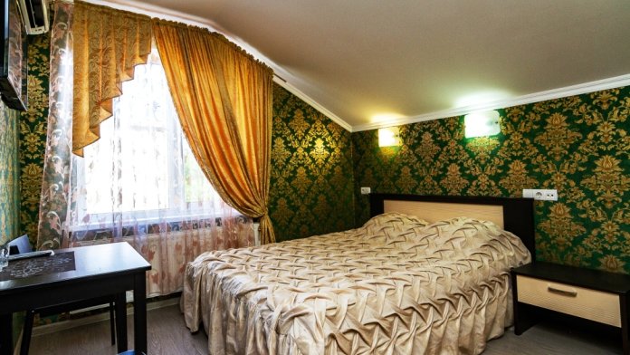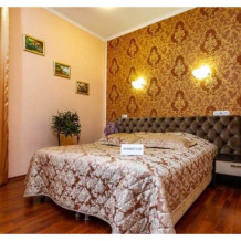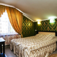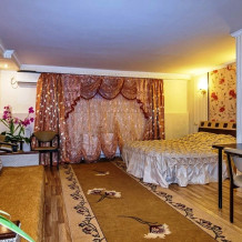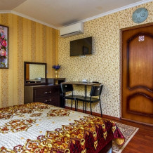 В номере: Двуспальная кровать с ортопедическим основанием, прикроватные тумбочки, раскладной диван, комод, зеркало, Ж/К, плазменный телевизор, гладильная доска, сплит-система, WiFi.