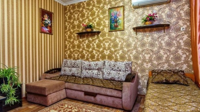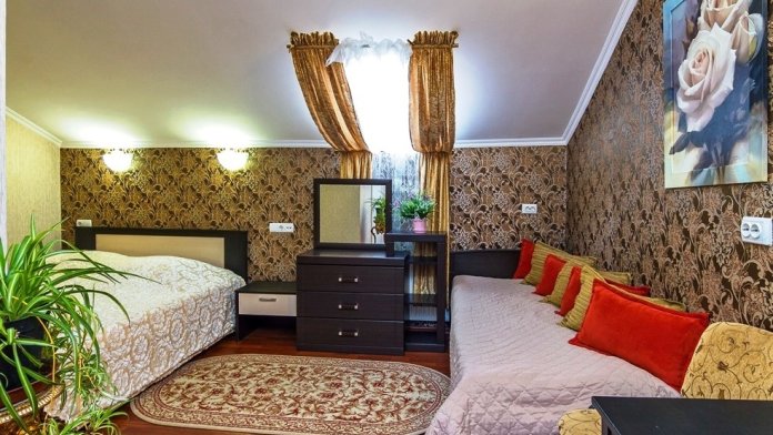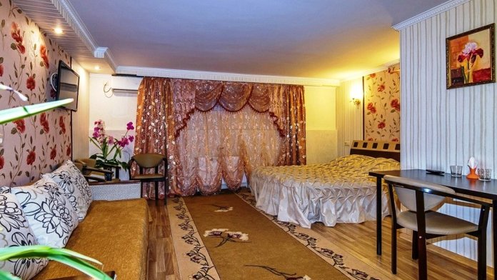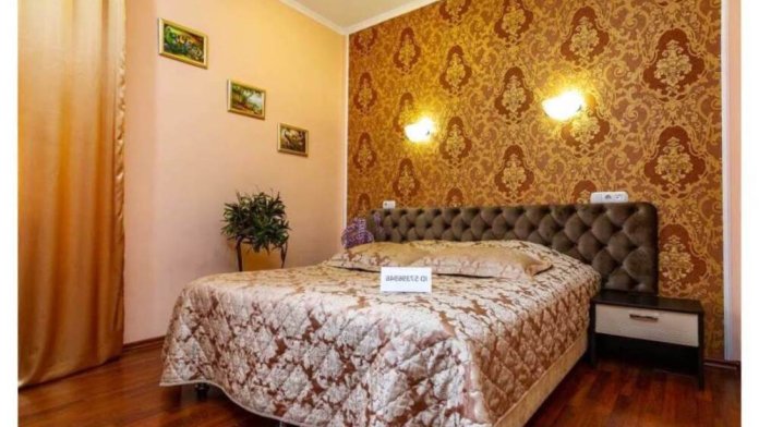 В номере: Новая современная мебель-двуспальная кровать с ортопедическим основанием, прикроватные тумбочки, раскладной диван, комод, зеркало, плазменный новый телевизор «Филипс», холодильник, гладильная доска, телефон, сплит-система, WiFi.