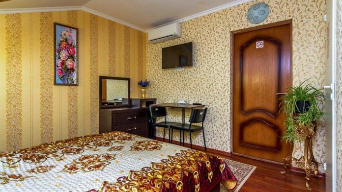 В номере: Двуспальная кровать с ортопедическим основанием, прикроватные тумбочки, комод, зеркало, Ж/К плазменный телевизор, гладильная доска, телефон, сплит-система, WiFi.