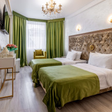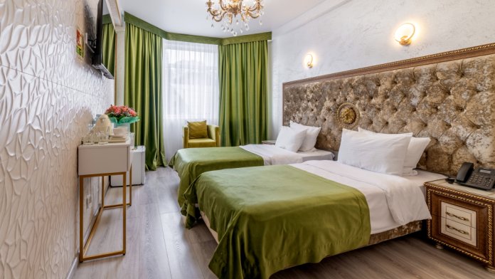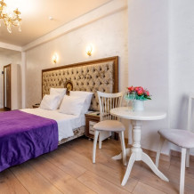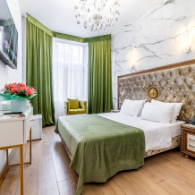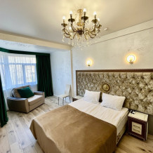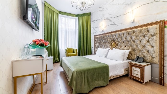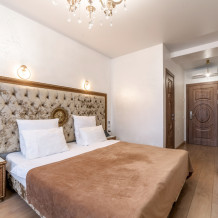 Уютный номер с видом на город. В номере двуспальная кровать «King Size» или две односпальные кровати, телевизор со Smart TV, климат-контроль, сейф, мини-холодильник, чайный уголок, Wi-Fi. Ванная комната с душевой, феном и косметическими принадлежностями.