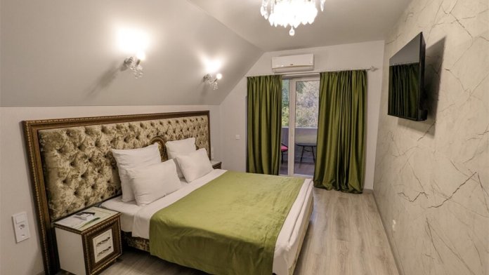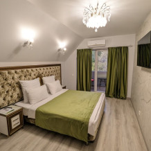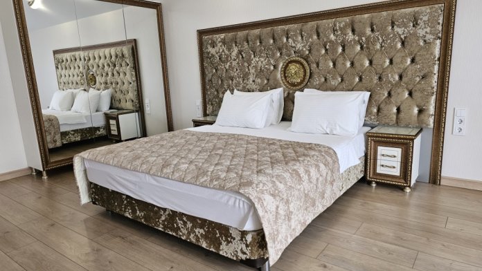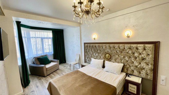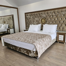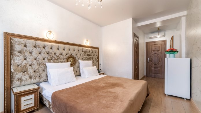 Уютный номер “Комфорт” с роскошной королевской кроватью. Оснащен современной душевой кабиной, телевизором со Smart TV и всем необходимым для комфортного проживания. К услугам гостей удобная мебель, ортопедическое спальное место и премиальное постельное белье.