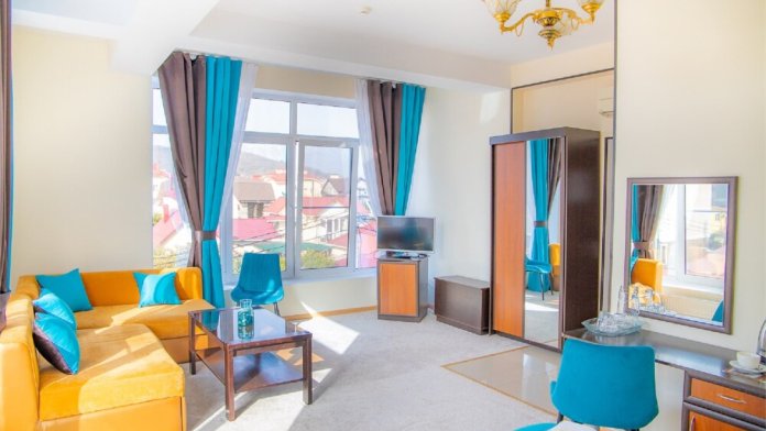 На первом этаже расположен ресторан с разнообразным ассортиментом блюд кавказской и европейской кухонь.