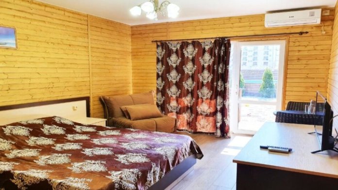 Отдельная терраса с автономным входом в номер (на 1 этаже). Однокомнатный номер с отдельной террасой общей площадью 23 кв.м. Оборудован двуспальной кроватью и мягким раскладным креслом, которое можно использовать для размещения третьего гостя.
