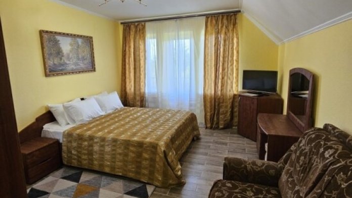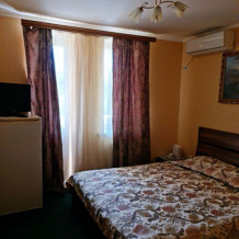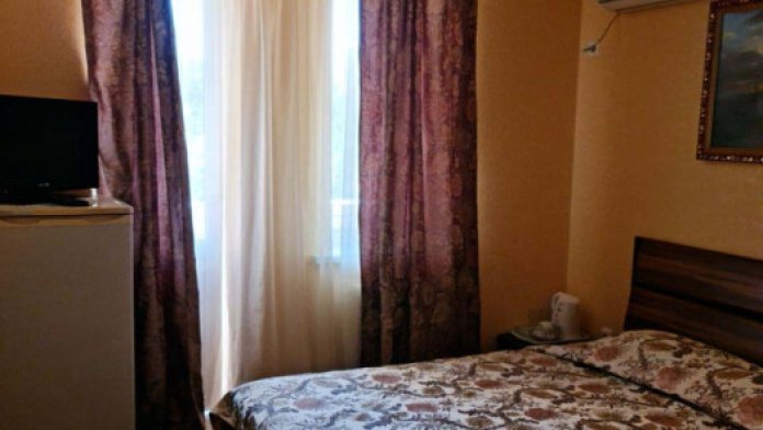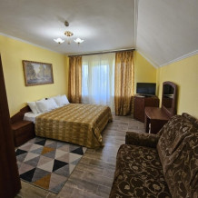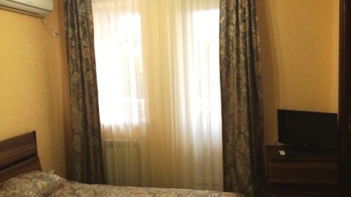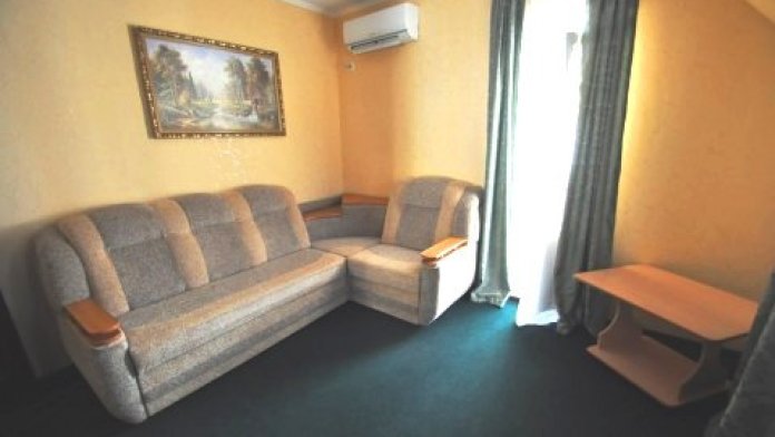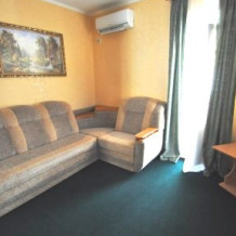 В номере у нас сплит-система, телевизор, холодильник, ковровое покрытие, спальный гарнитур, малогабаритный диван, сейф, чайник, фен, балкон со столом и стульями, туалет с ванной комнатой.