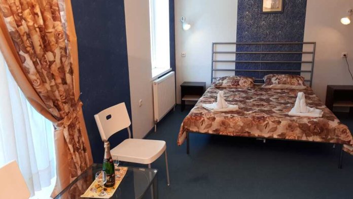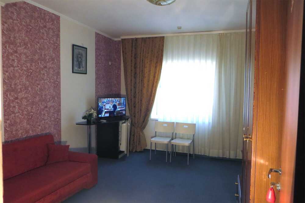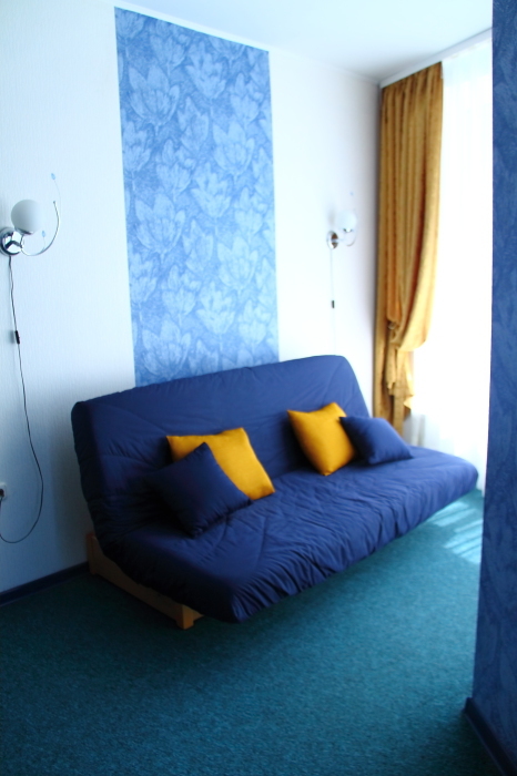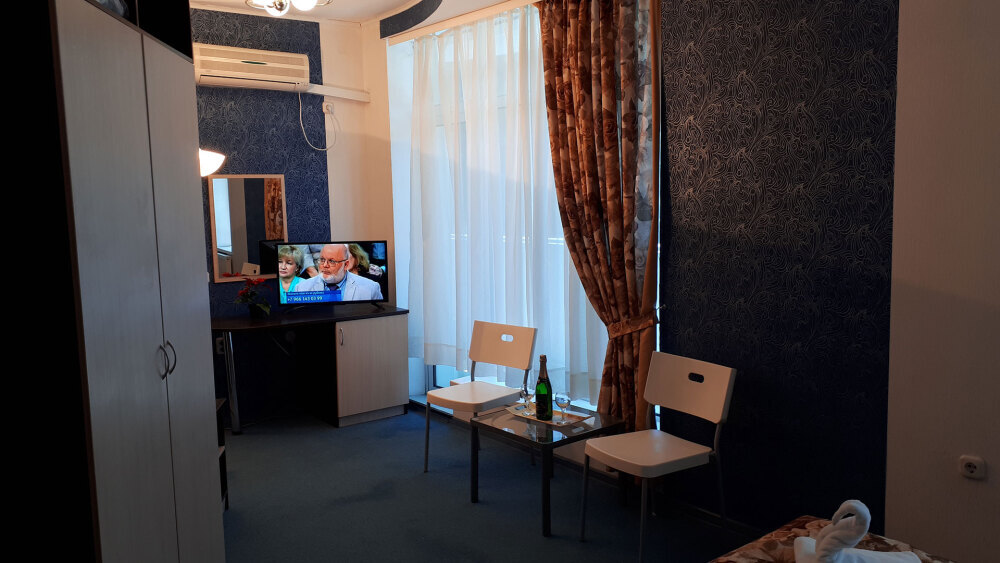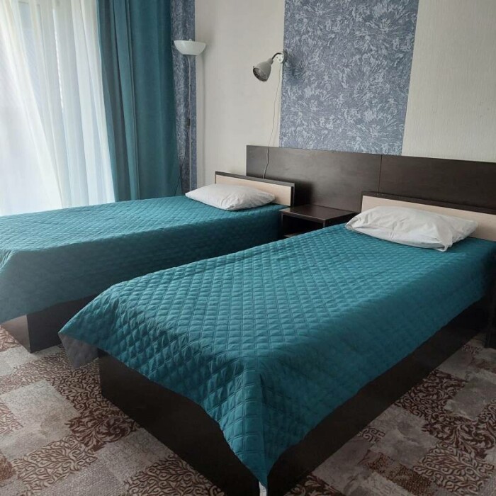 Одна комната. Одна двуспальная +односпальная кровать (или три односпальные кровати) с прикроватными тумбочками, шкаф, журнальный столик, телевизор с плоским экраном (спутниковое ТВ – 20 программ), мини-бар, торшер, кондиционер, чайный столик (эл. чайник, чай, сахар). С/у с душевой кабиной, фен. Балкон с пластиковой мебелью.