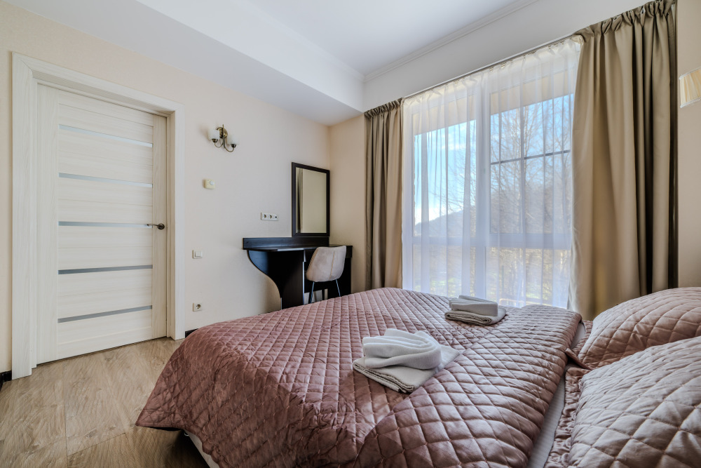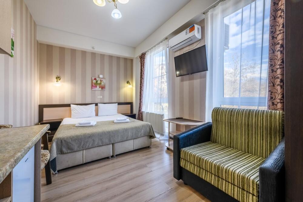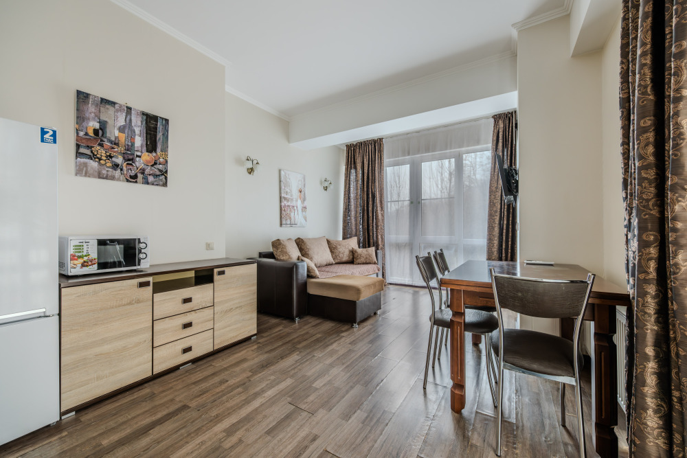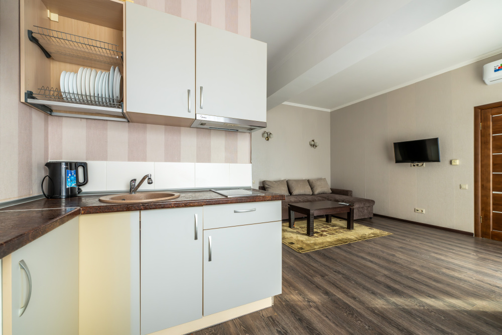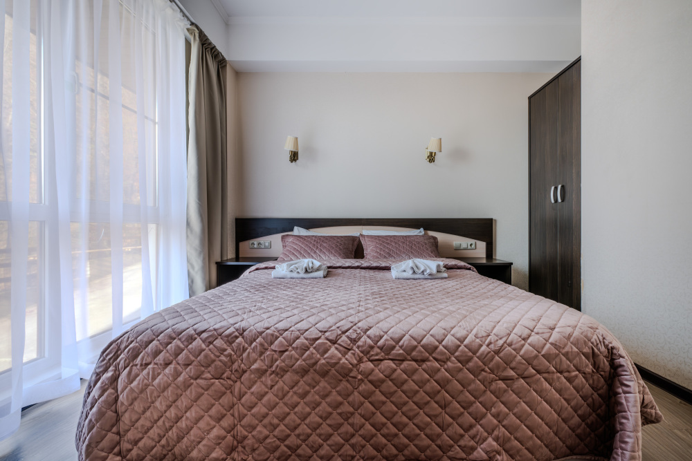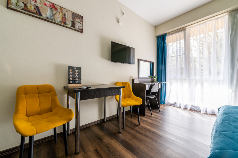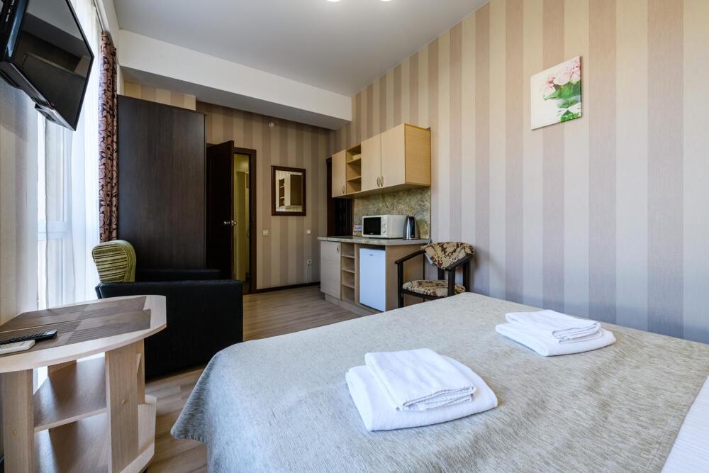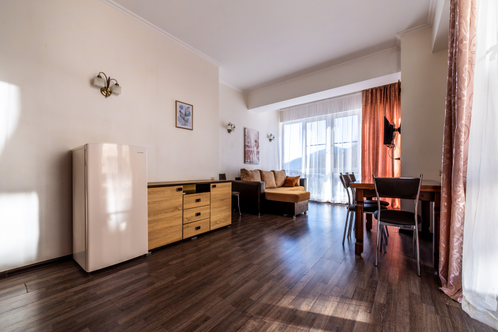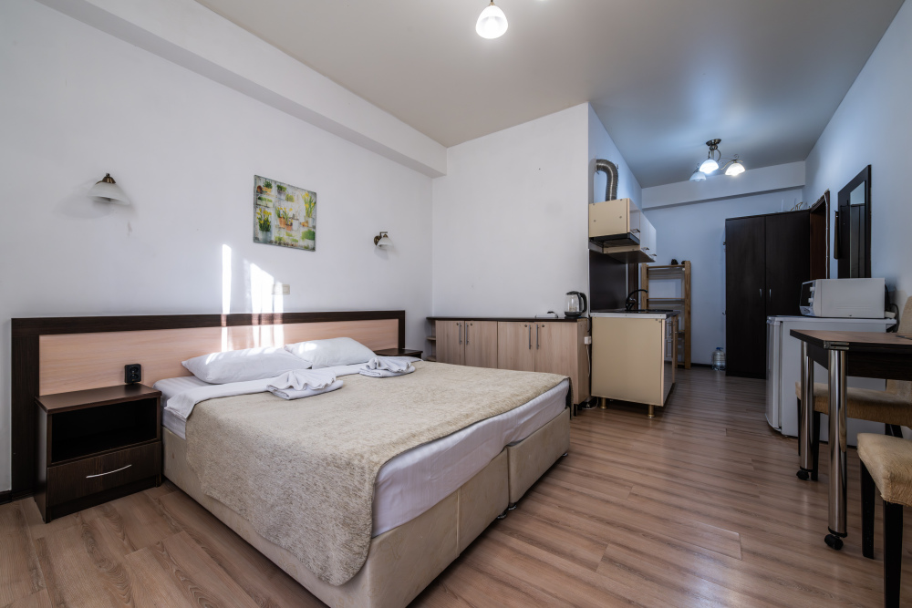 Разумный выбор - «Студия с видами на горы».19 м2 c одной большой кроватью. Такую Студию можно забронировать с двумя раздельными, односпальными кроватями. В уютном эркере с видом на горы приятно поболтать за бокалом вина или чашкой чая. Плюс вас порадует приятная цена, а сэкономленные деньги лучше потратить на процедуры в Spa или открытый бассейн у наших соседей Пансионат «Беларусь» . Студия оснащена классической ванной . Просторный комната с зоной гостиной, кухни и спальни. Кухня полностью укомплектована: кастрюли, сковороды, тарелки, приборы, в общем, все необходимое.