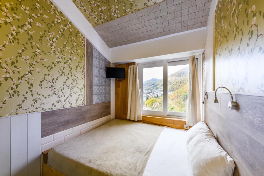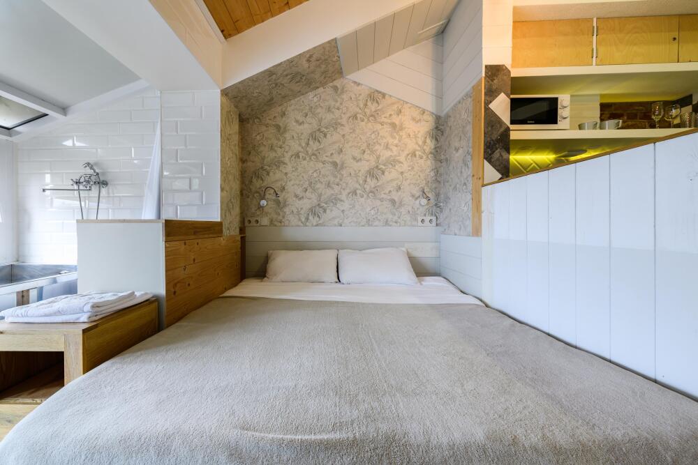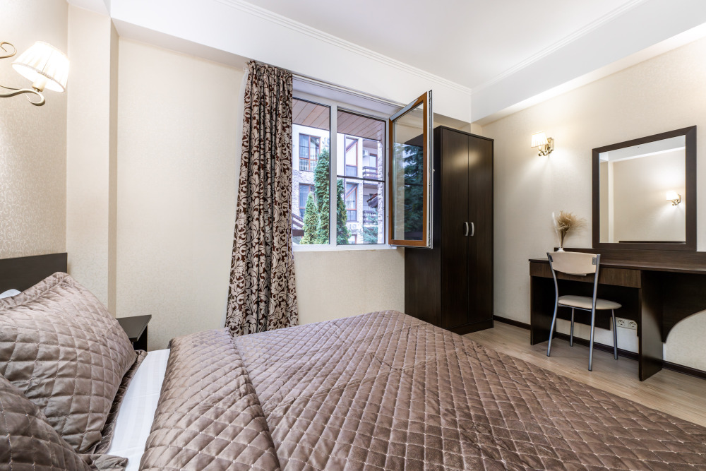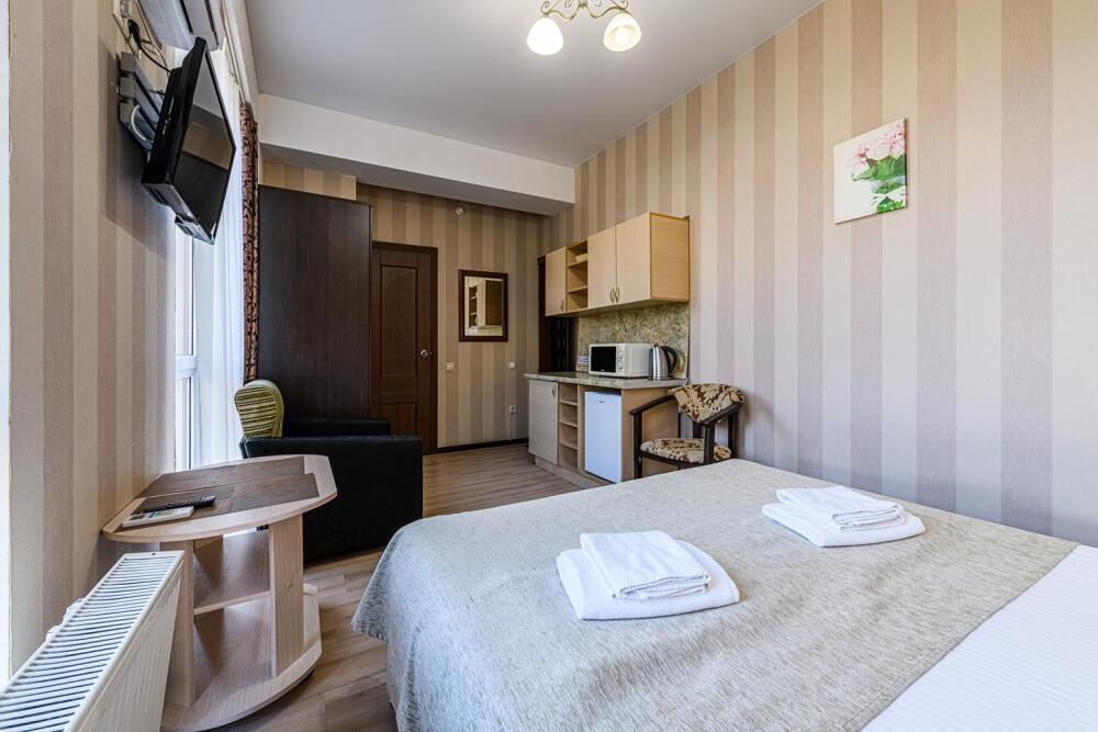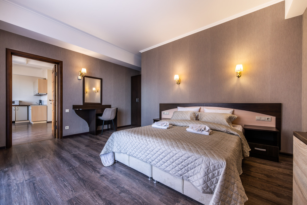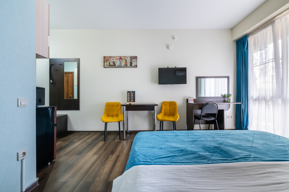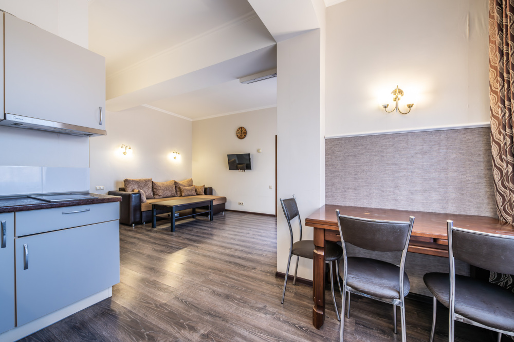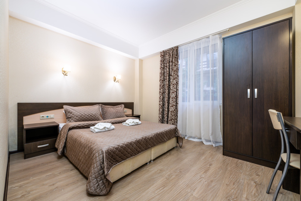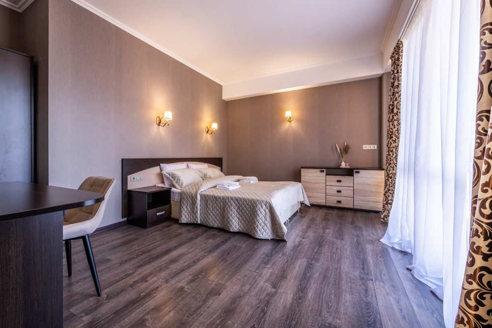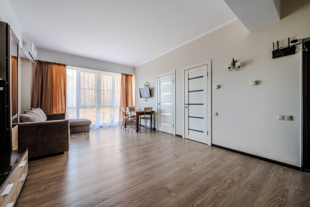 Разумный выбор - «Студия с видами на горы».19 м2 c одной большой кроватью. Такую Студию можно забронировать с двумя раздельными, односпальными кроватями. В уютном эркере с видом на горы приятно поболтать за бокалом вина или чашкой чая. Плюс вас порадует приятная цена, а сэкономленные деньги лучше потратить на процедуры в Spa или открытый бассейн у наших соседей Пансионат «Беларусь» . Студия оснащена классической ванной . Просторный комната с зоной гостиной, кухни и спальни. Кухня полностью укомплектована: кастрюли, сковороды, тарелки, приборы, в общем, все необходимое.