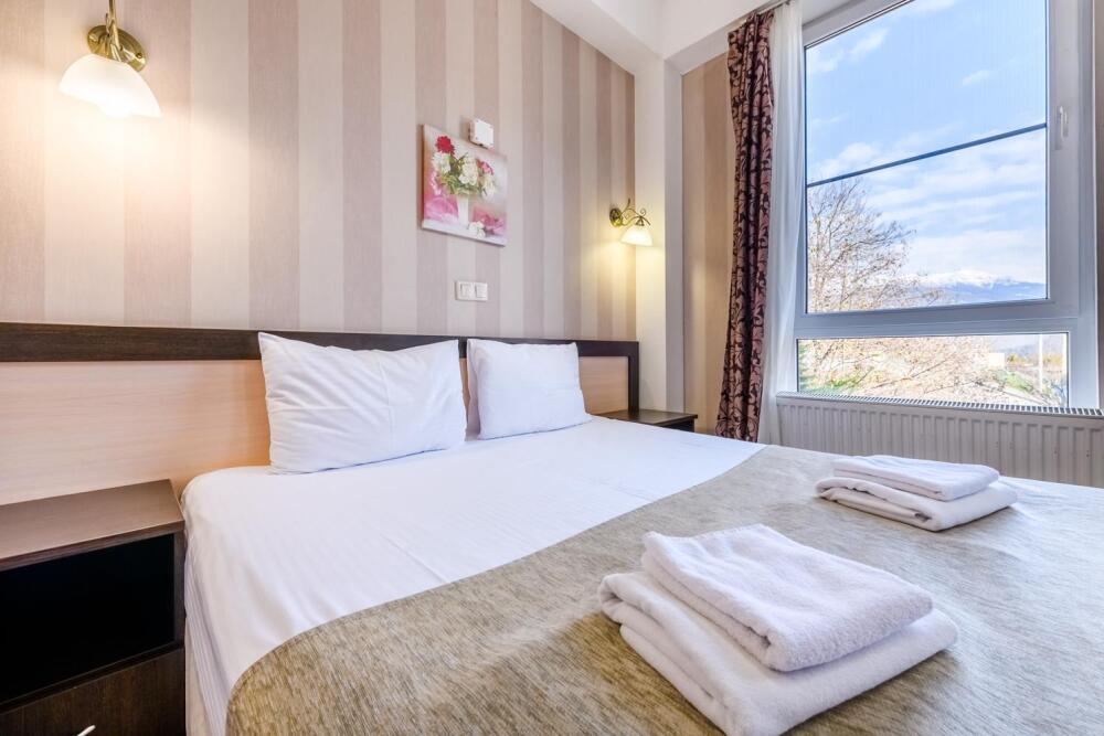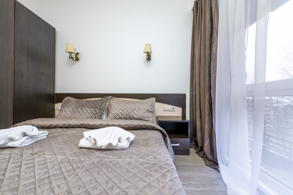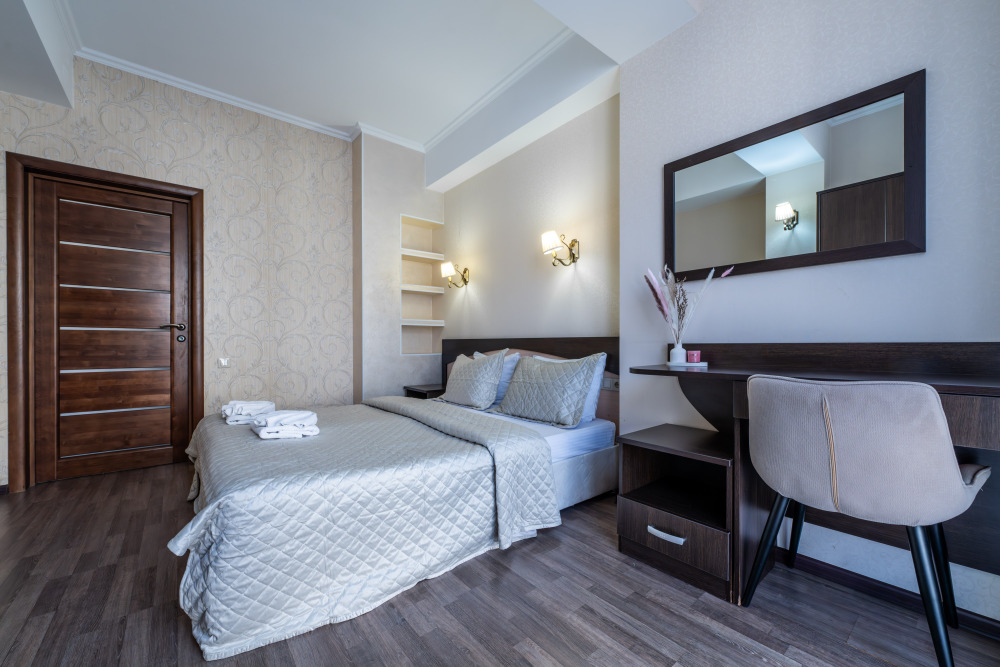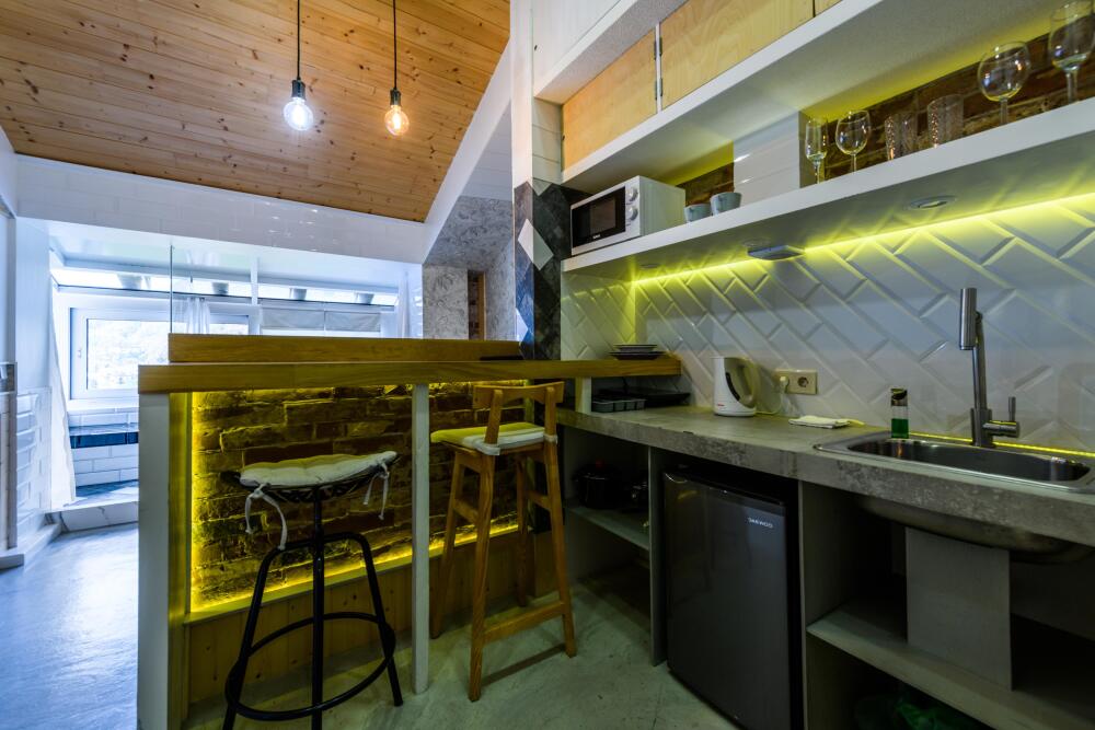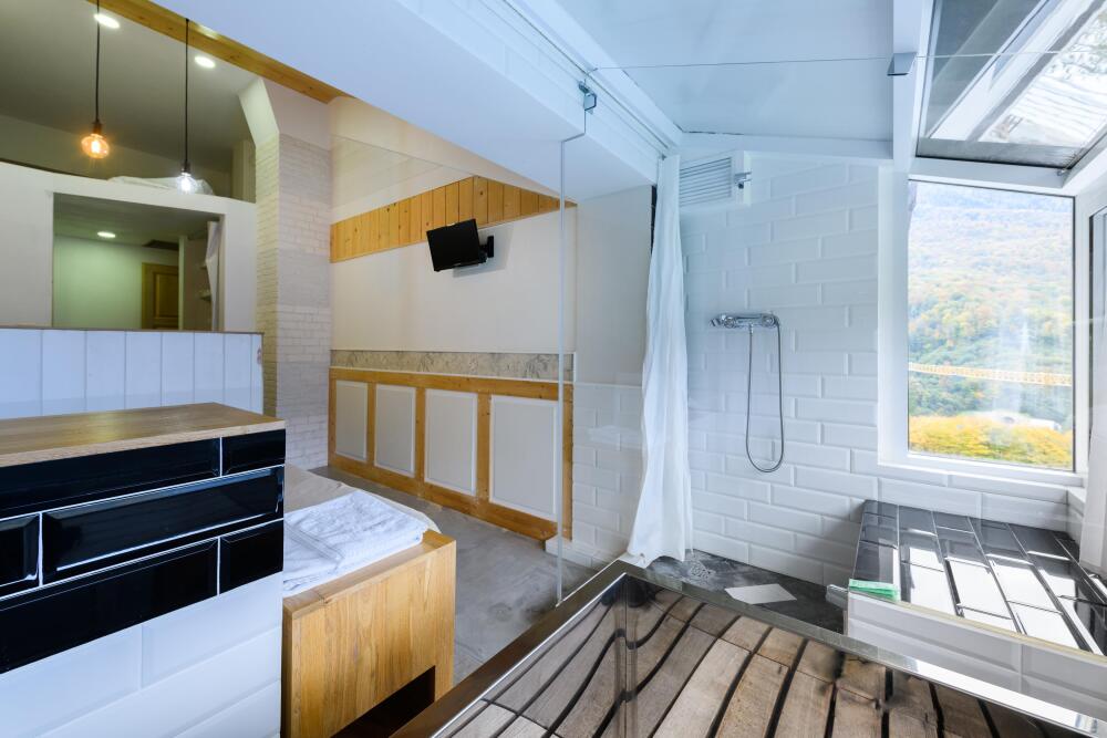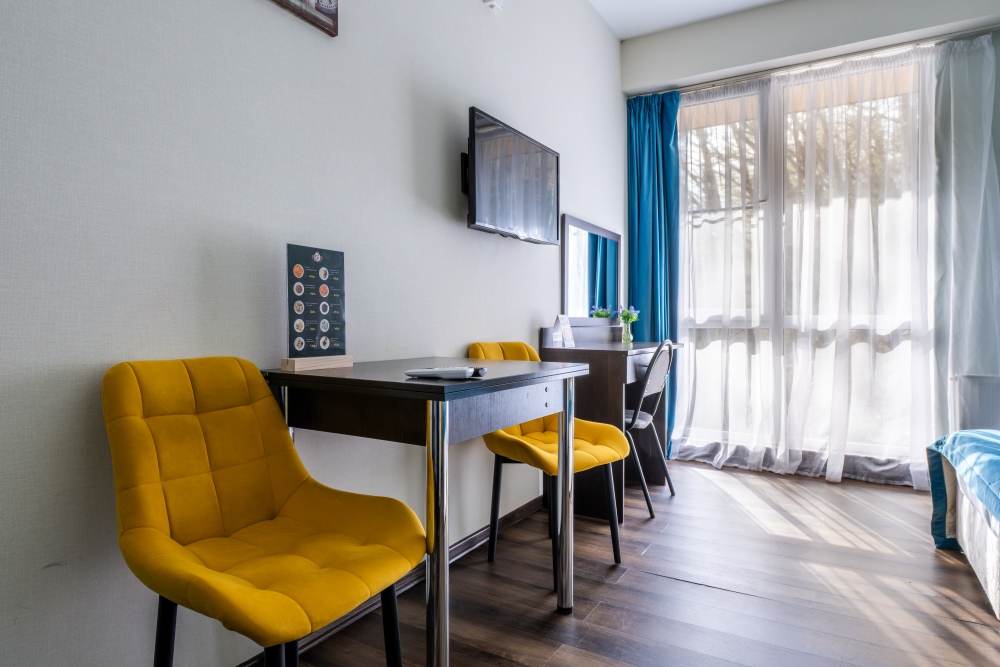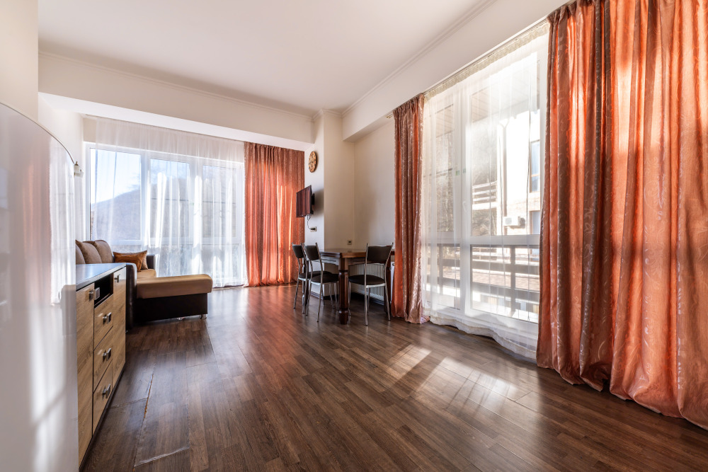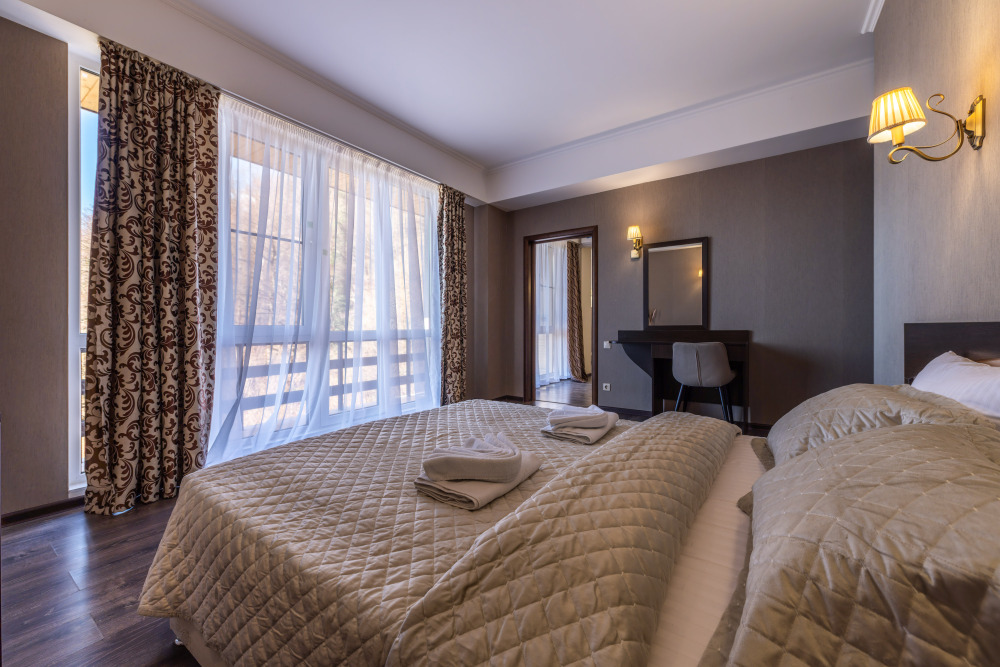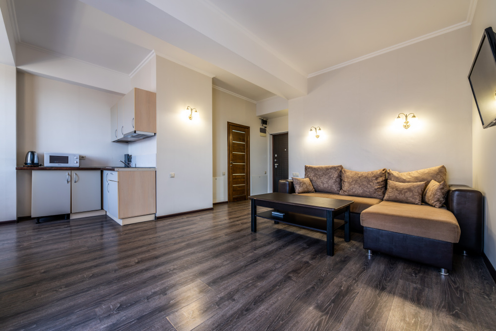 Разумный выбор - «Студия с видами на горы».19 м2 c одной большой кроватью. Такую Студию можно забронировать с двумя раздельными, односпальными кроватями. В уютном эркере с видом на горы приятно поболтать за бокалом вина или чашкой чая. Плюс вас порадует приятная цена, а сэкономленные деньги лучше потратить на процедуры в Spa или открытый бассейн у наших соседей Пансионат «Беларусь» . Студия оснащена классической ванной . Просторный комната с зоной гостиной, кухни и спальни. Кухня полностью укомплектована: кастрюли, сковороды, тарелки, приборы, в общем, все необходимое.