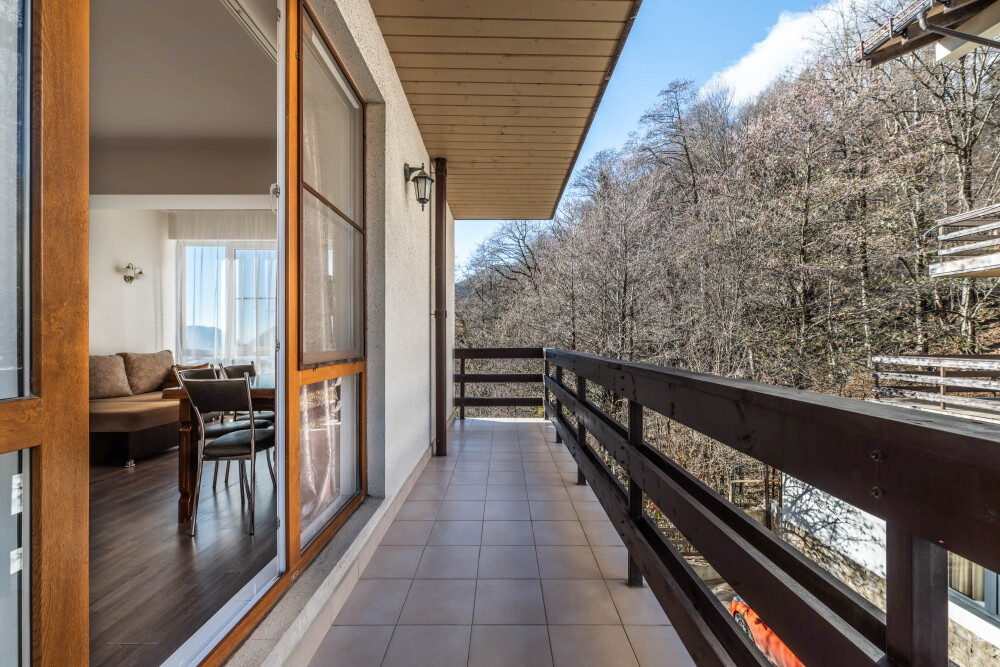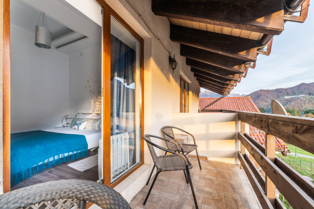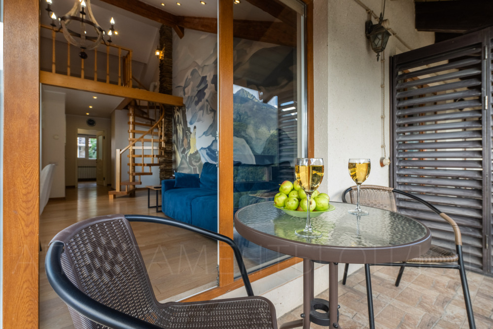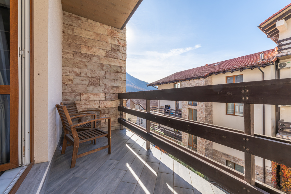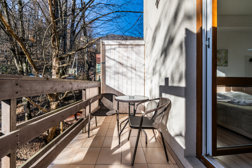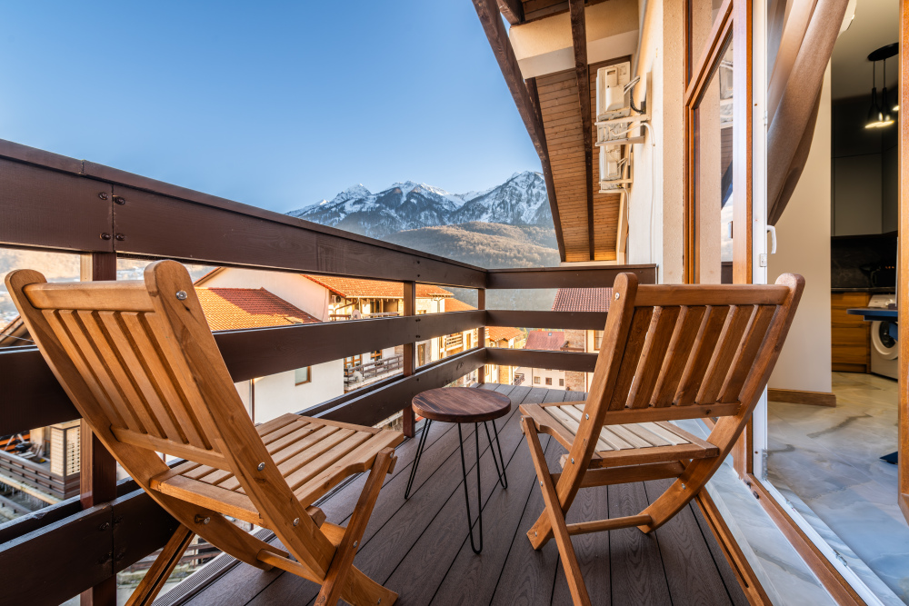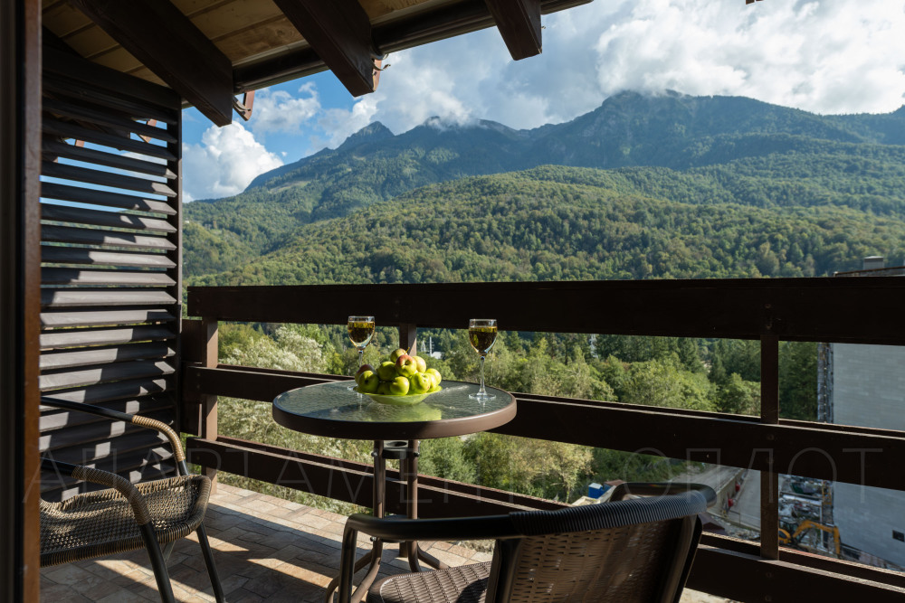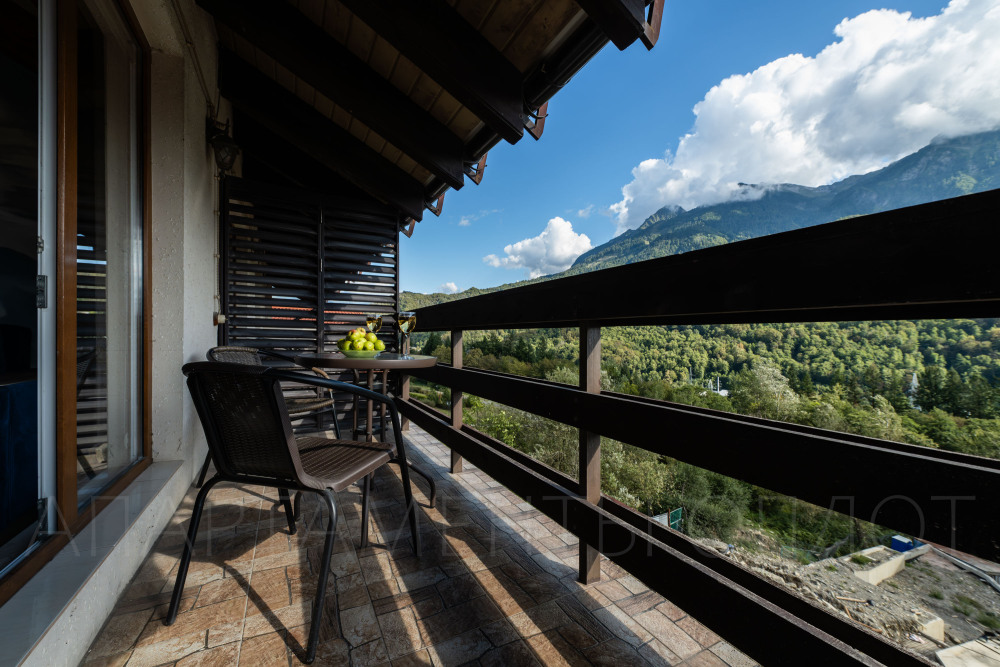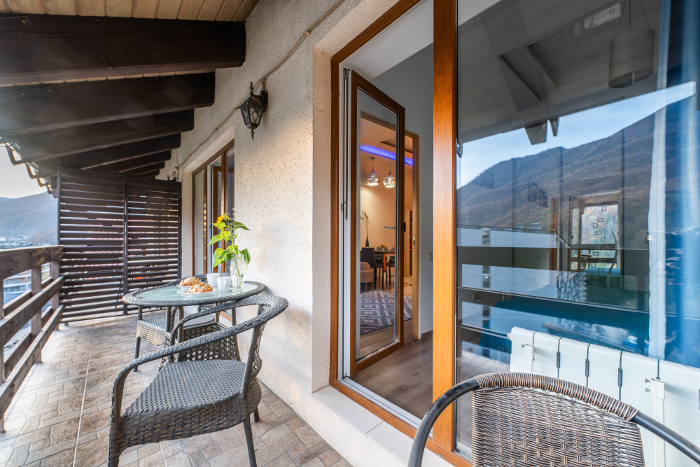 Здесь На просторной собственной террасе с мебелью для отдыха. Вы сможете прекрасно отдохнуть, насладиться свежим воздухом и полюбоваться горным пейзажем