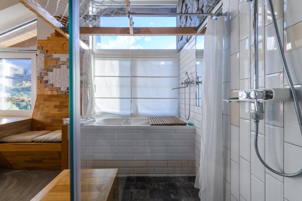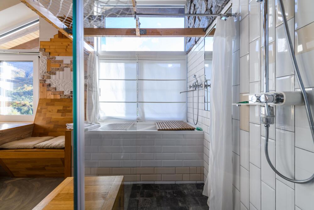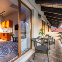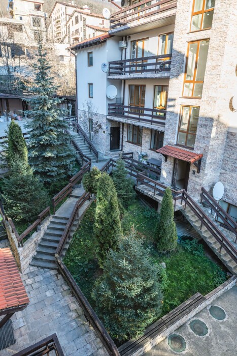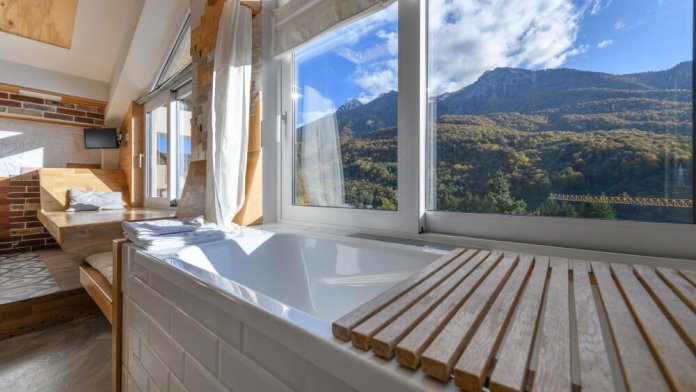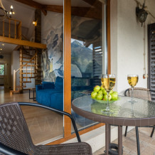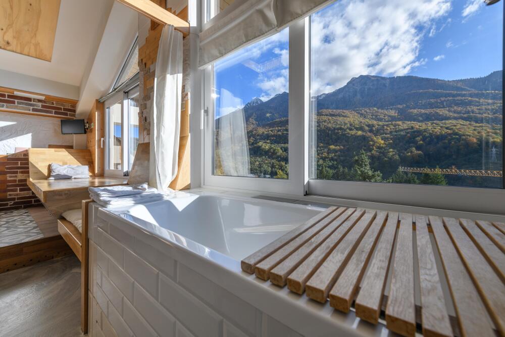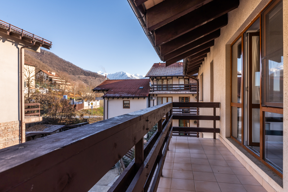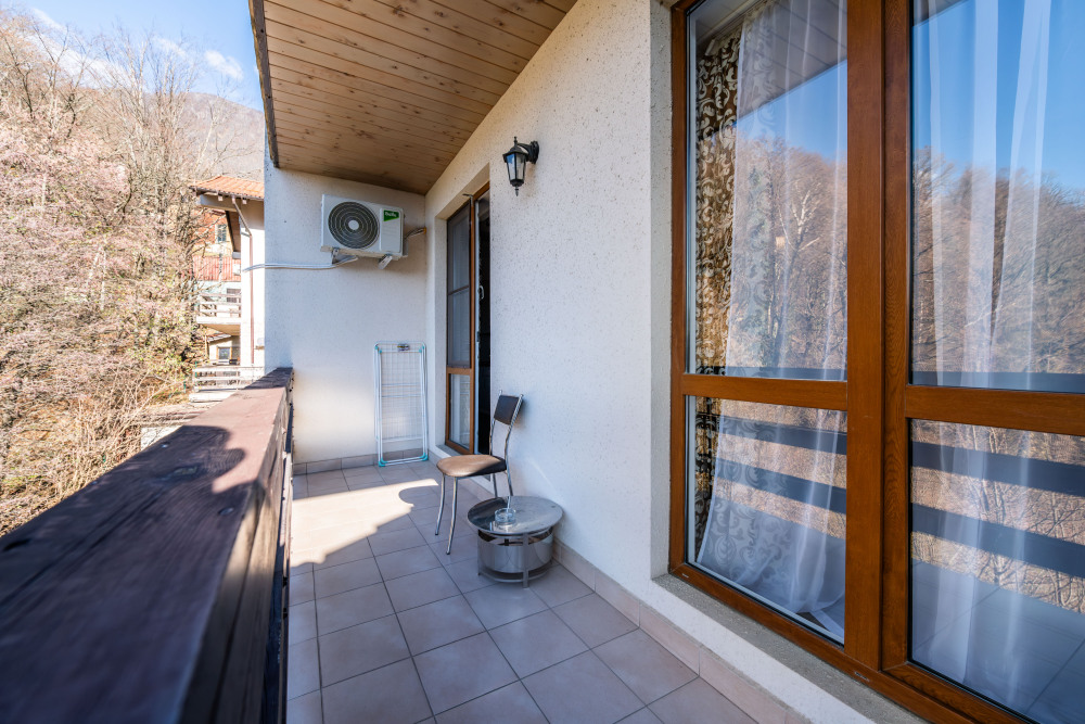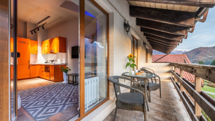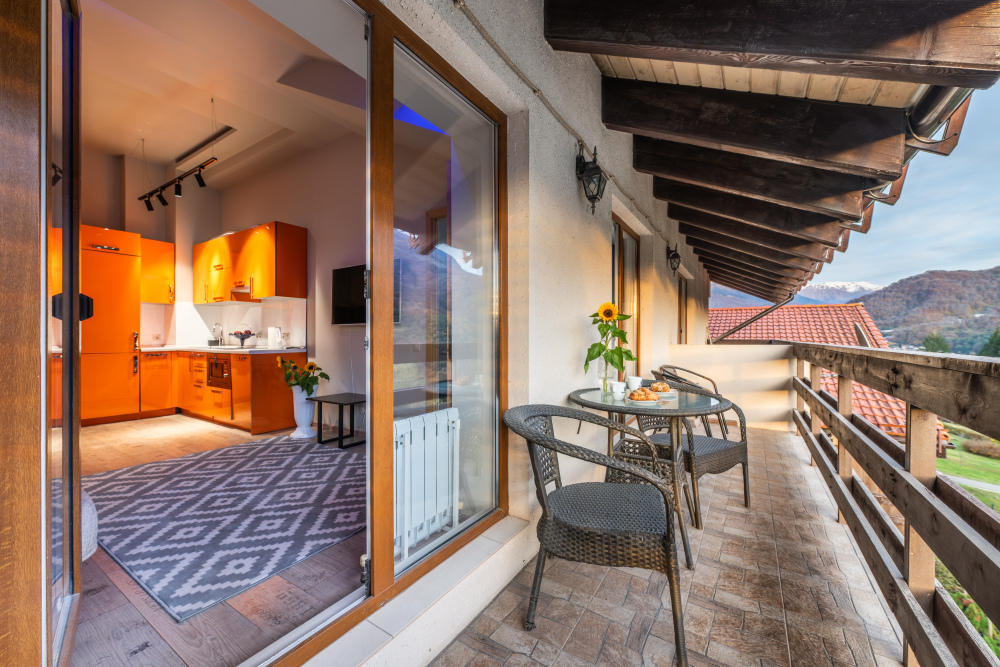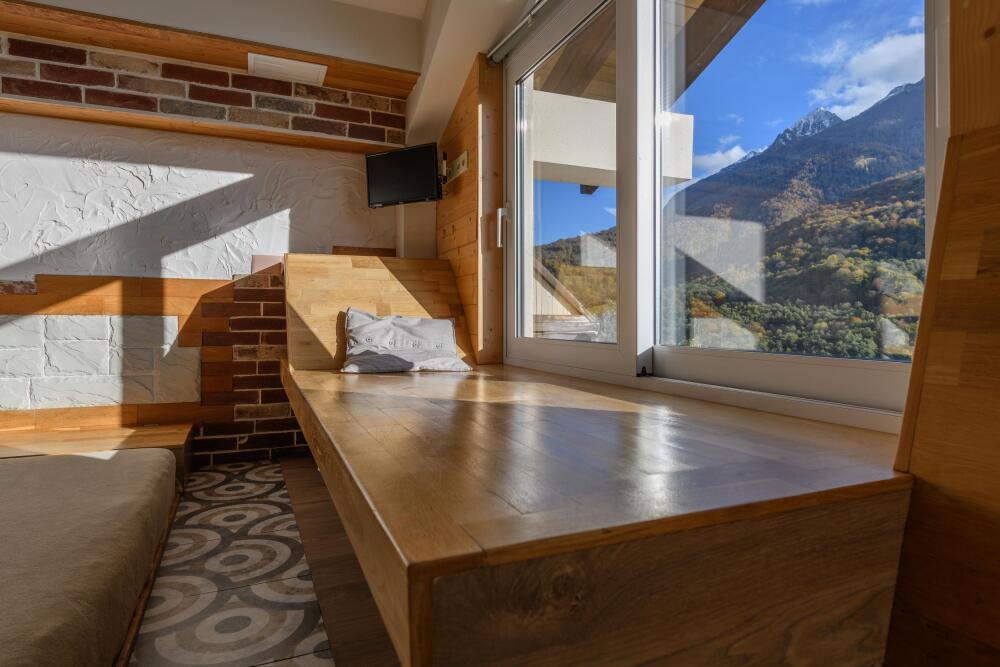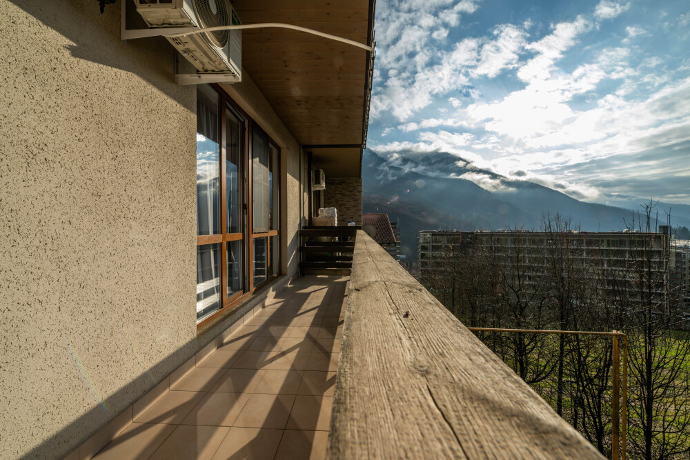 Здесь На просторной собственной террасе с мебелью для отдыха. Вы сможете прекрасно отдохнуть, насладиться свежим воздухом и полюбоваться горным пейзажем