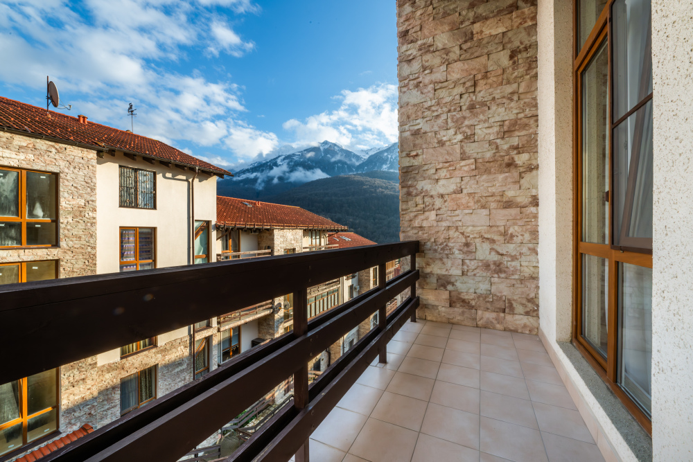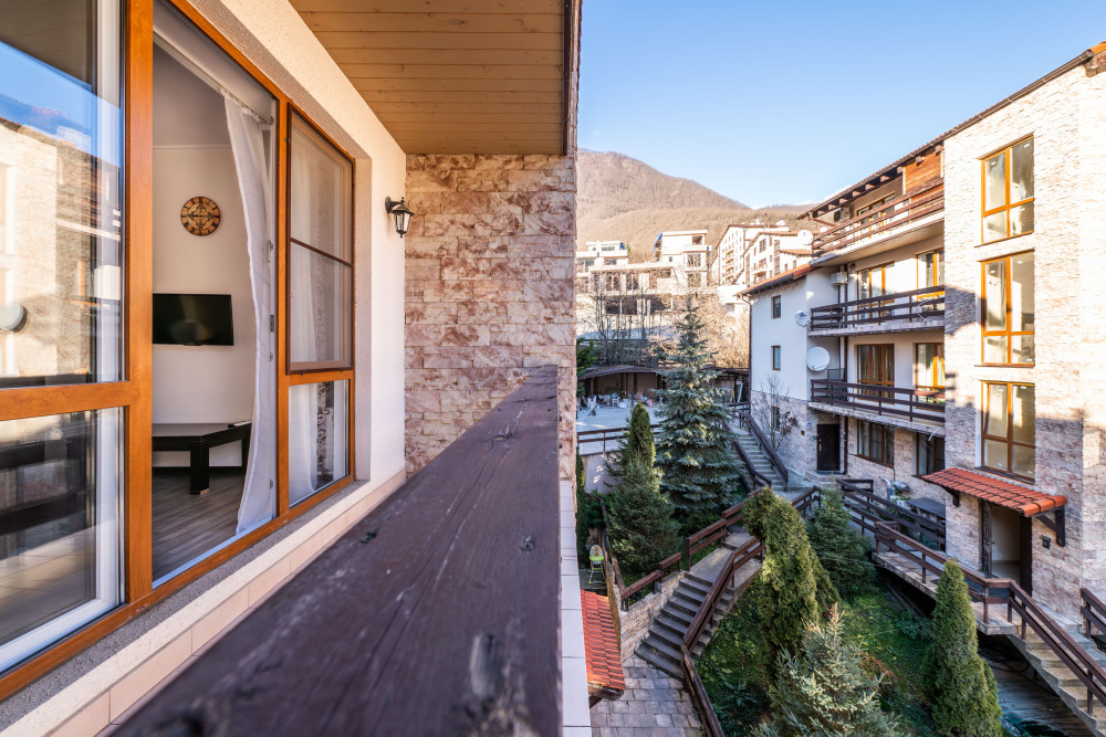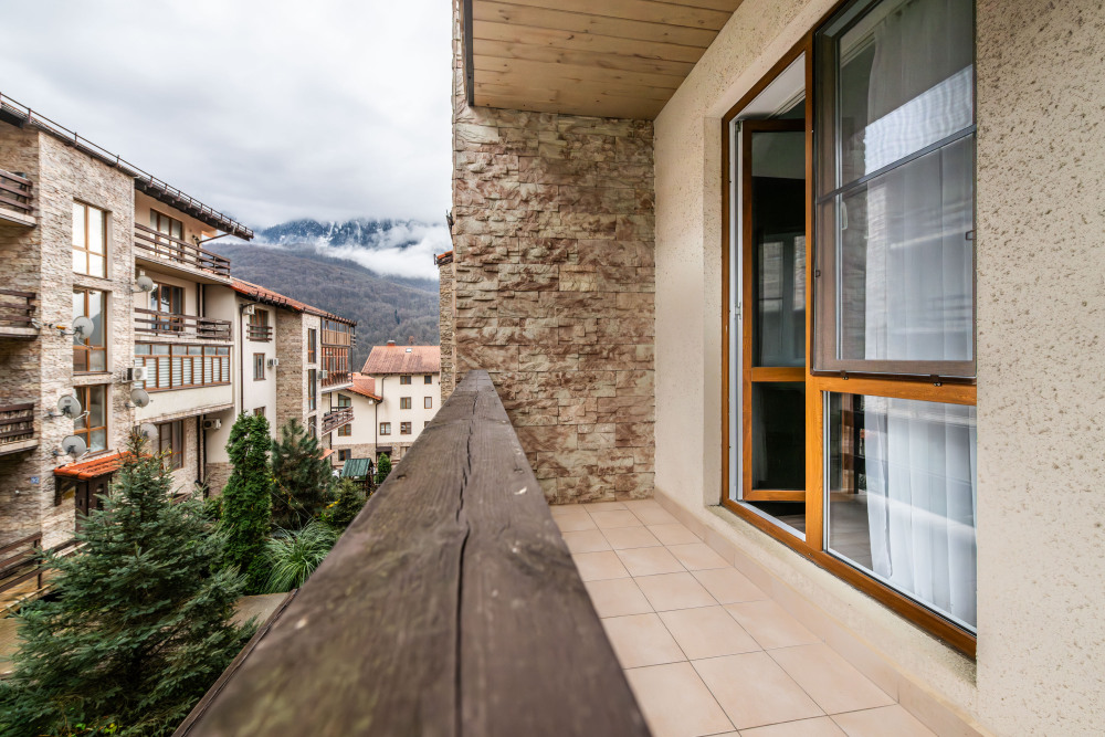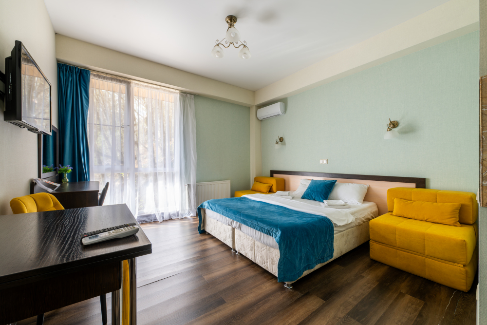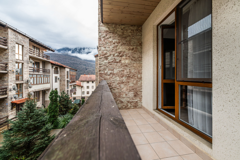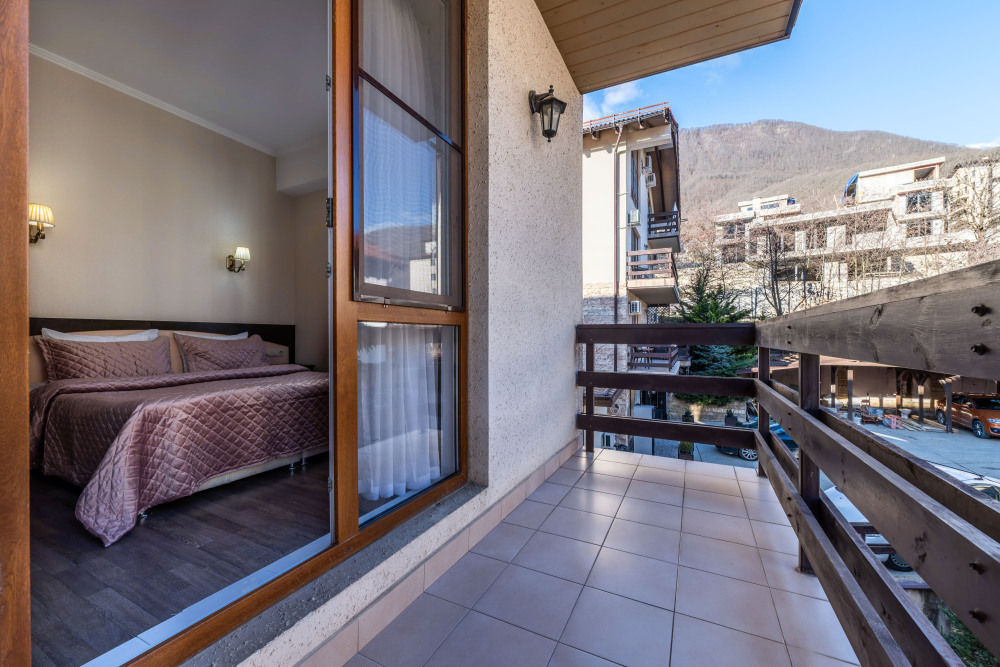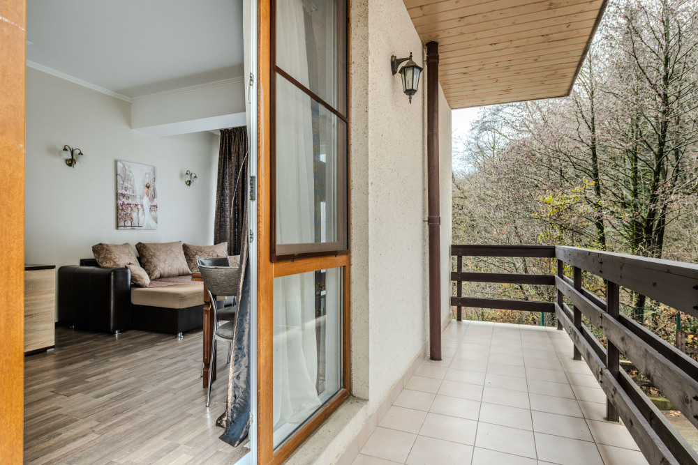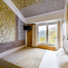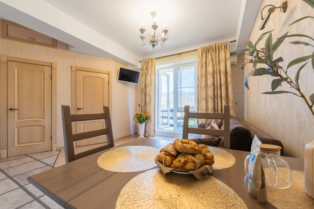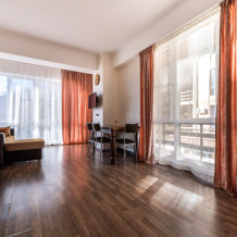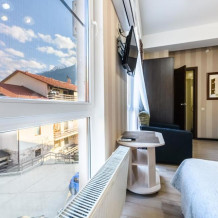 Улучшенная Студия с балконом 25м2, уютно устроилась на небольшой возвышенности, гости имеют возможность охватить взглядом сказочно красивые горные цепи. Комната оборудованы всеми удобствами. Есть холодильник, микроволновка, электрический чайник, обеденная группа. Предусмотрена мини кухня с необходимым инвентарем и оборудованием для приготовления блюд. В Студии установлена большая кровать, доп место футон, телевизор, письменный стол. Санузел с душем или ванной. Приятно выйти утром на балкон, залитый солнцем, и насладиться поистине впечатляющими природными пейзажами.