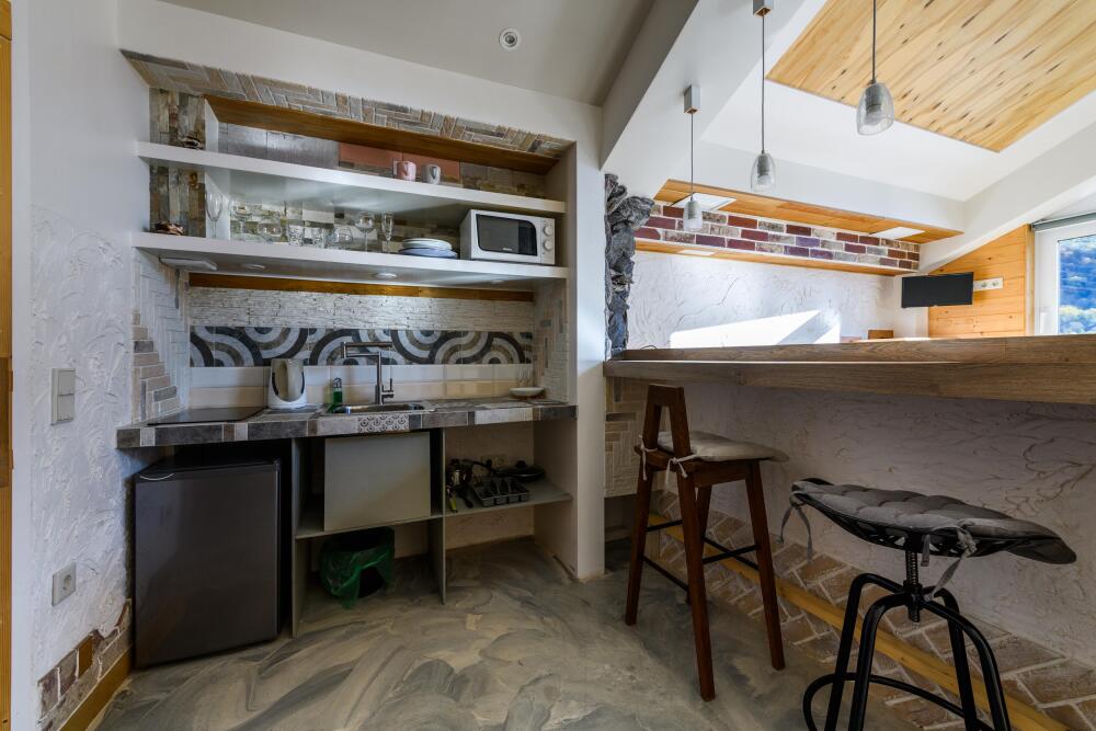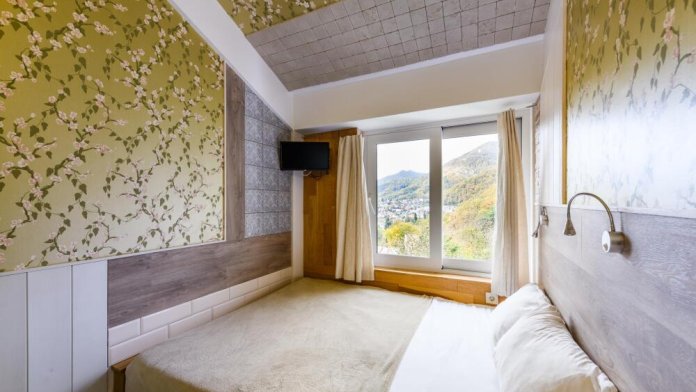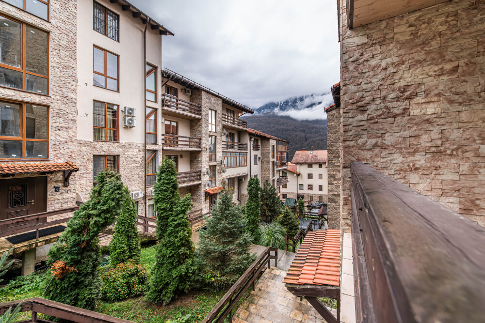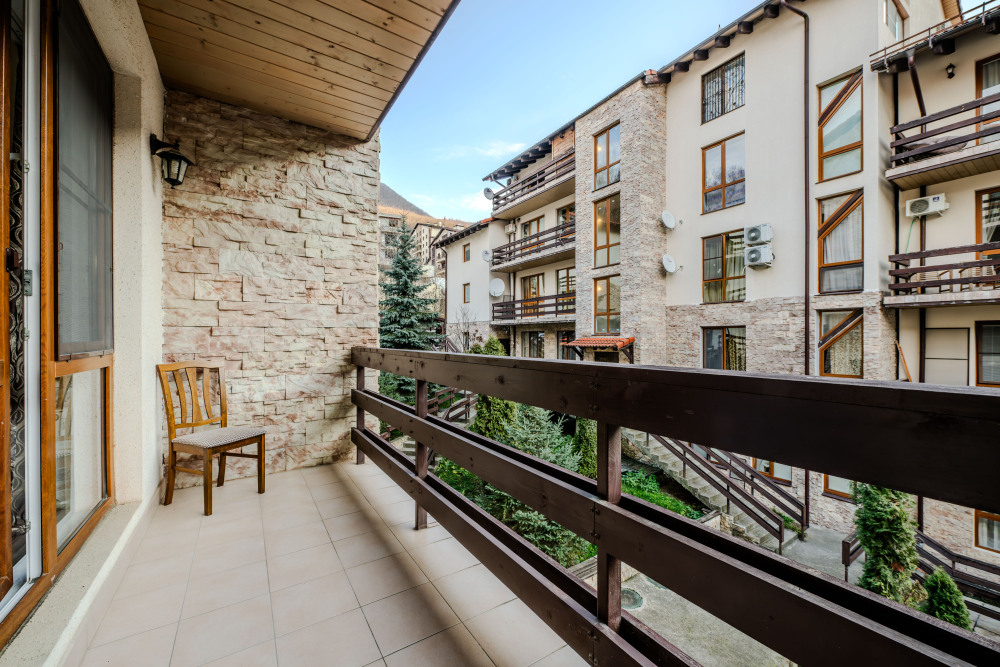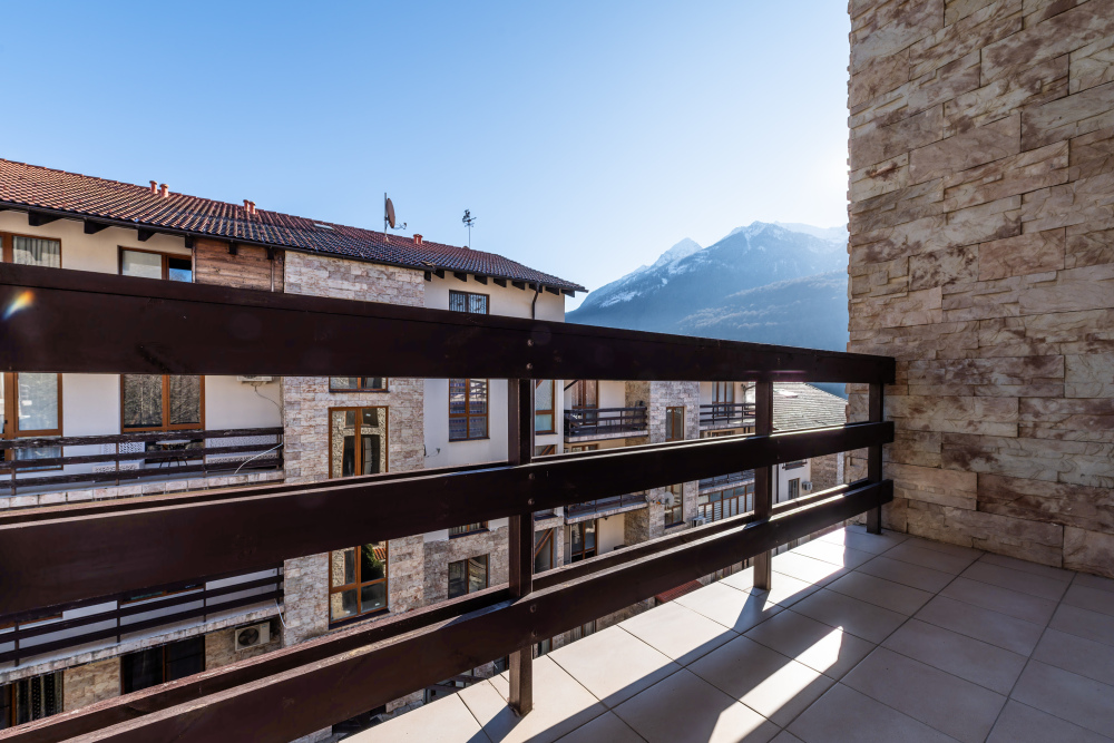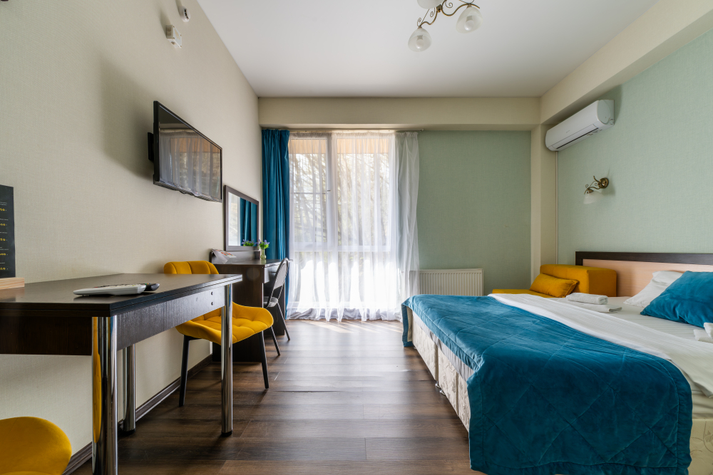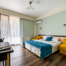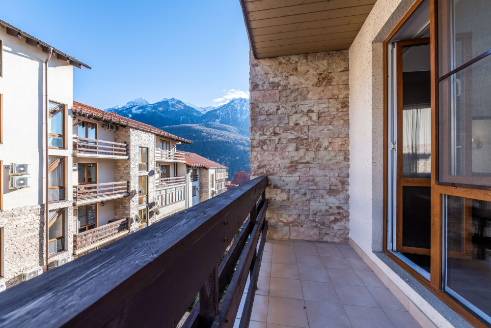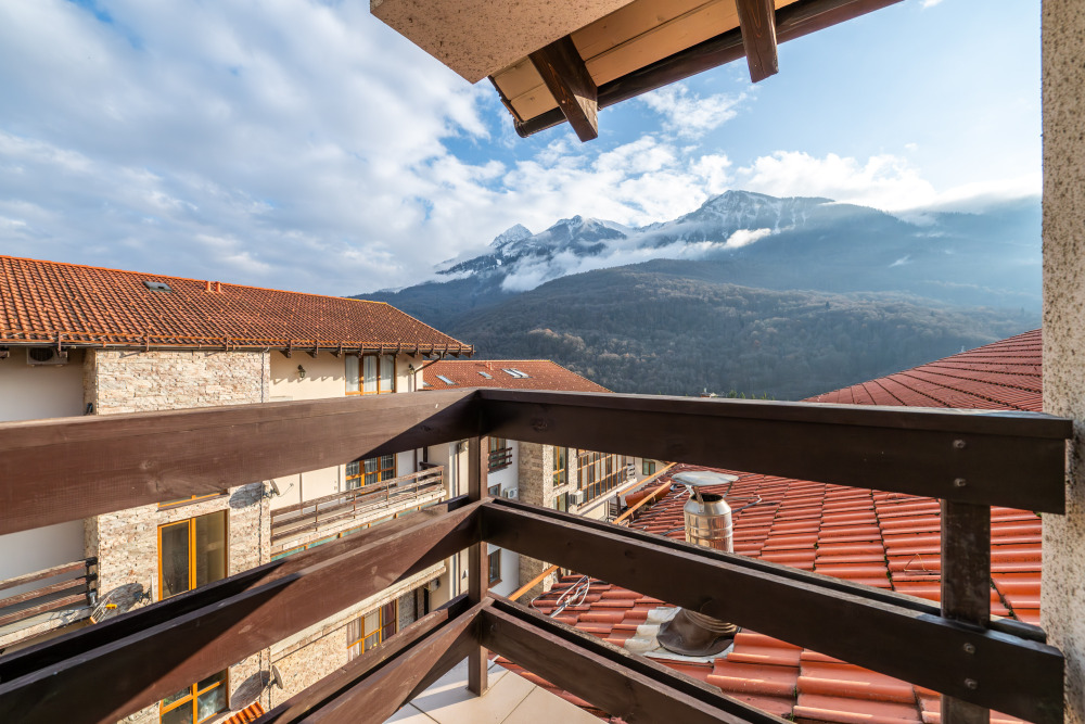 Улучшенная Студия с балконом 25м2, уютно устроилась на небольшой возвышенности, гости имеют возможность охватить взглядом сказочно красивые горные цепи. Комната оборудованы всеми удобствами. Есть холодильник, микроволновка, электрический чайник, обеденная группа. Предусмотрена мини кухня с необходимым инвентарем и оборудованием для приготовления блюд. В Студии установлена большая кровать, доп место футон, телевизор, письменный стол. Санузел с душем или ванной. Приятно выйти утром на балкон, залитый солнцем, и насладиться поистине впечатляющими природными пейзажами.