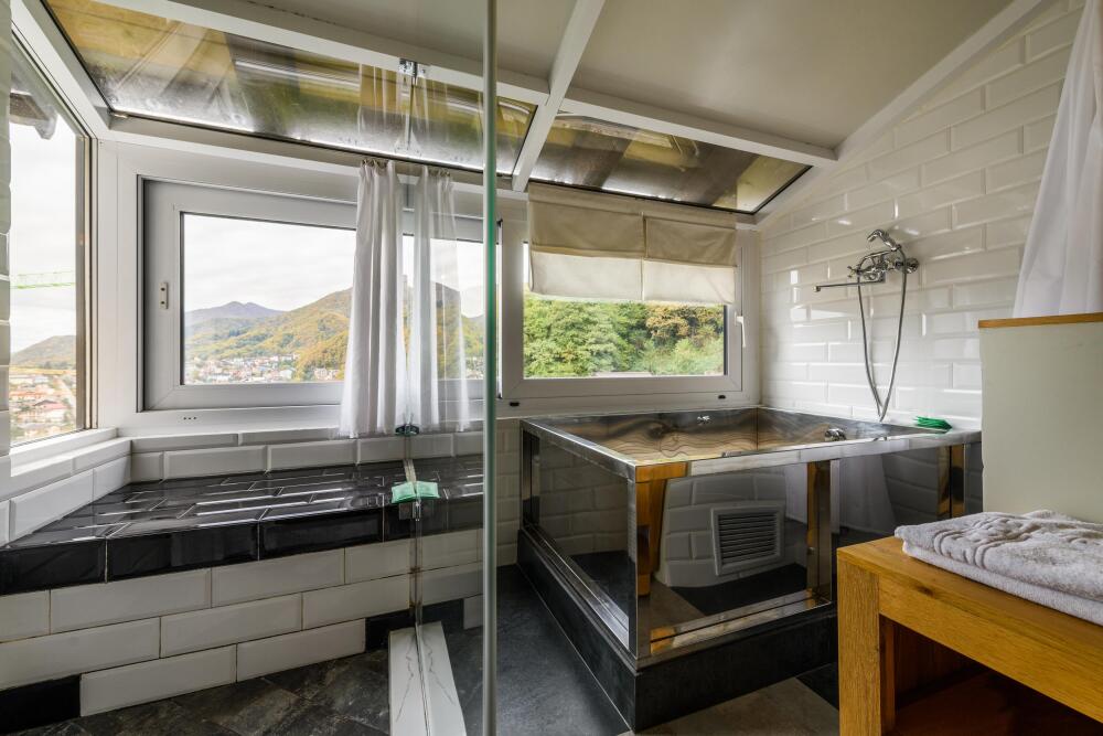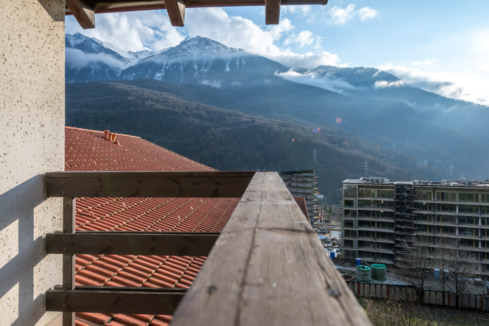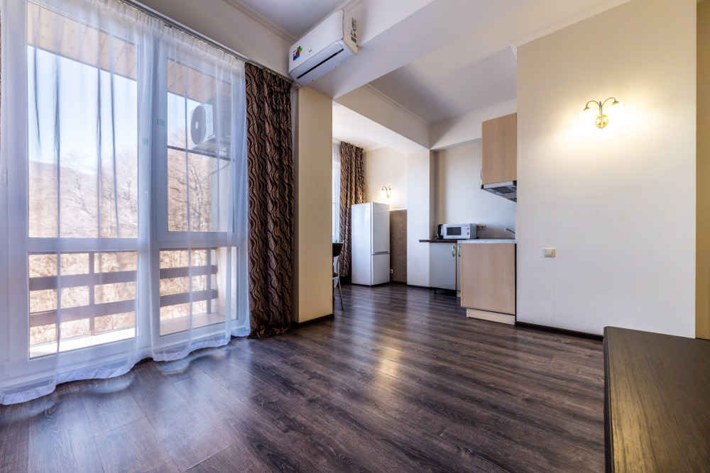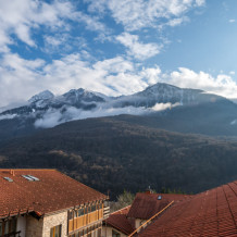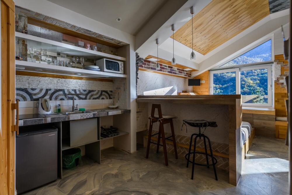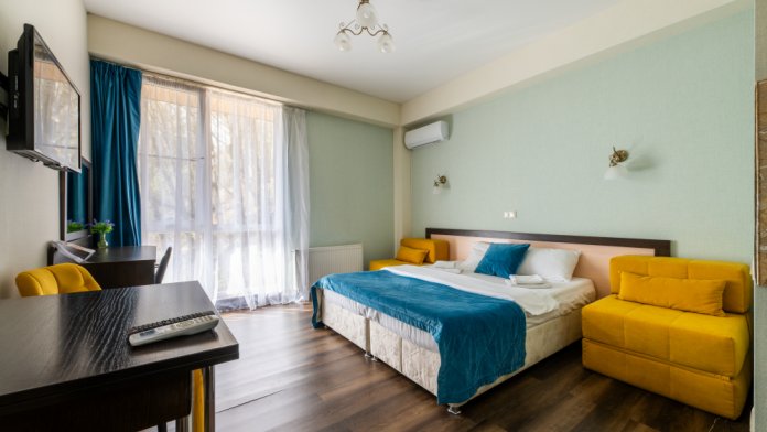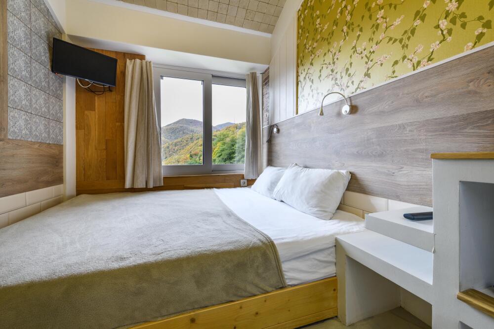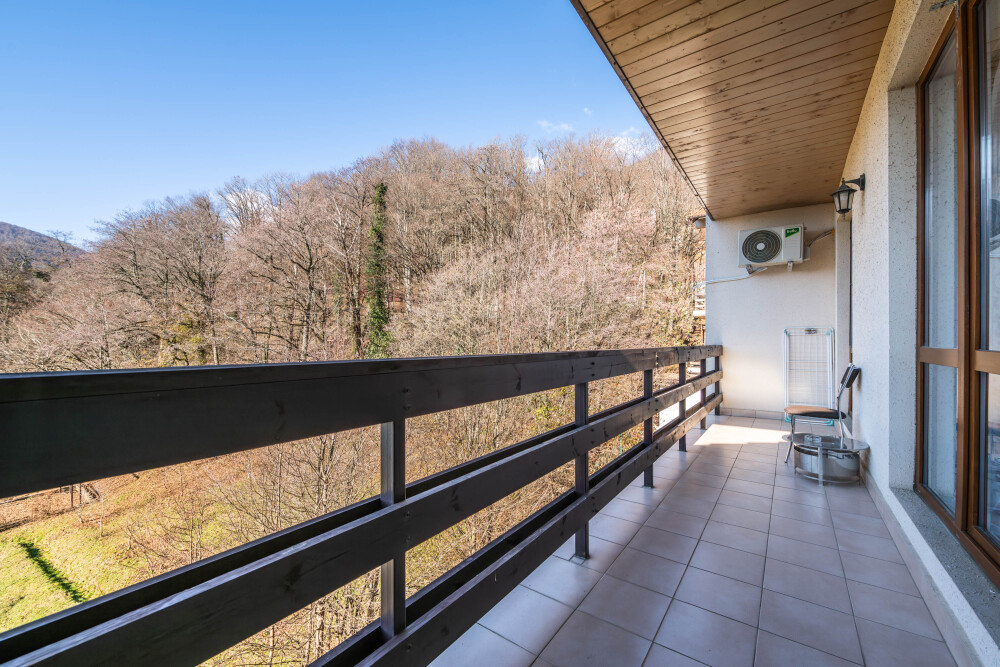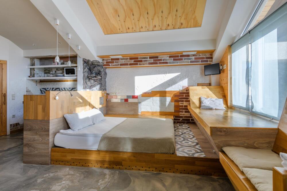 Улучшенная Студия с балконом 25м2, уютно устроилась на небольшой возвышенности, гости имеют возможность охватить взглядом сказочно красивые горные цепи. Комната оборудованы всеми удобствами. Есть холодильник, микроволновка, электрический чайник, обеденная группа. Предусмотрена мини кухня с необходимым инвентарем и оборудованием для приготовления блюд. В Студии установлена большая кровать, доп место футон, телевизор, письменный стол. Санузел с душем или ванной. Приятно выйти утром на балкон, залитый солнцем, и насладиться поистине впечатляющими природными пейзажами.
