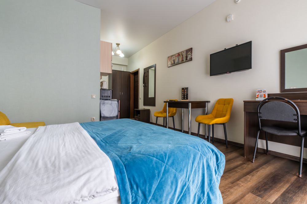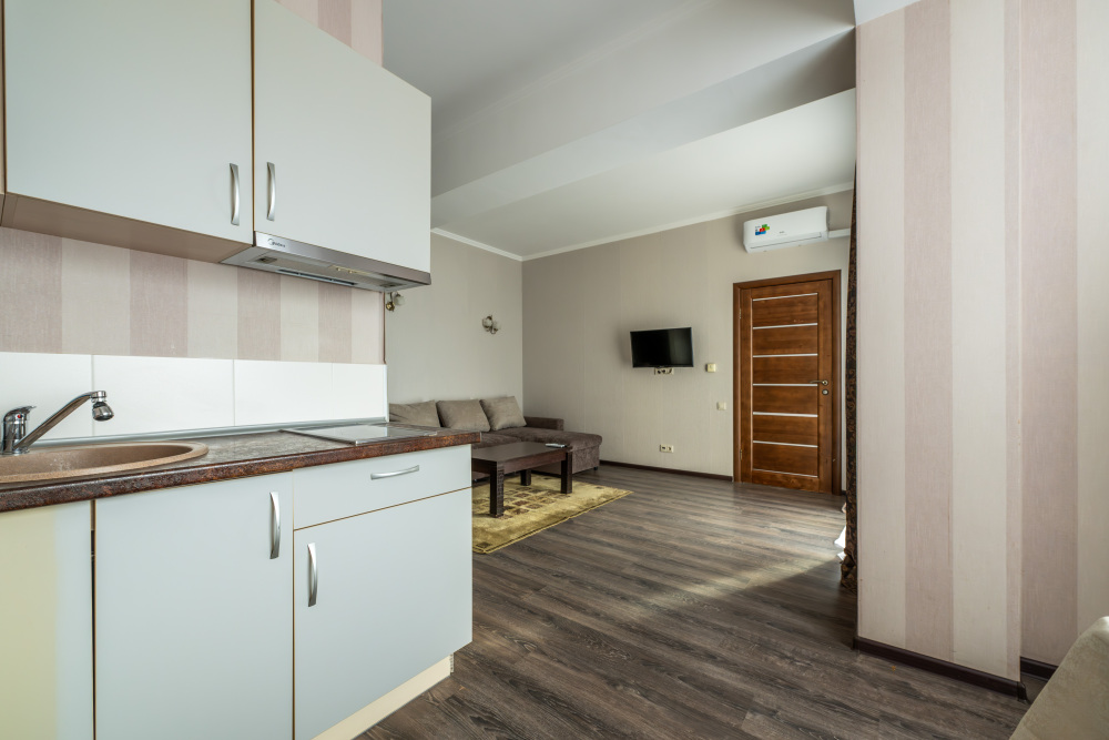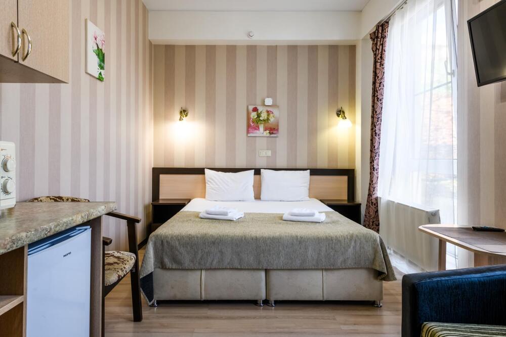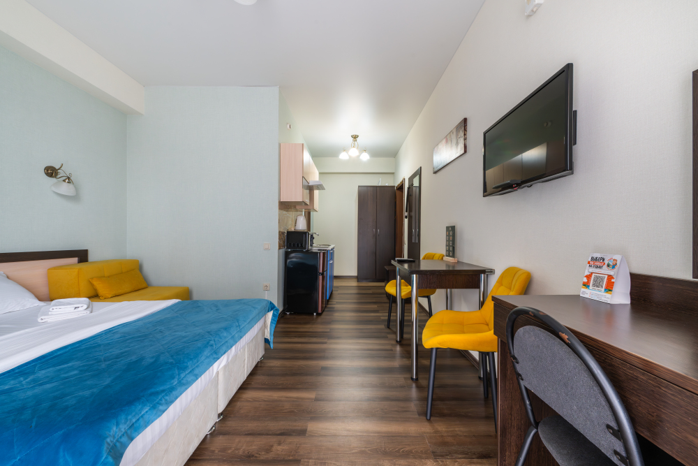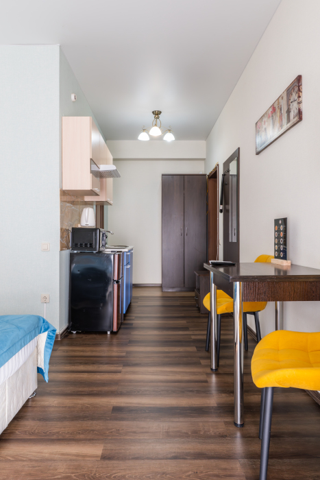 Студия Делюкс, 21 м2 оснащена всей нужной мебелью и техникой: полноценная мини-кухня с плитой и посудой, холодильник.