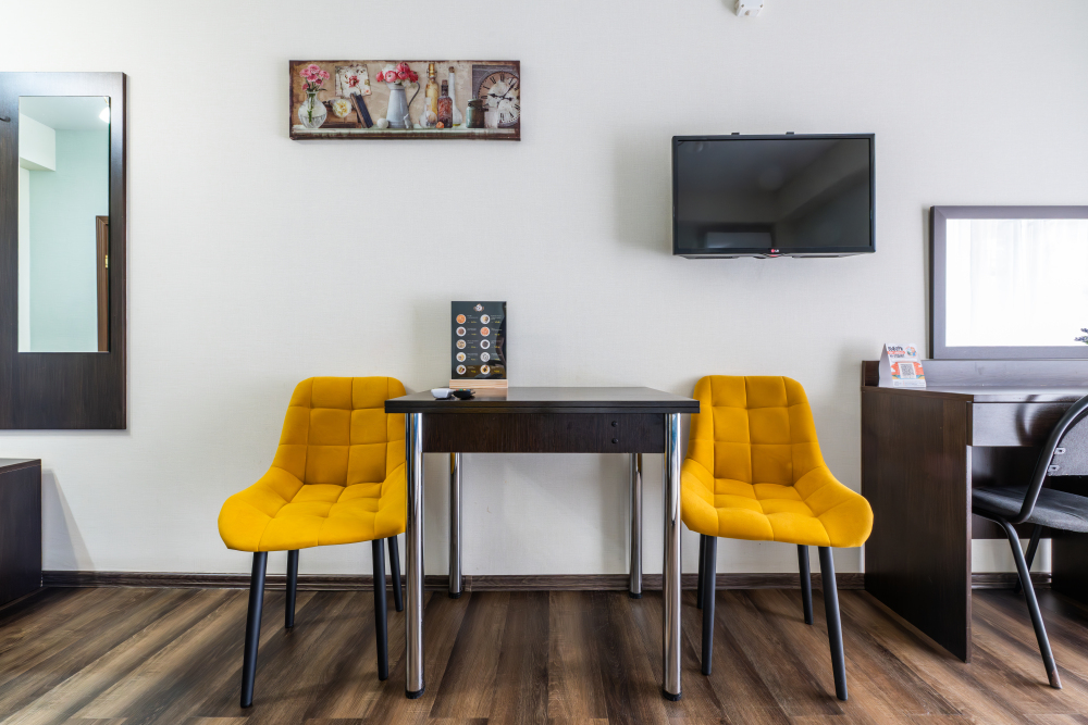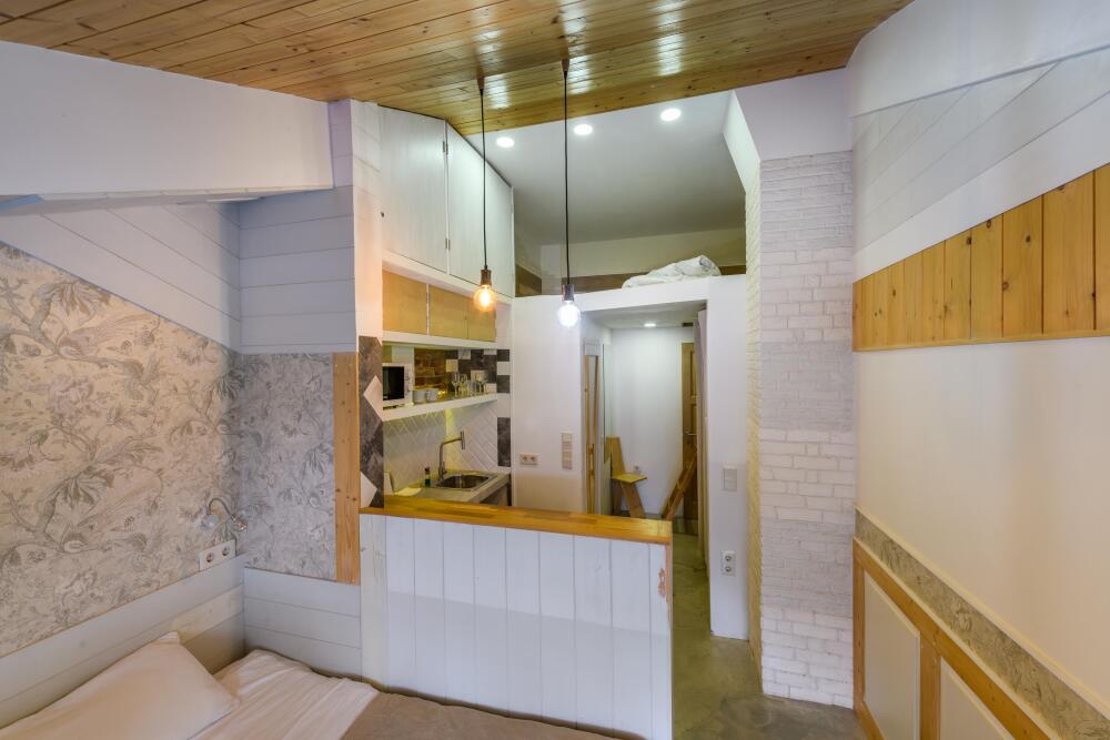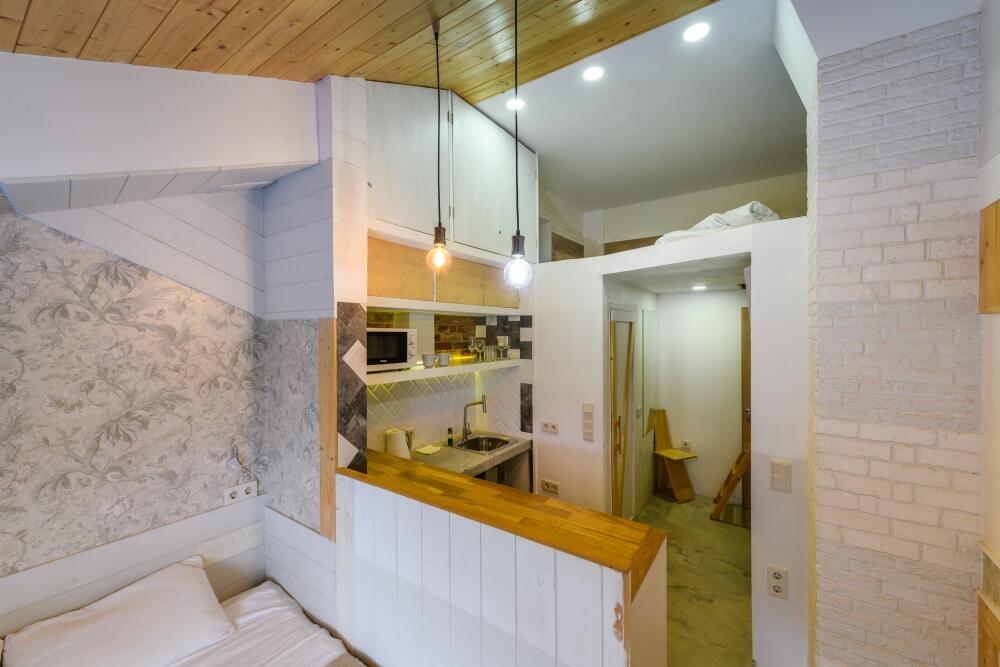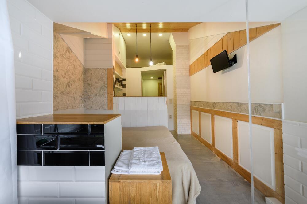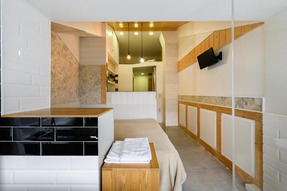 Студия Делюкс, 21 м2 оснащена всей нужной мебелью и техникой: полноценная мини-кухня с плитой и посудой, холодильник.