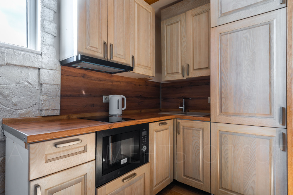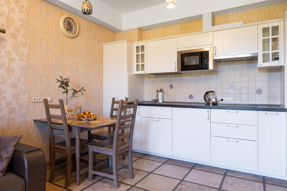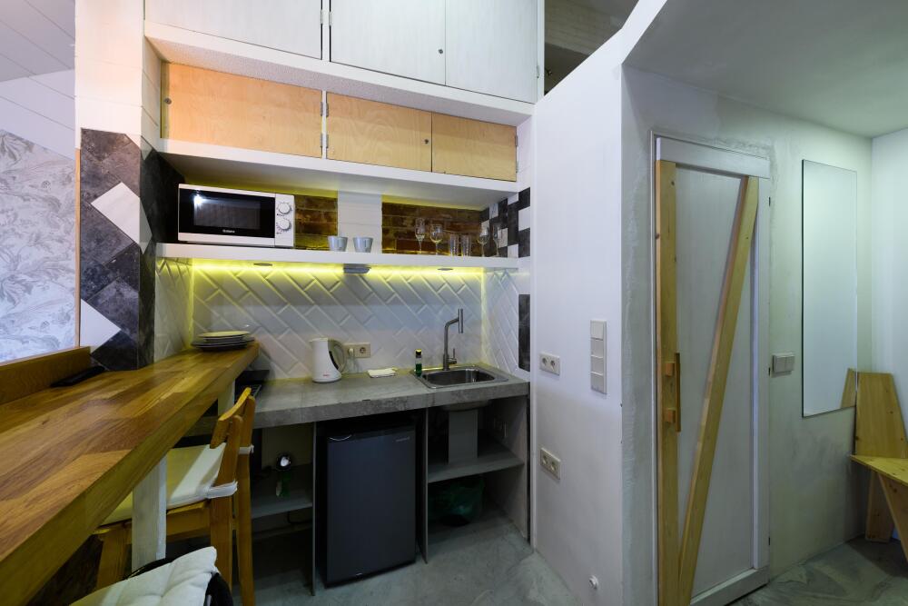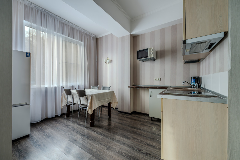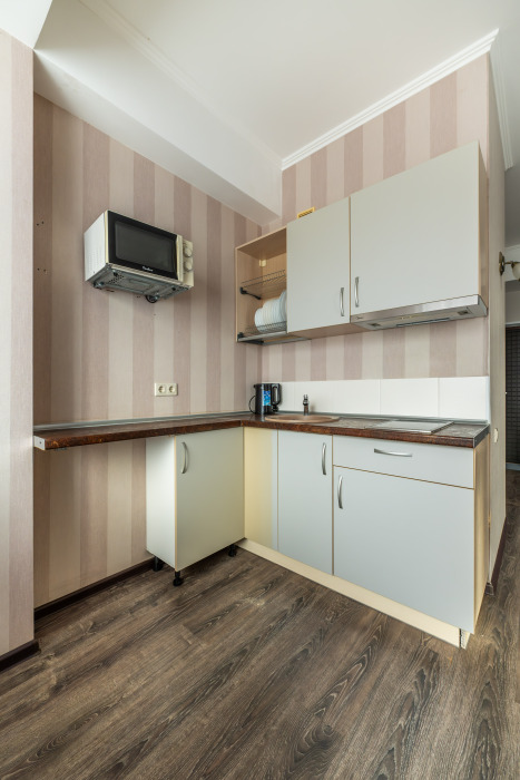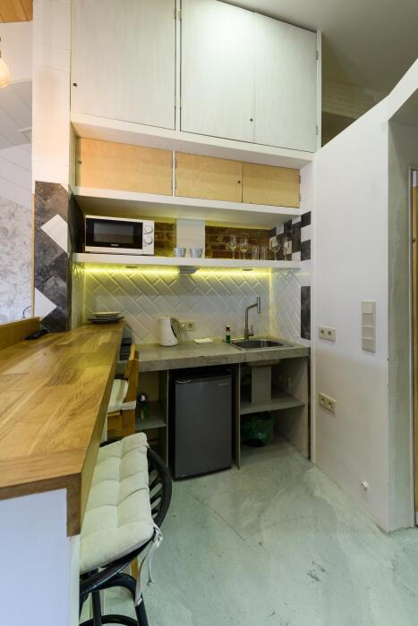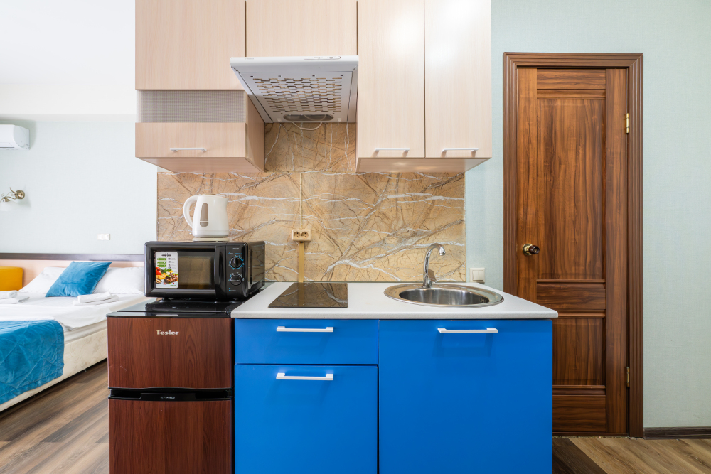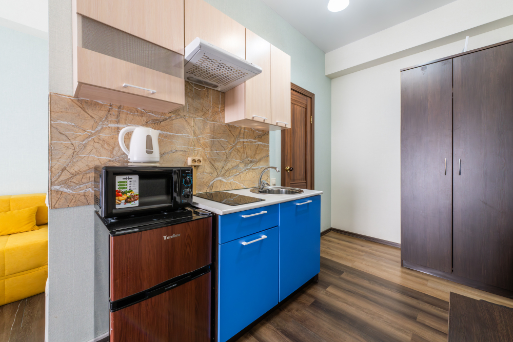 • Компактная кухня: плита, холодильник, микроволновка, чайник