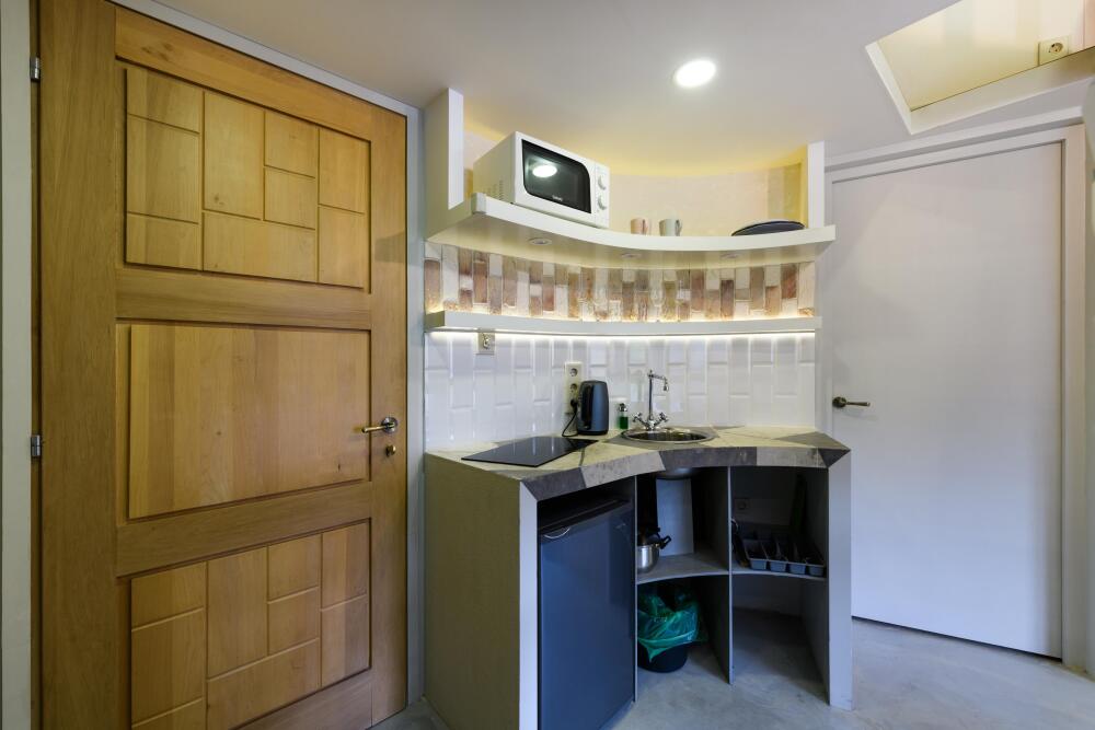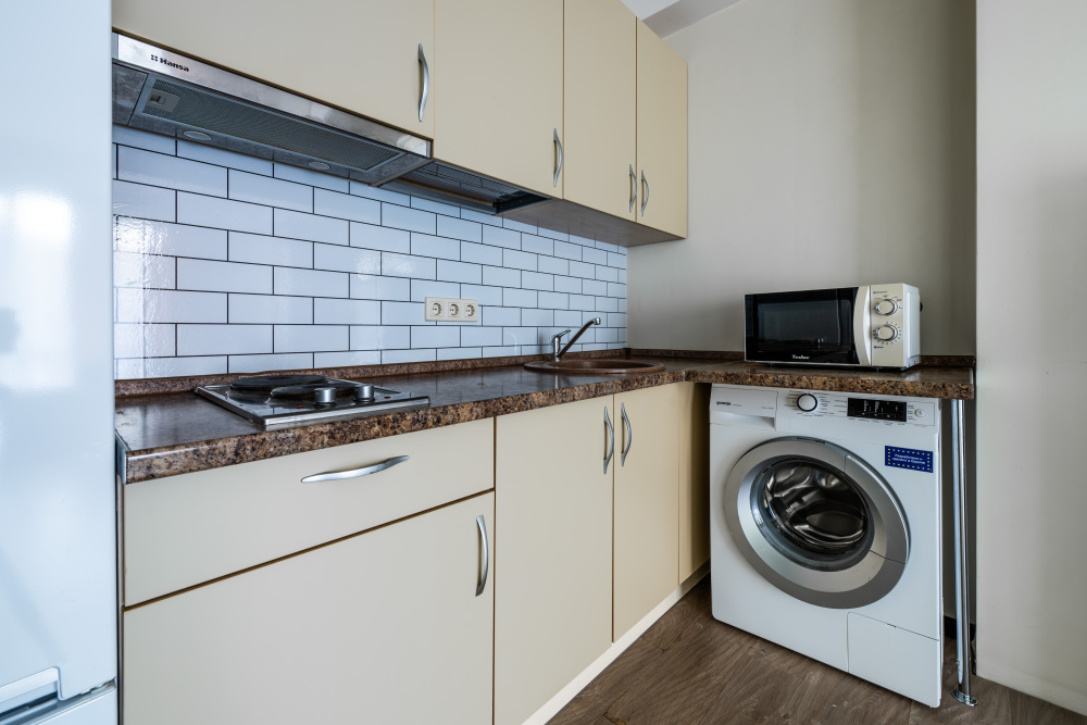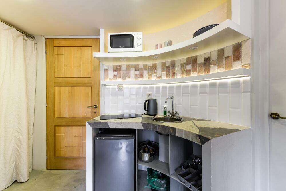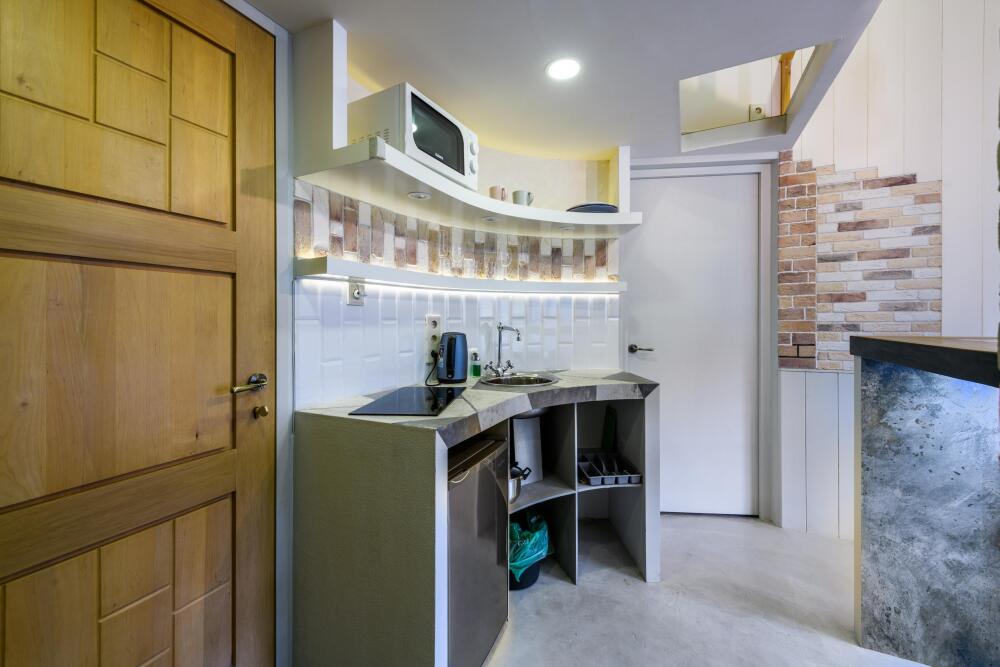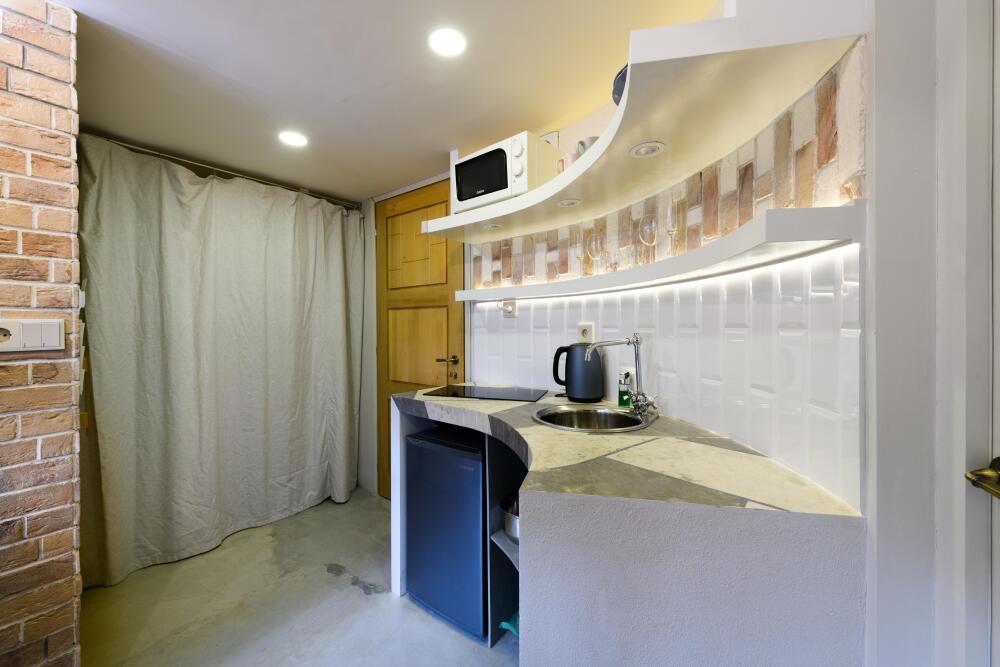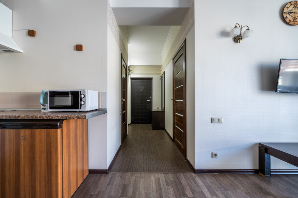 • Компактная кухня: плита, холодильник, микроволновка, чайник