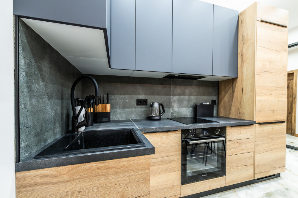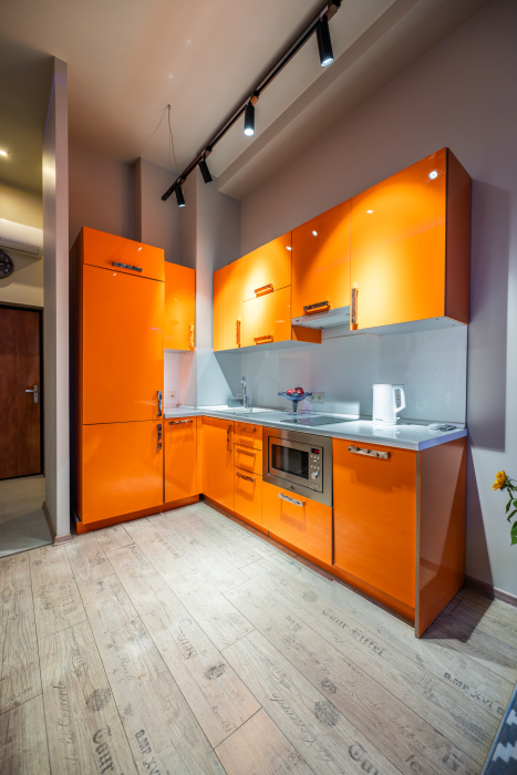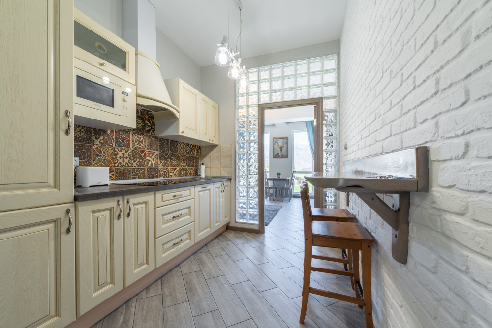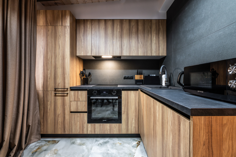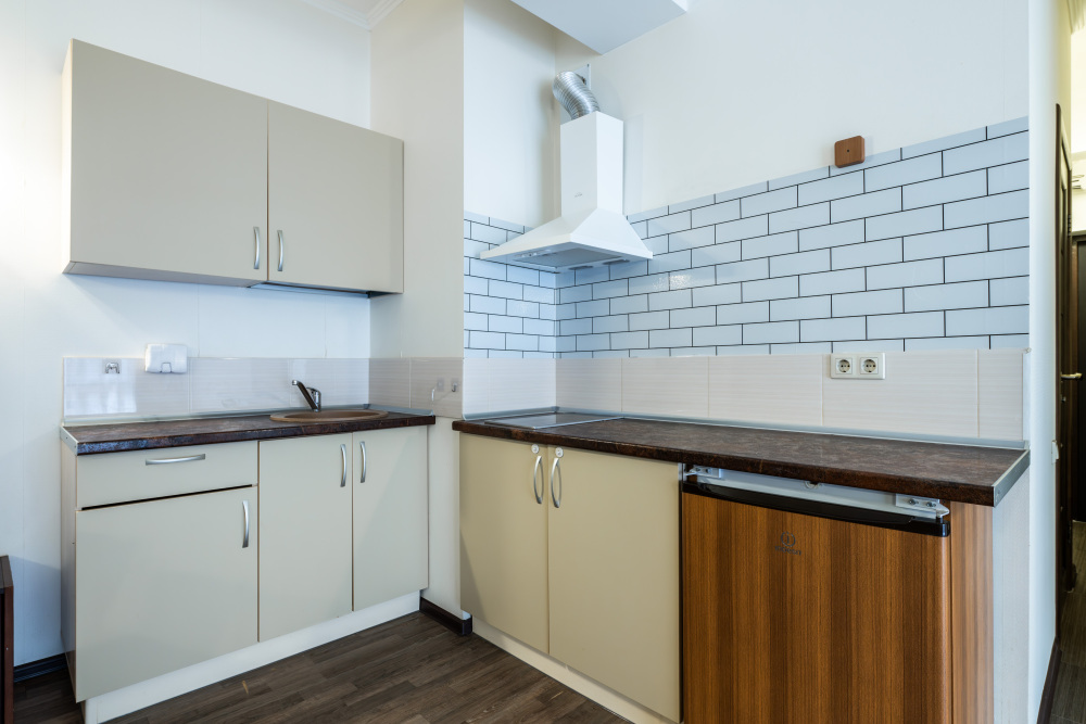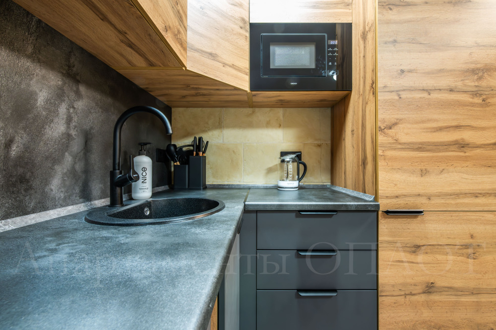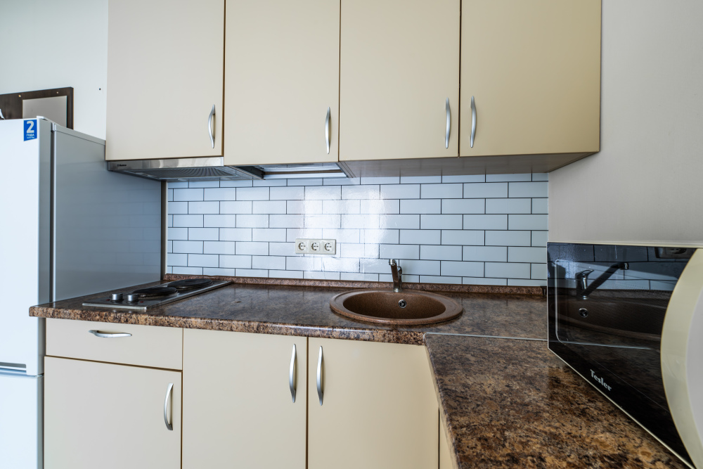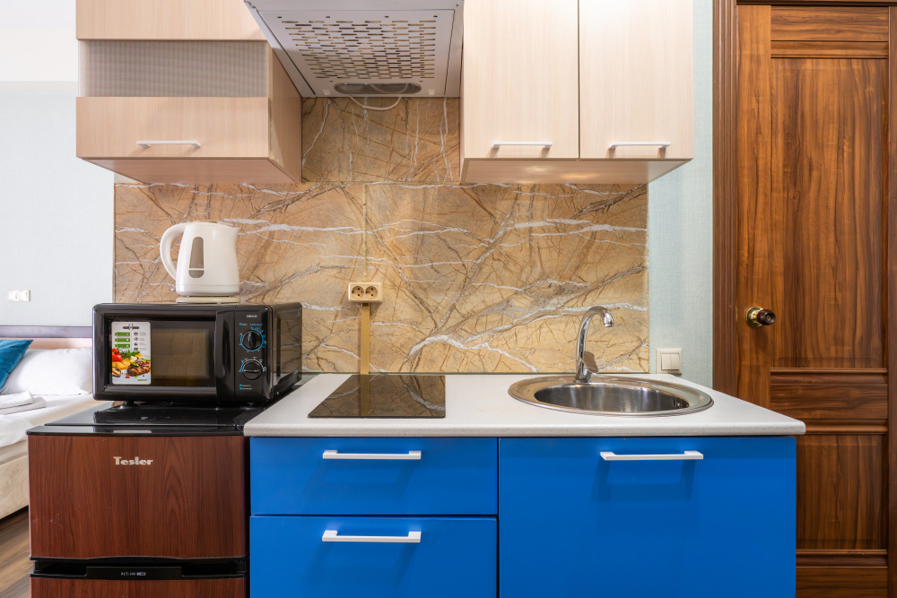 - Минималистичная кухня: плита, микроволновка, холодильник