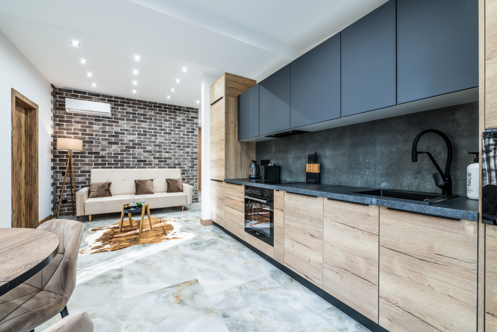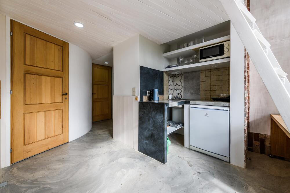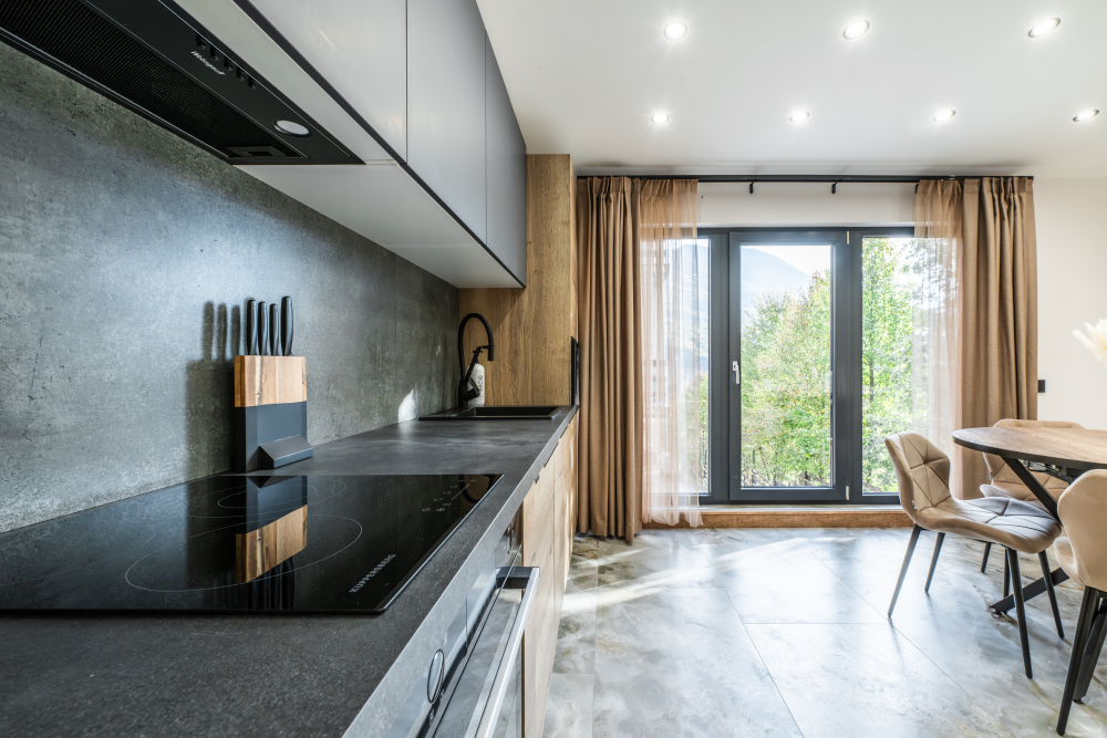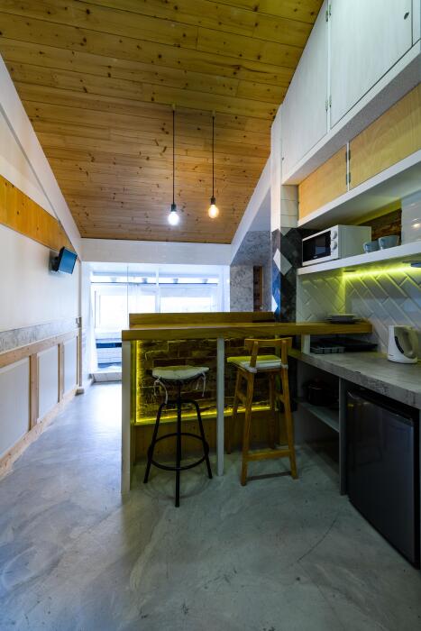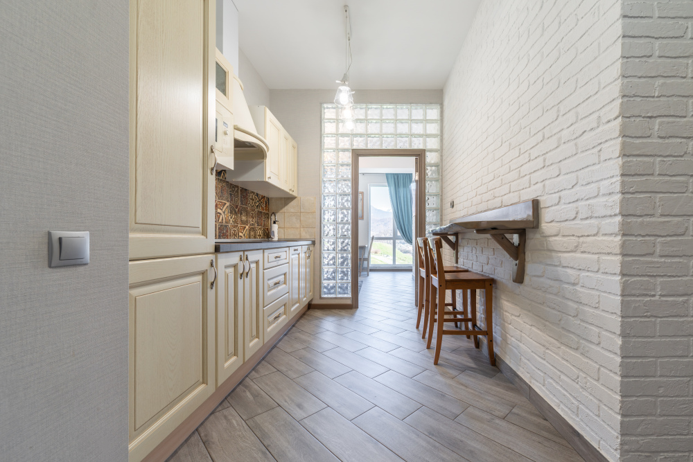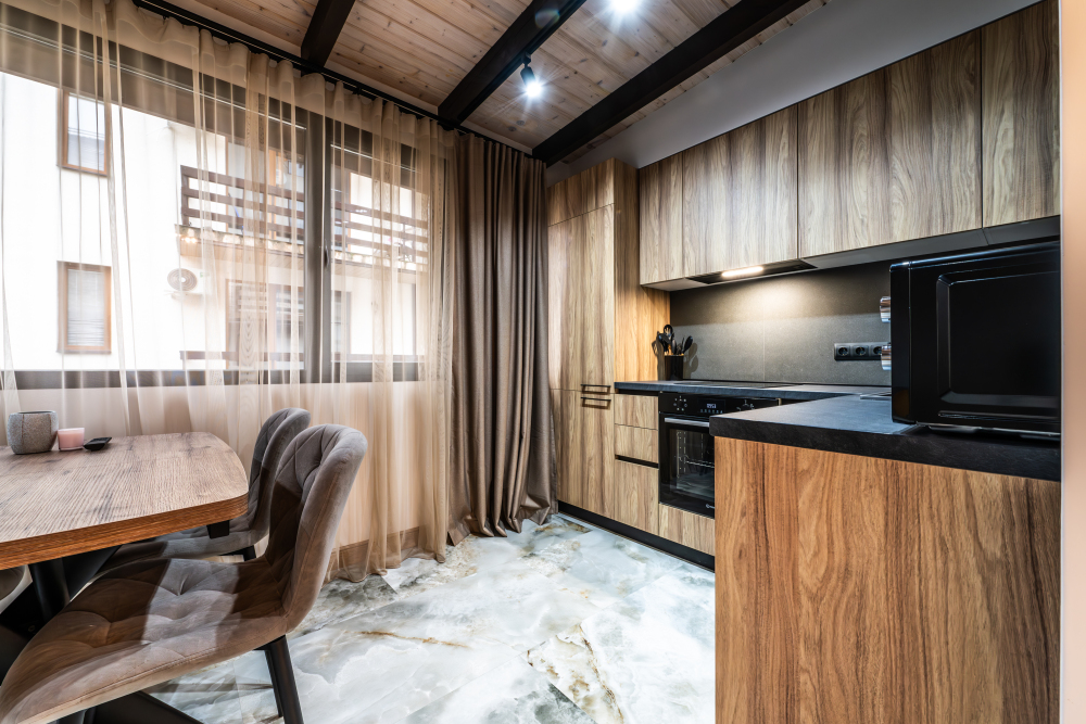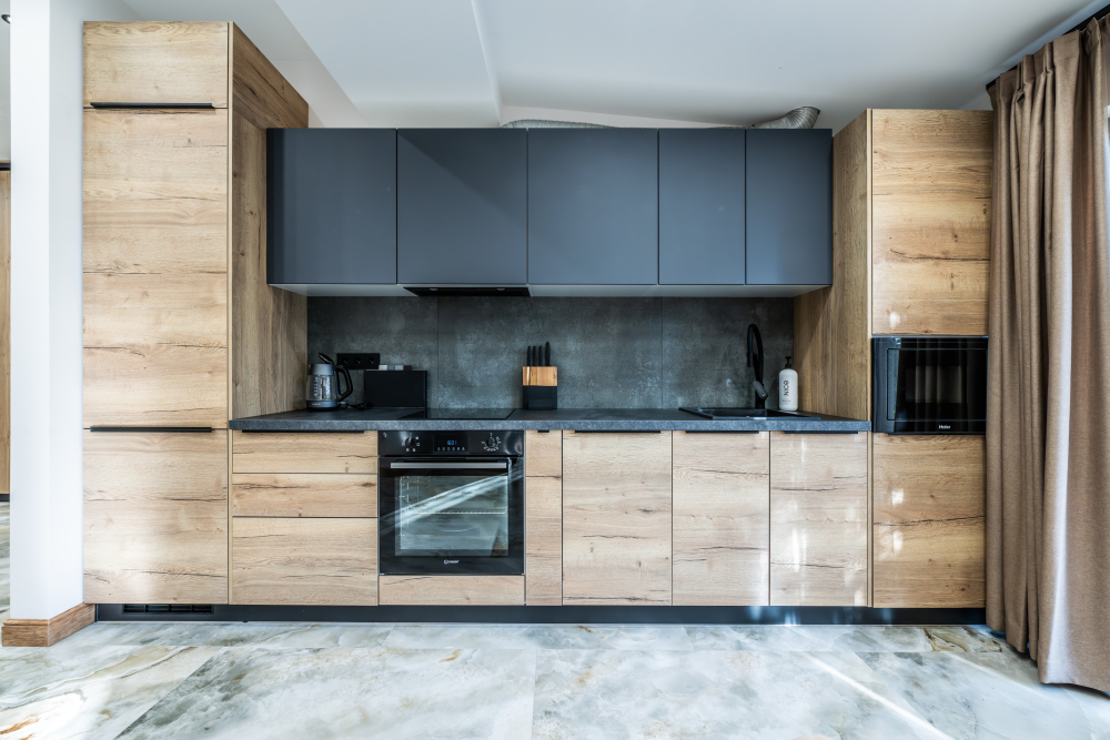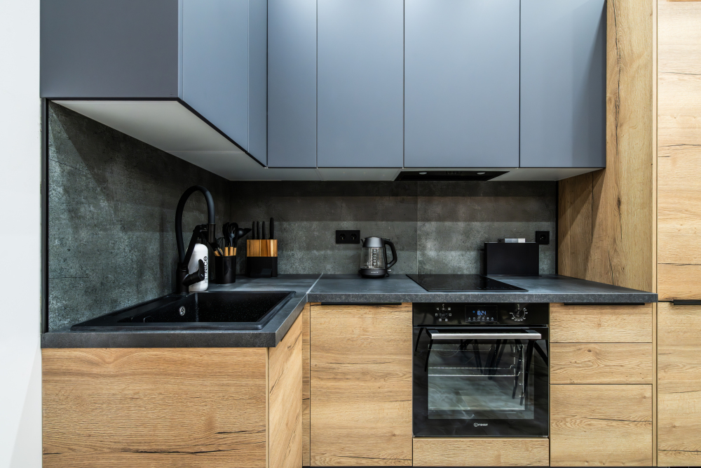 - Минималистичная кухня: плита, микроволновка, холодильник