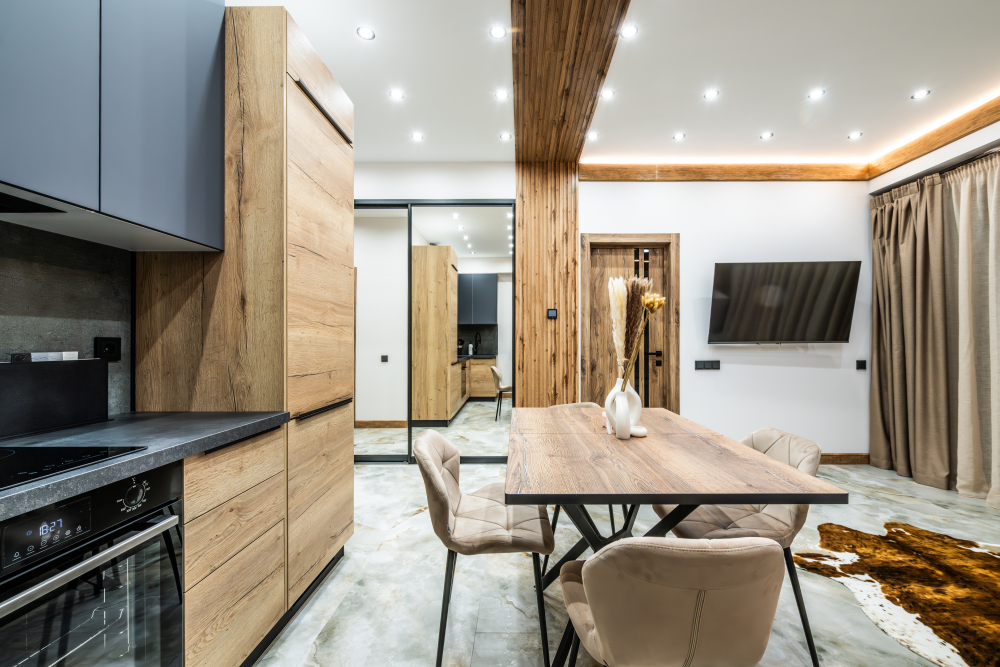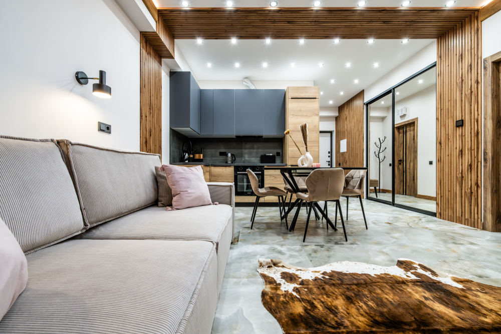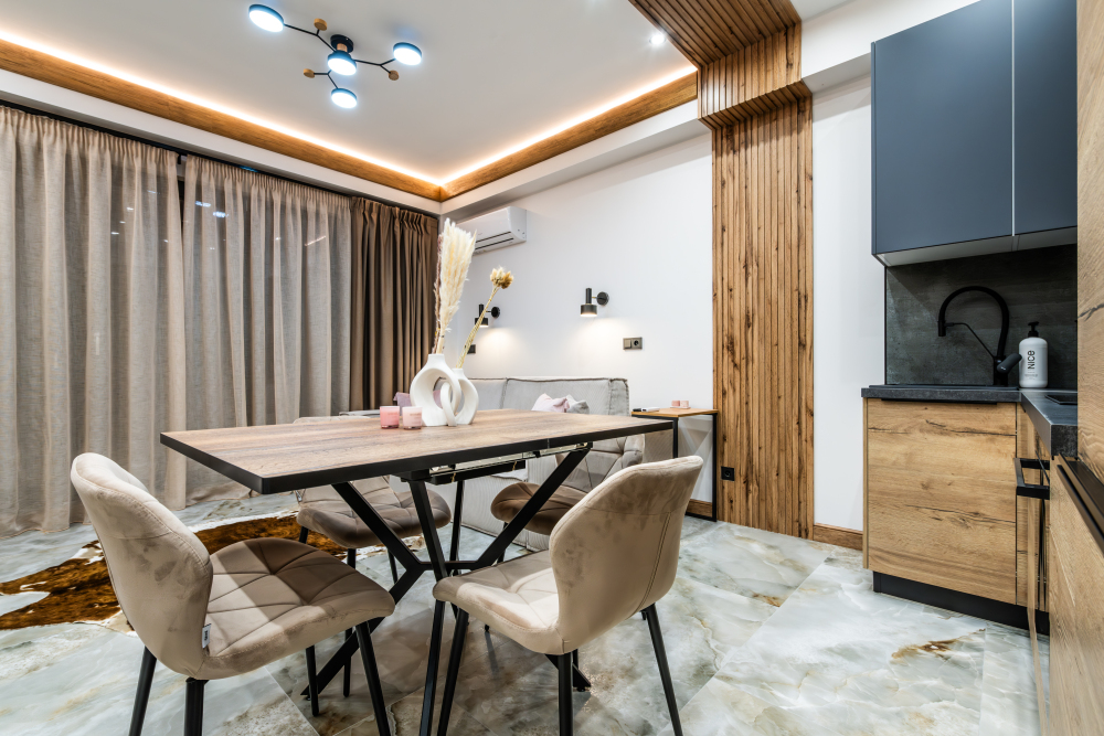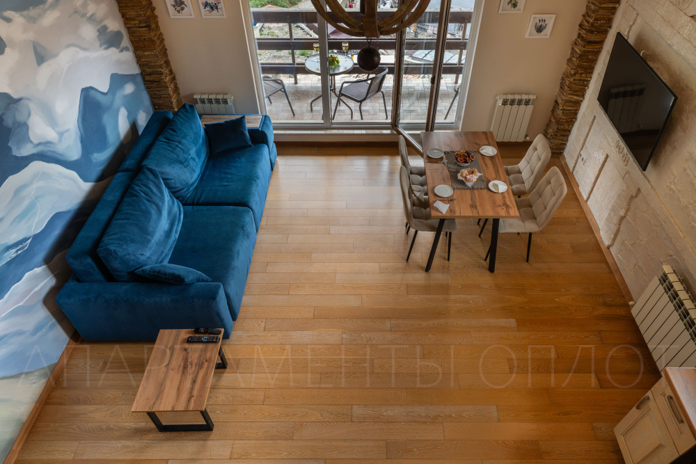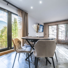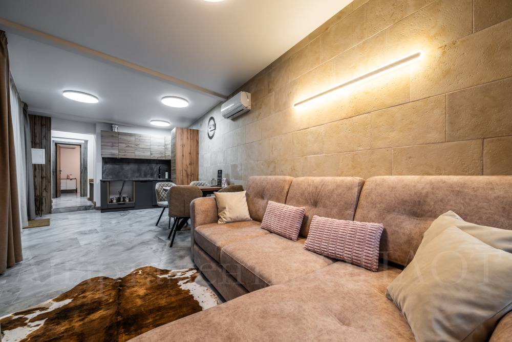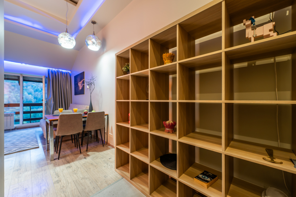 Дизайнерский интерьер подчеркивает это уникальное расположение квартиры - среди лесистых гор, человек ощущает своё единство с природой, находясь к современной квартире.