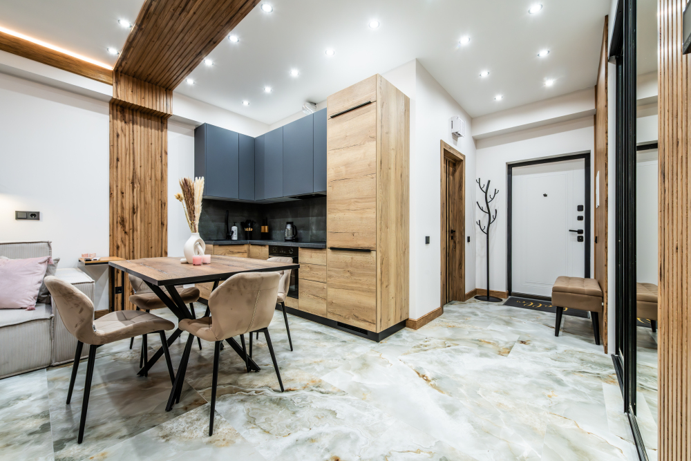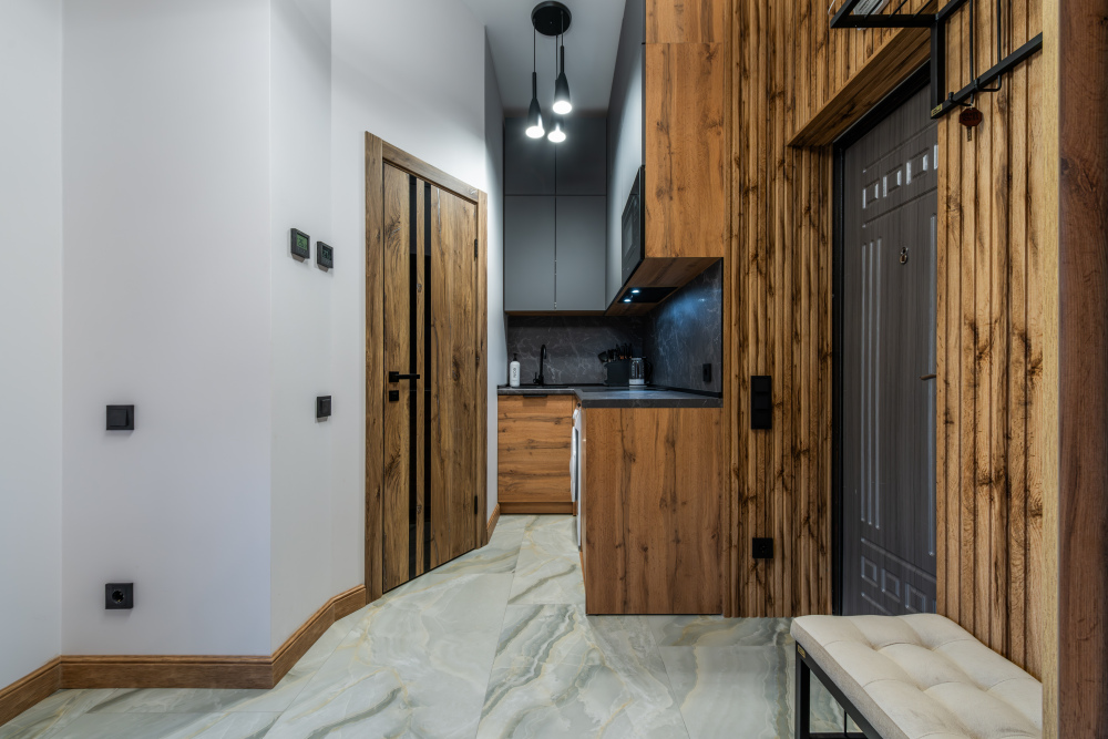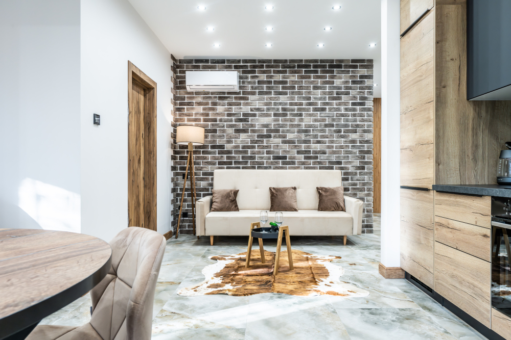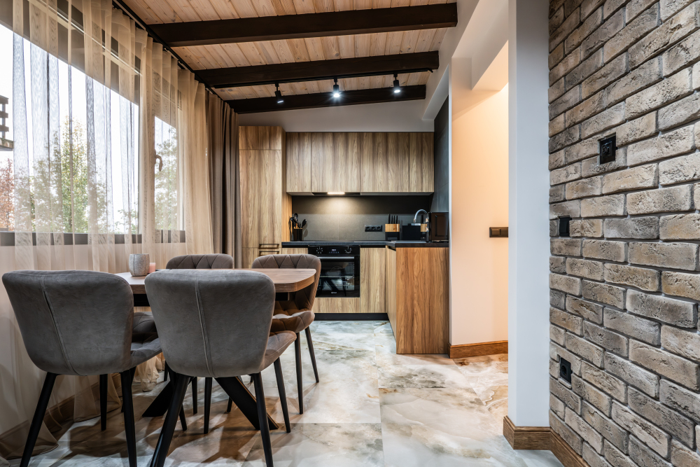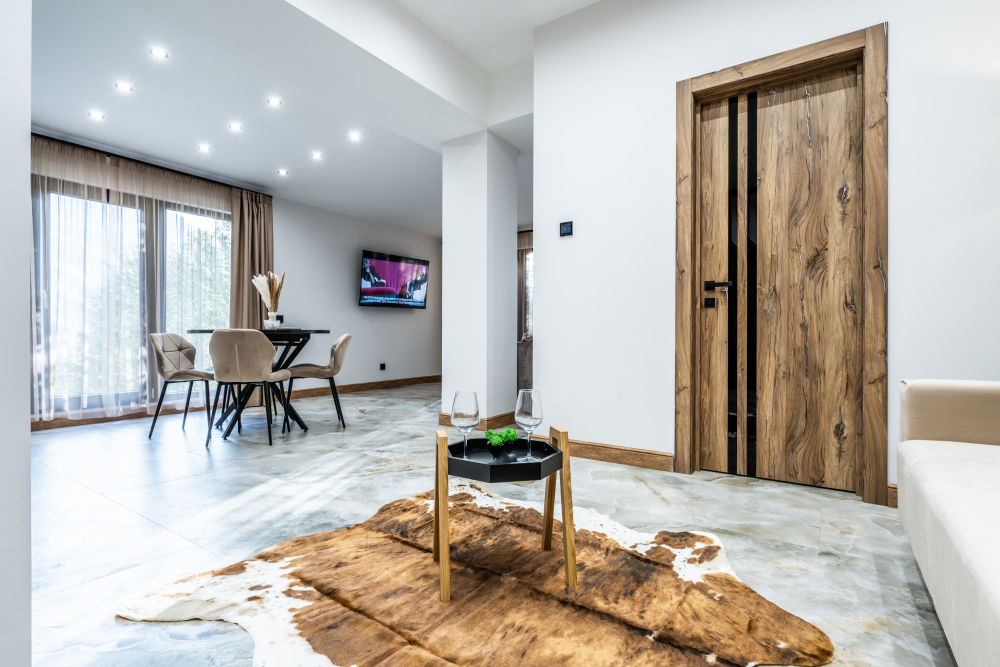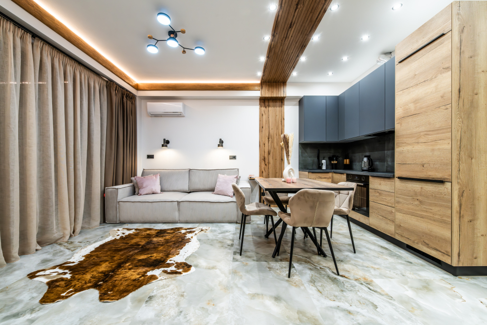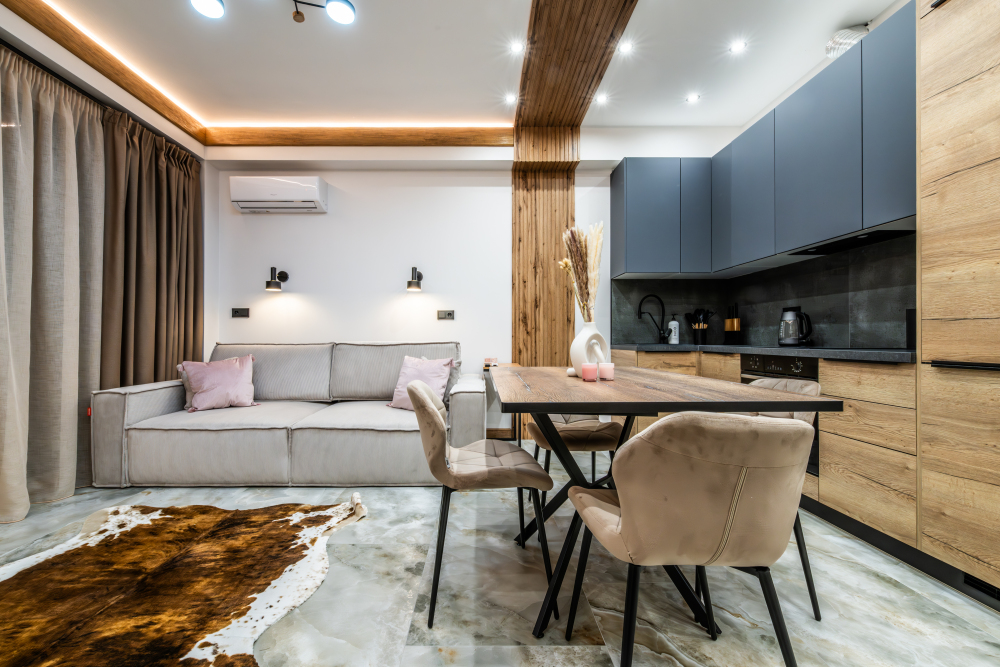 Дизайнерский интерьер подчеркивает это уникальное расположение квартиры - среди лесистых гор, человек ощущает своё единство с природой, находясь к современной квартире.