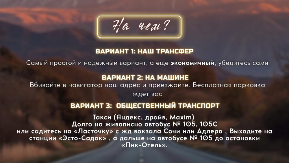 Организуем трансфер (аэропорт/вокзал – от 2000 руб, курорты Роза Хутор/Горки Город).