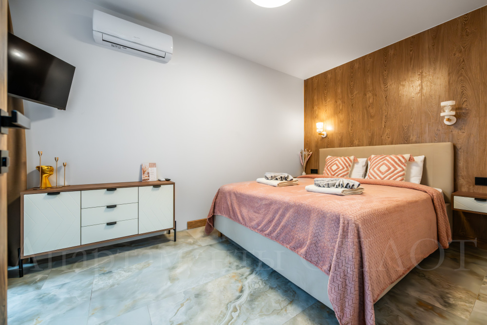 В спальне большая двуспальная кровать. В гостиной обеденная зона, раскладывающийся диван, собственная терраса.