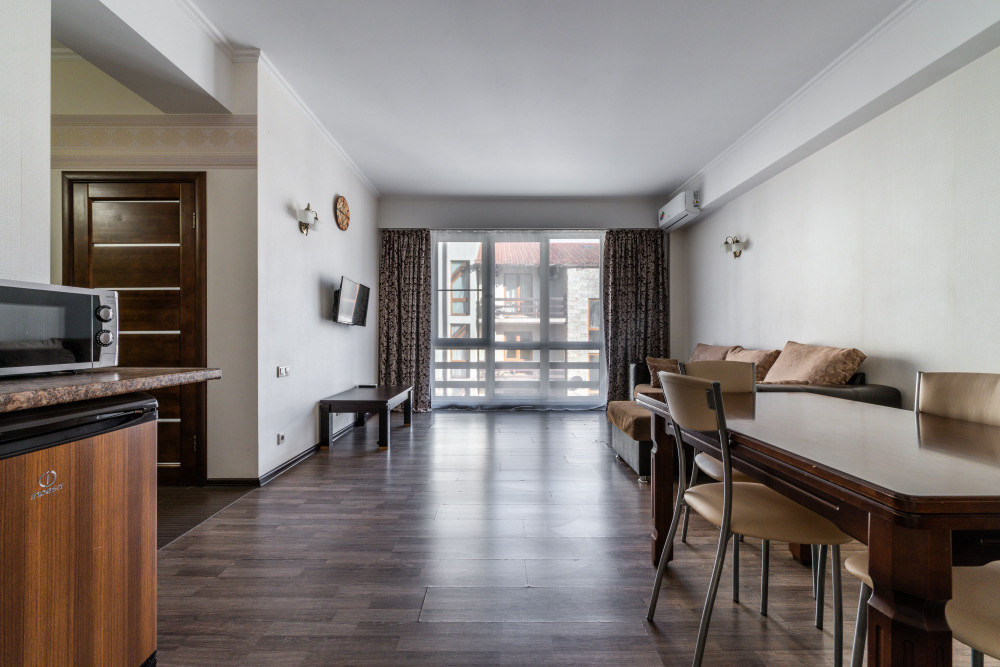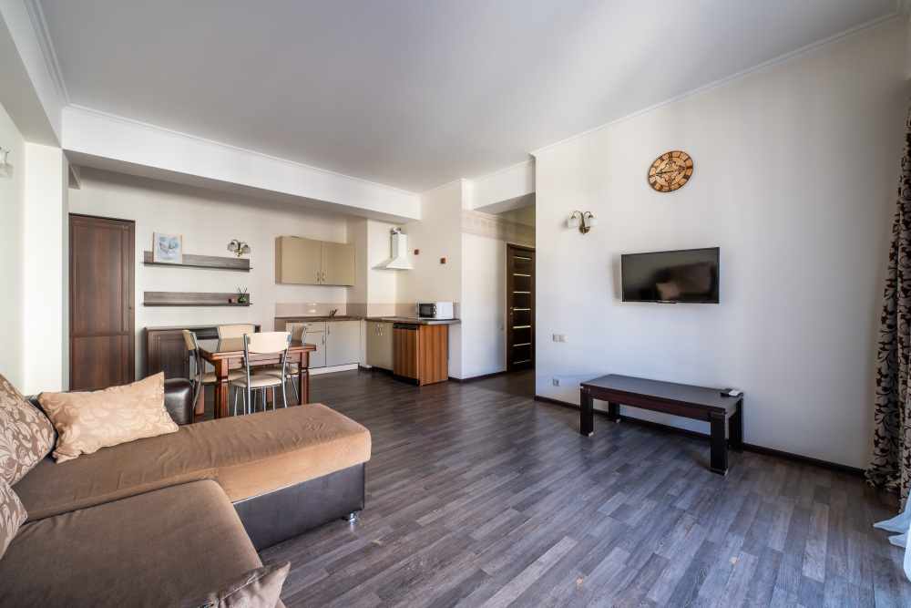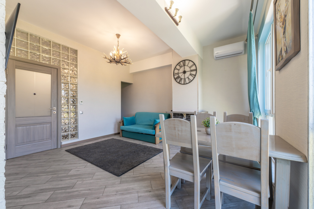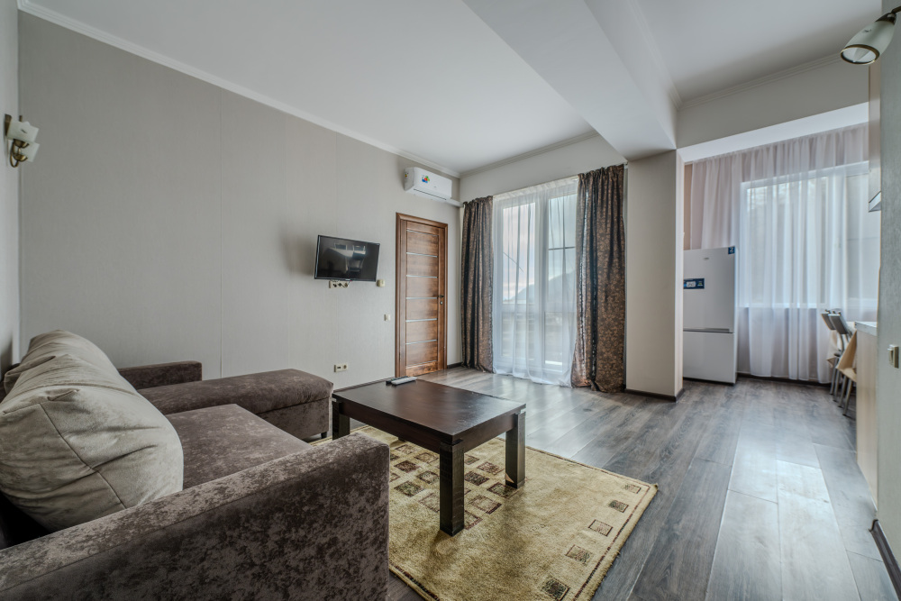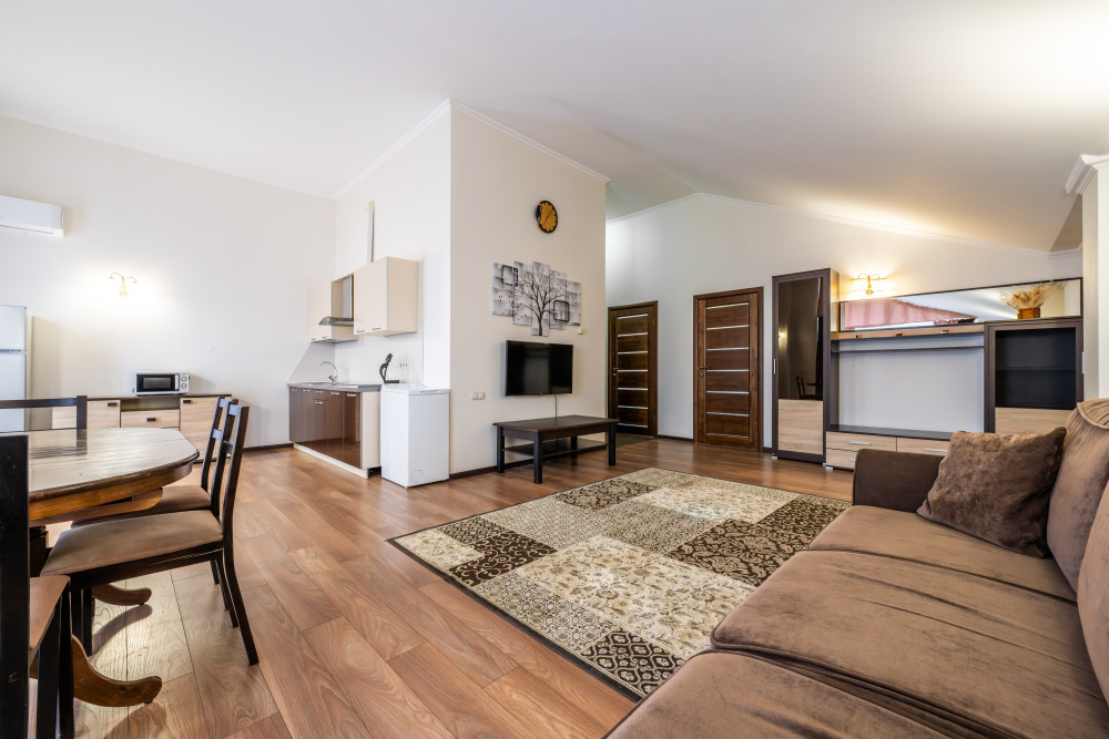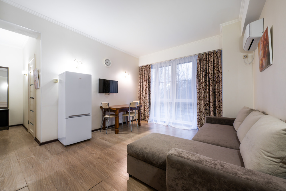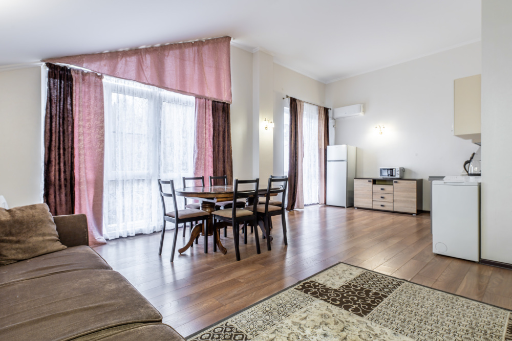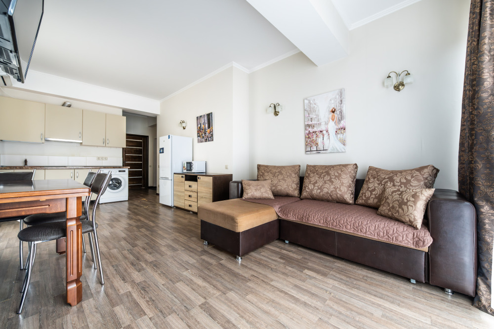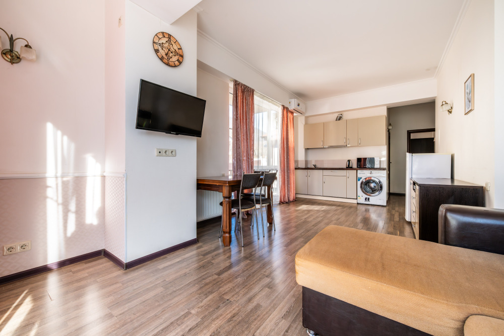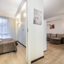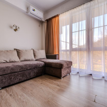 В Апартаментах, вы по-настоящему отдохнете в приятной домашней обстановке. Отдельная спальня и просторная гостиная самая удобная планировка для комфортного отдыха. Имеется 4 спальных места - 2 в спальне и 2 на раскладывающемся диване. Отдельно стоит отметить наличие кухни с необходимым инвентарем и оборудованием для приготовления блюд, что тоже очень удобно. Санузел с душем и стиральной машинкой.