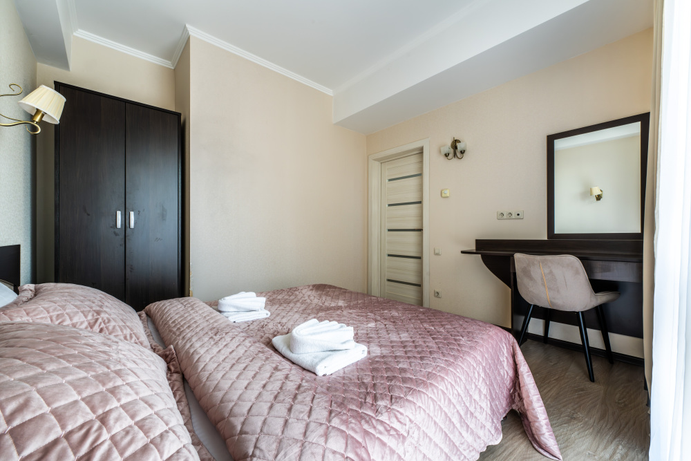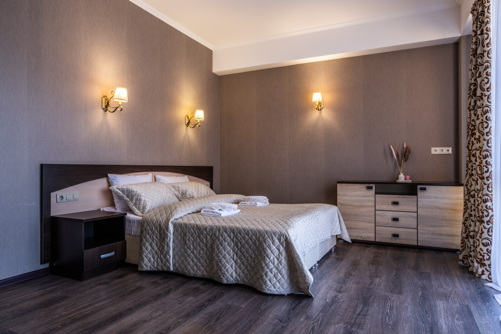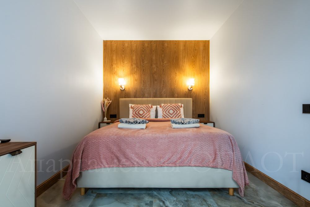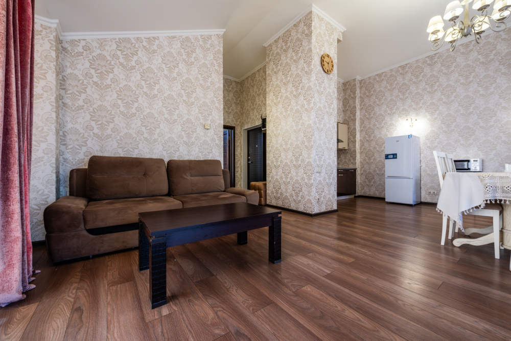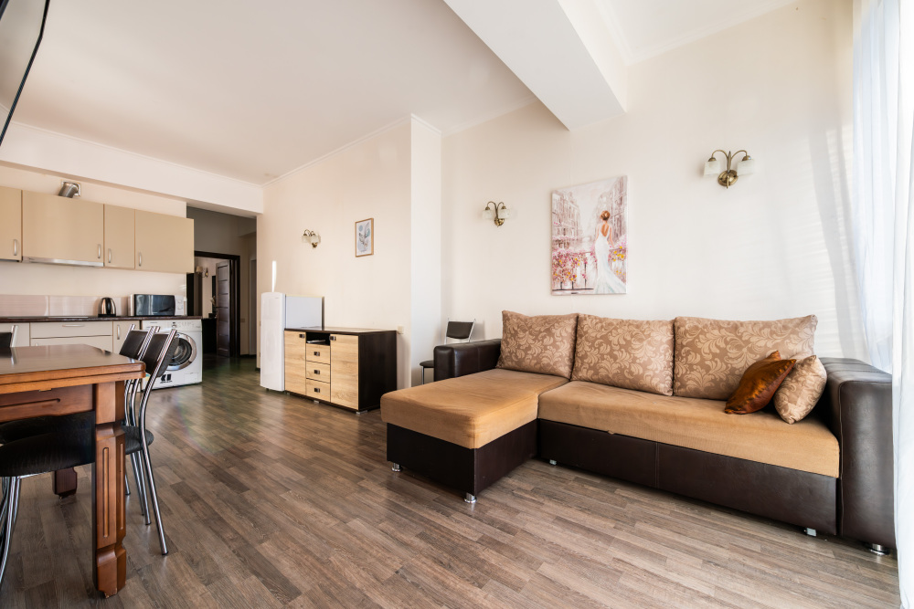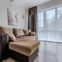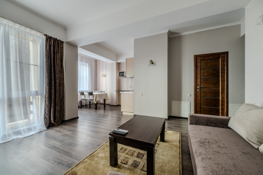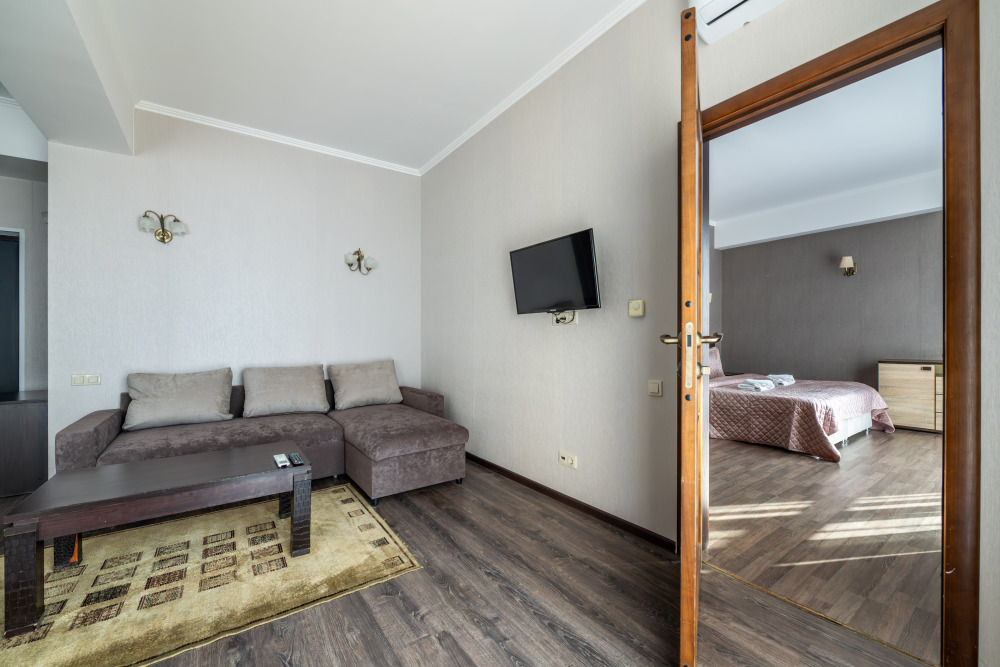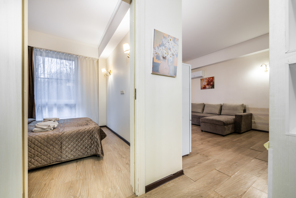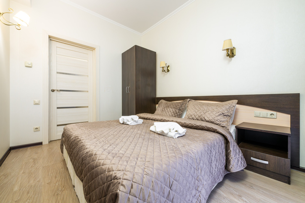 В Апартаментах, вы по-настоящему отдохнете в приятной домашней обстановке. Отдельная спальня и просторная гостиная самая удобная планировка для комфортного отдыха. Имеется 4 спальных места - 2 в спальне и 2 на раскладывающемся диване. Отдельно стоит отметить наличие кухни с необходимым инвентарем и оборудованием для приготовления блюд, что тоже очень удобно. Санузел с душем и стиральной машинкой.