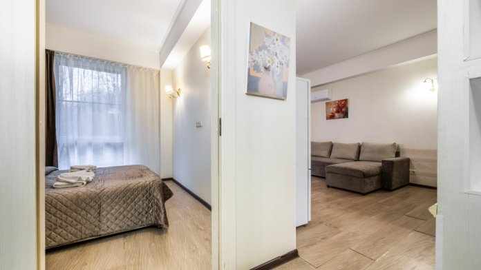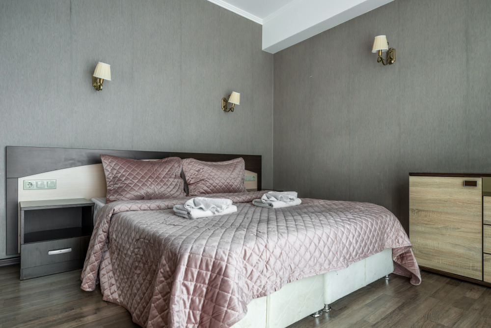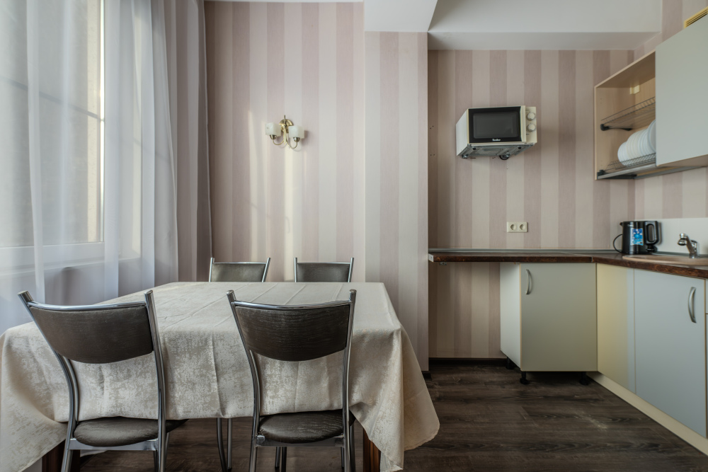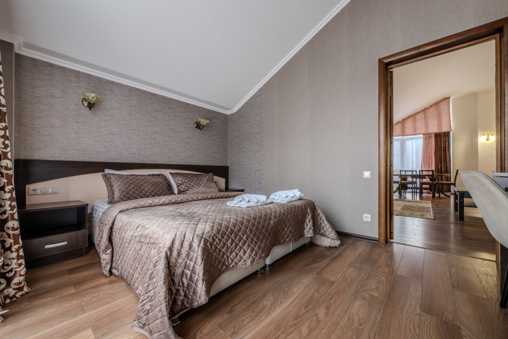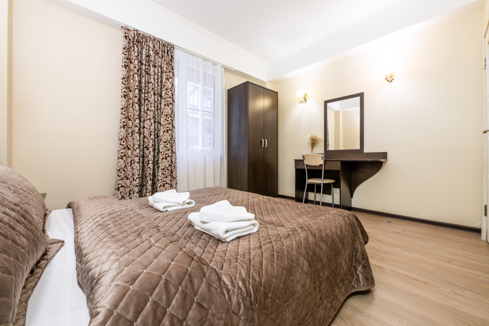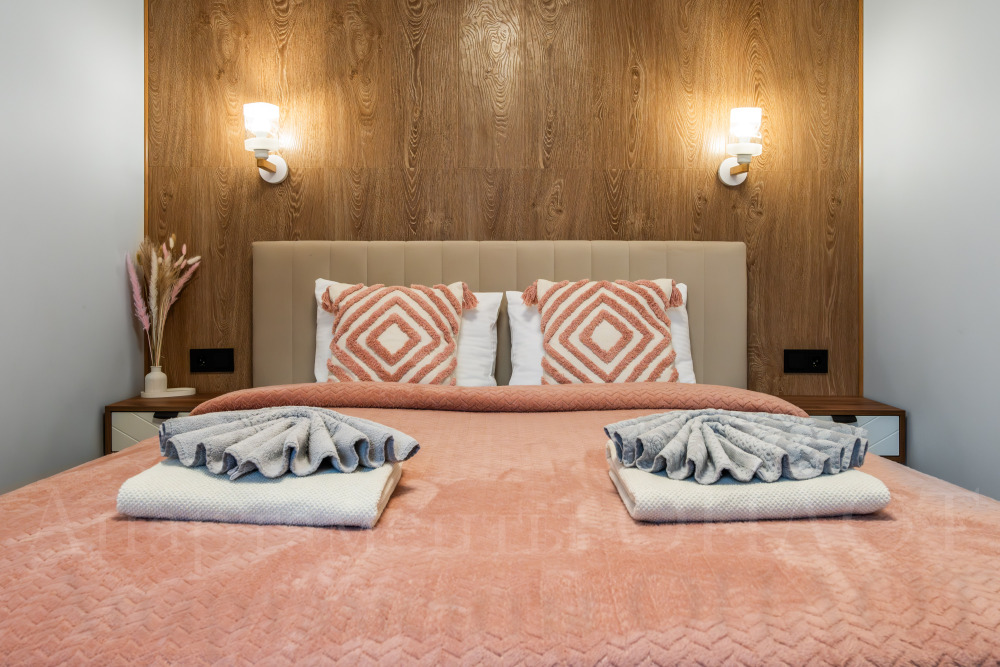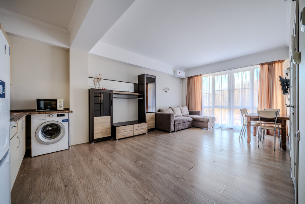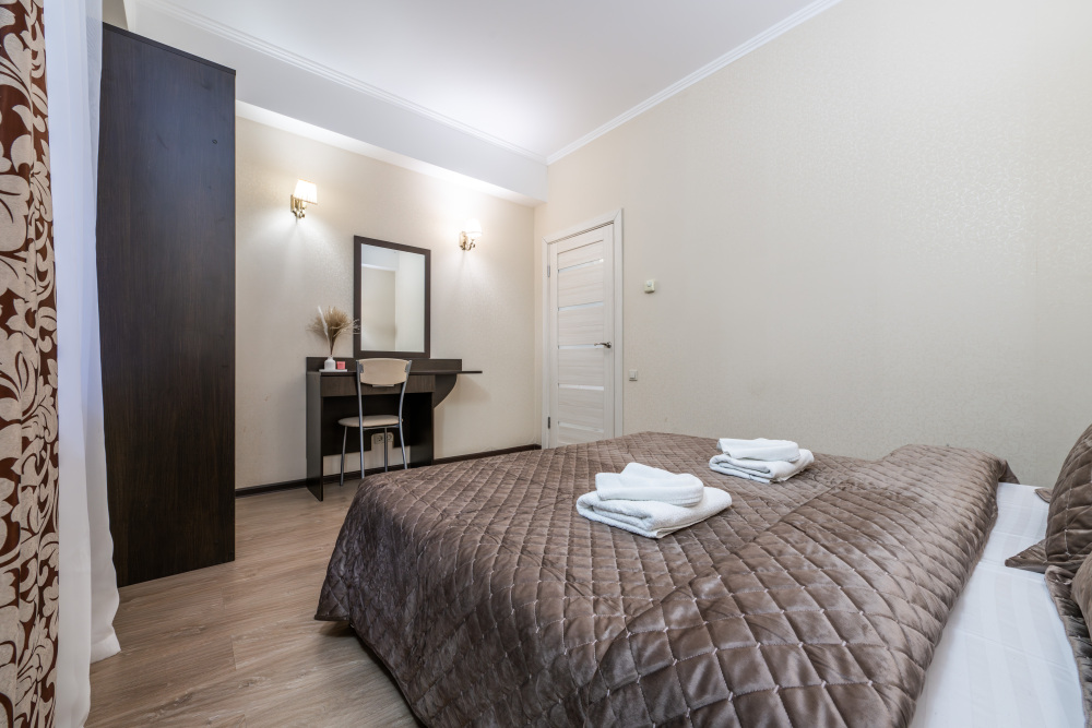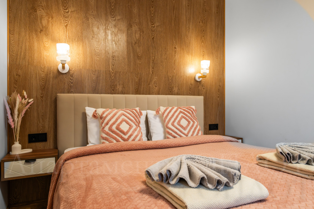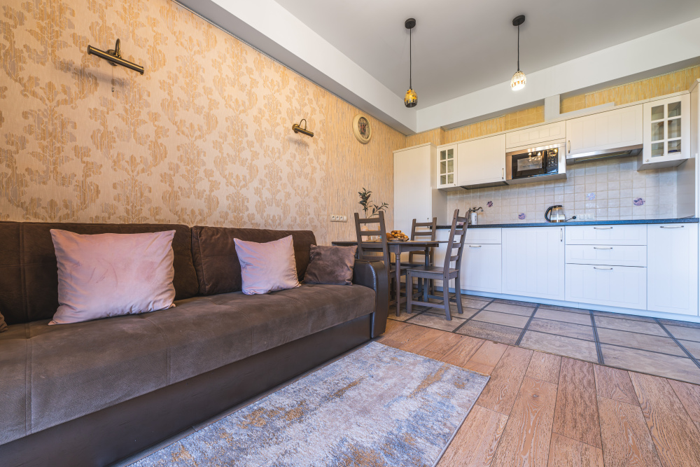 В Апартаментах, вы по-настоящему отдохнете в приятной домашней обстановке. Отдельная спальня и просторная гостиная самая удобная планировка для комфортного отдыха. Имеется 4 спальных места - 2 в спальне и 2 на раскладывающемся диване. Отдельно стоит отметить наличие кухни с необходимым инвентарем и оборудованием для приготовления блюд, что тоже очень удобно. Санузел с душем и стиральной машинкой.