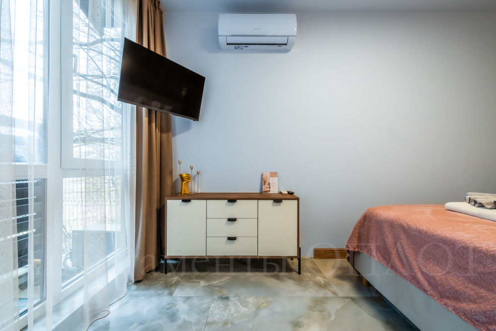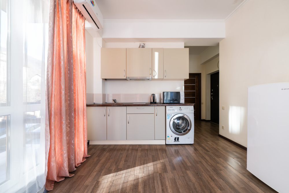 «Студия Green Oplot Apartments «. Уютная Студия на первом этаже площадью 19 м2 с собственной террасой для 1-3 гостей, c двумя раздельными кроватям и раскладным креслом. В центре Красной поляны со своим отдельным входом. Студия оснащена классическим душем. Кухня полностью укомплектована: кастрюли, сковороды, тарелки, приборы, в общем, все необходимое. В ванной комнате имеется стиральная машинка.