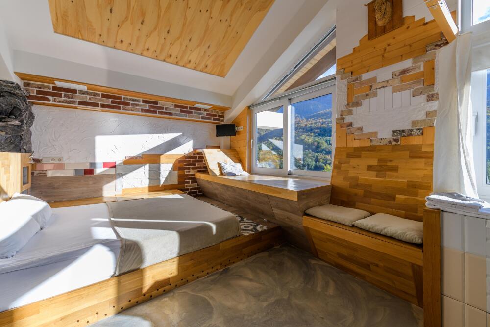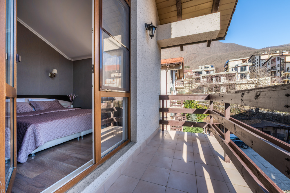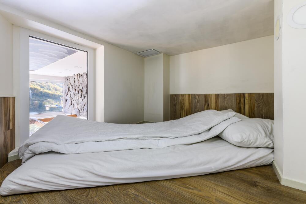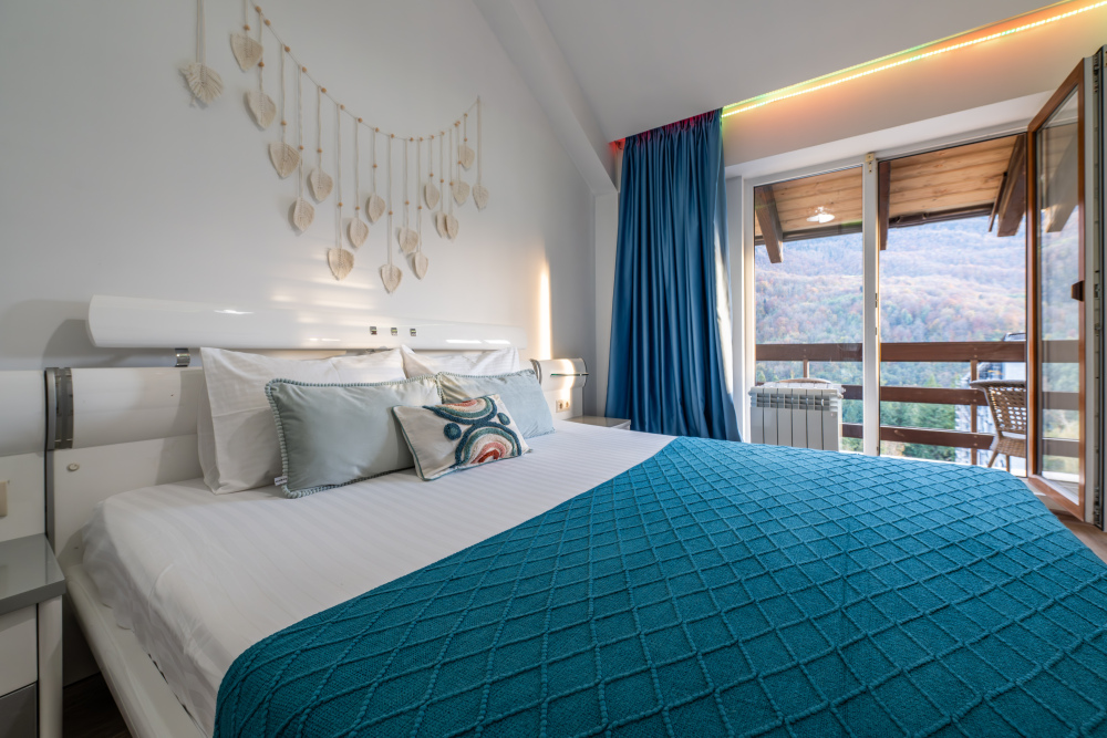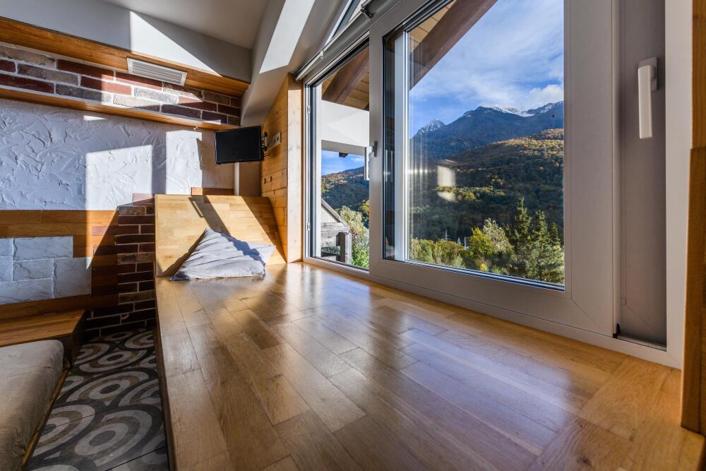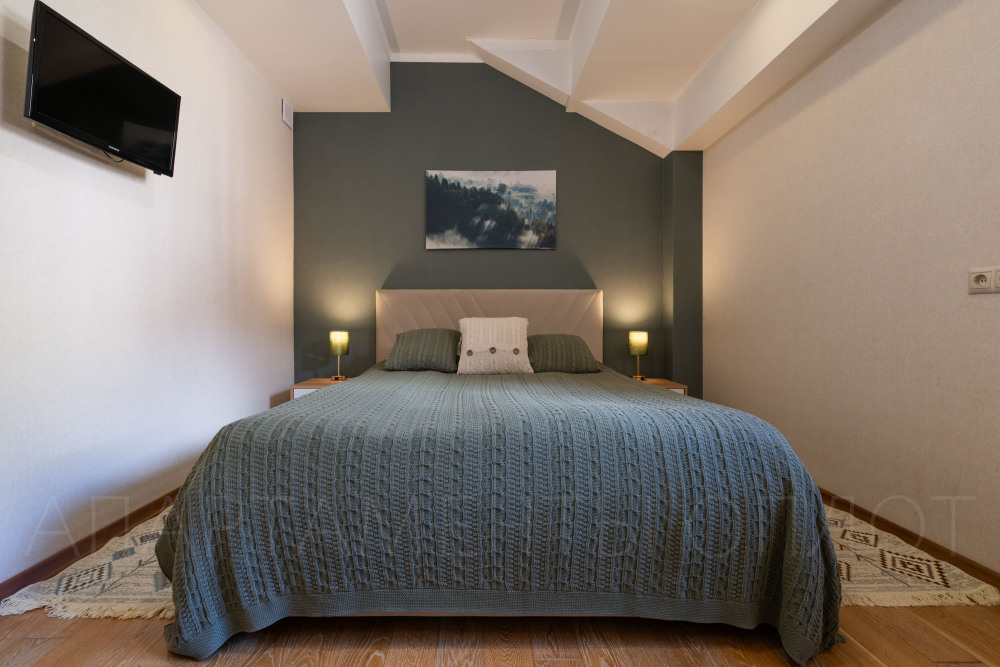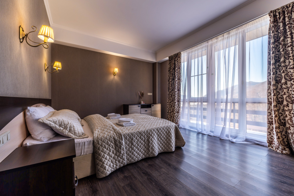 Двуспальная кровать → пробуждение в объятиях гор + выход на балкон