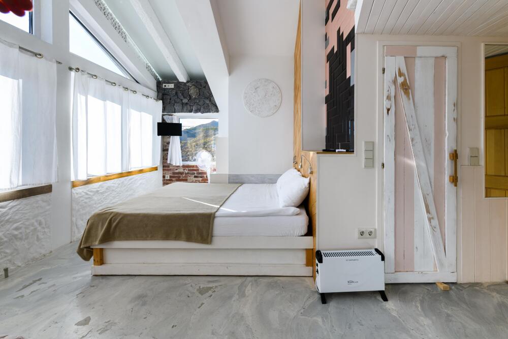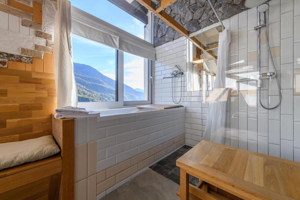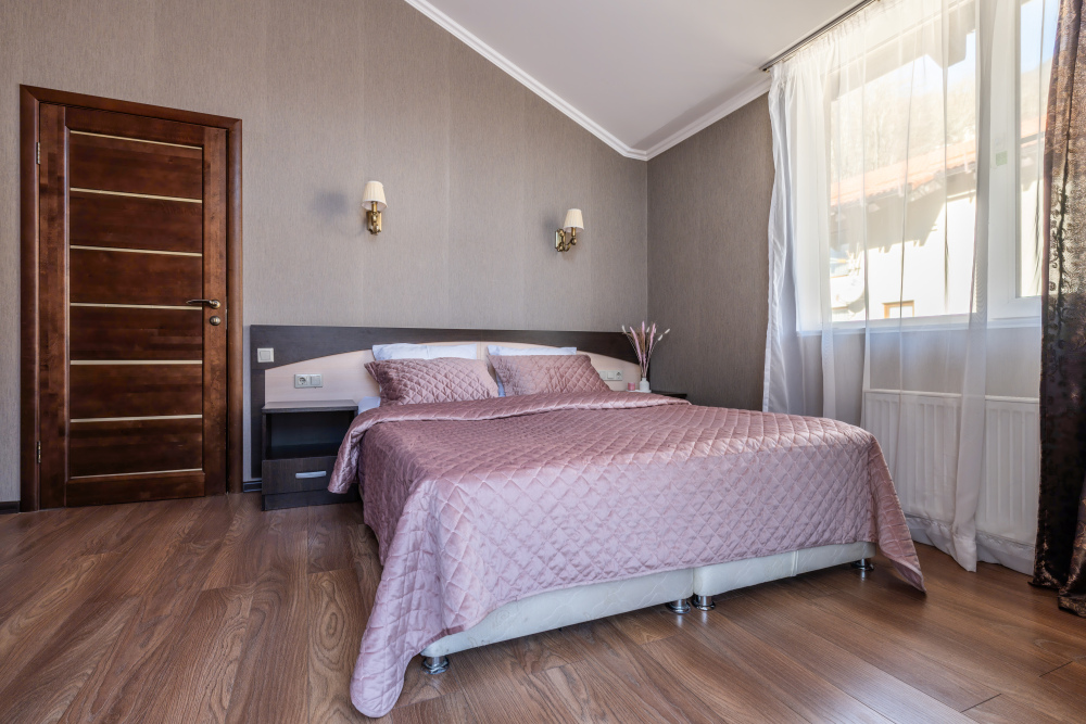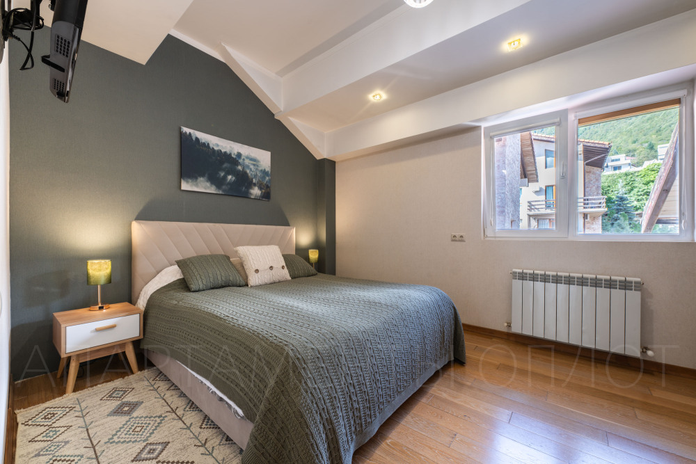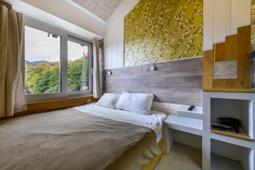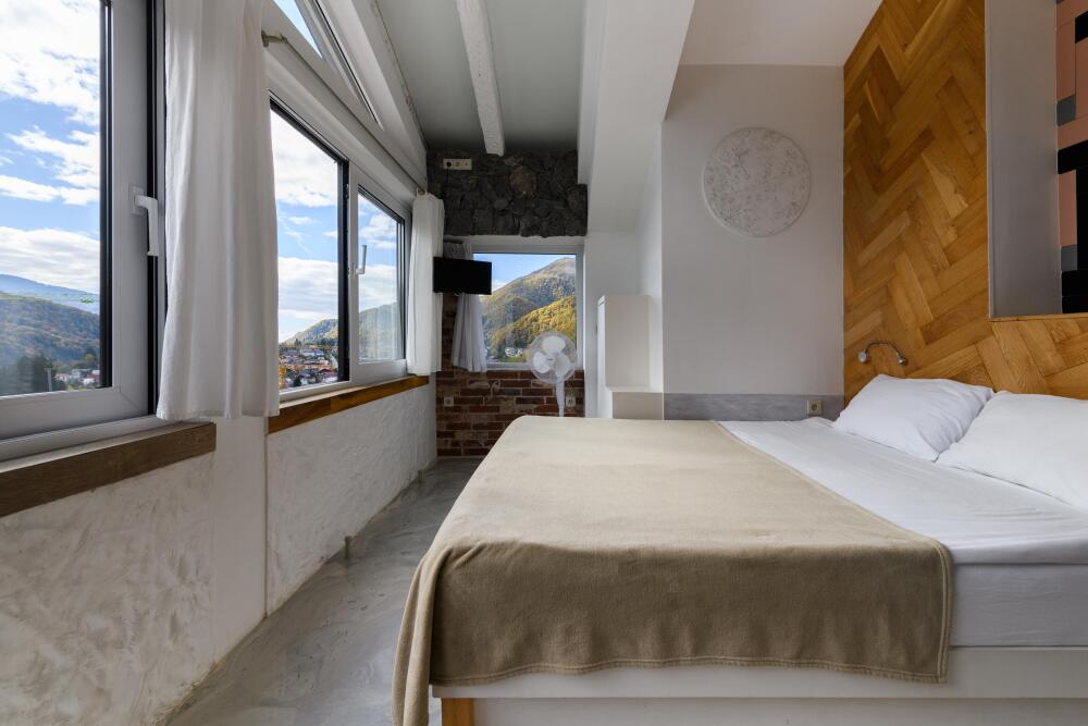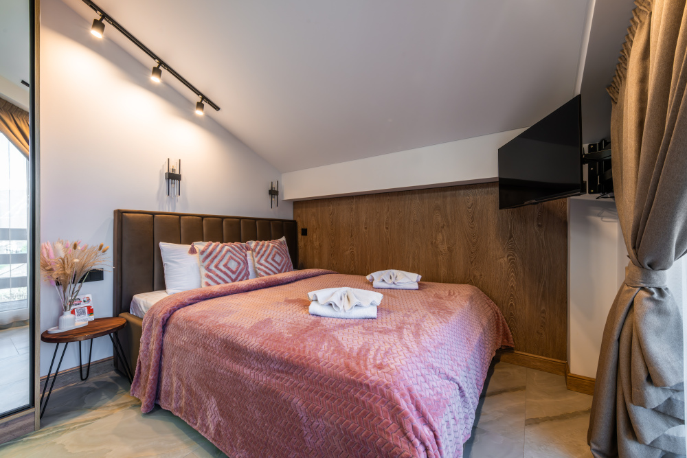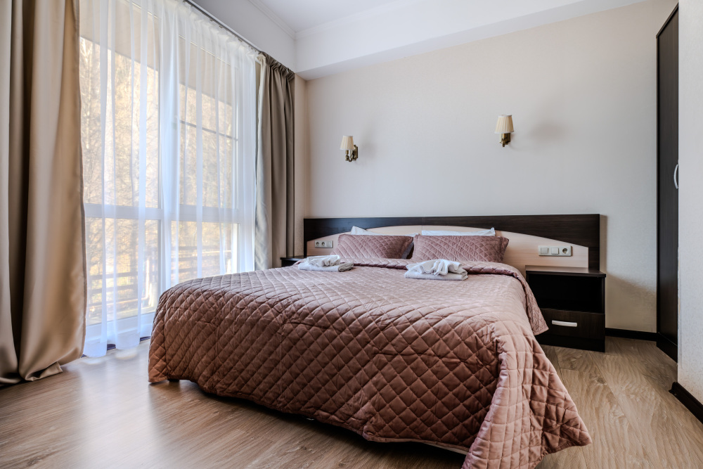 Двуспальная кровать → пробуждение в объятиях гор + выход на балкон