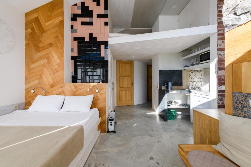 «Делюкс с выходом на террасу» 45 м2 Оснащенные всей нужной мебелью и техникой: полноценная кухня с плитой и посудомоечной машиной, холодильник.