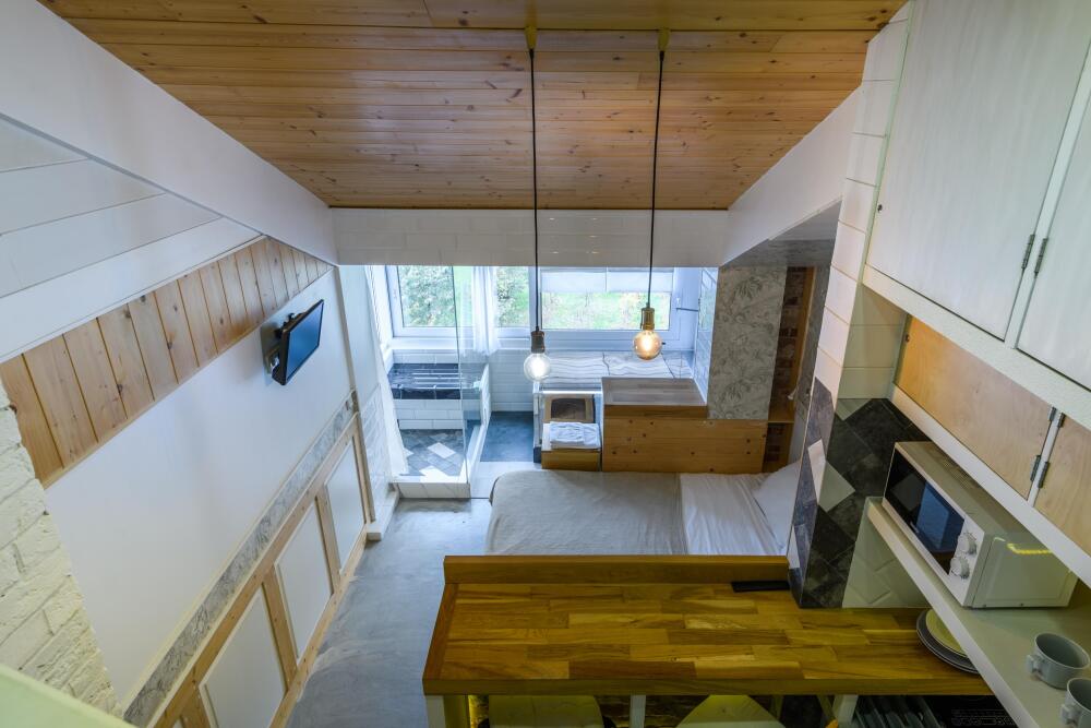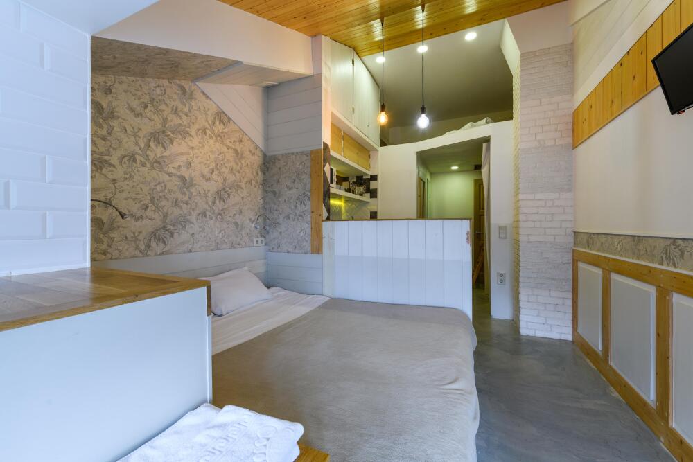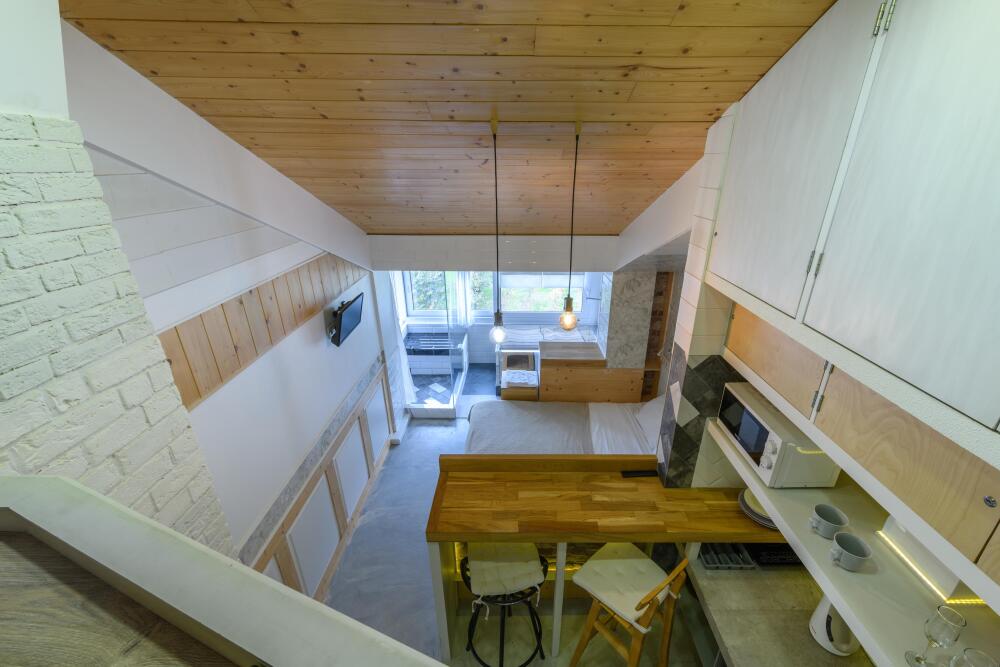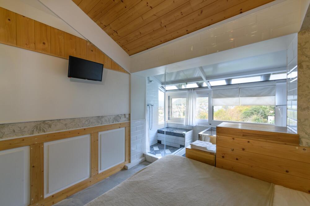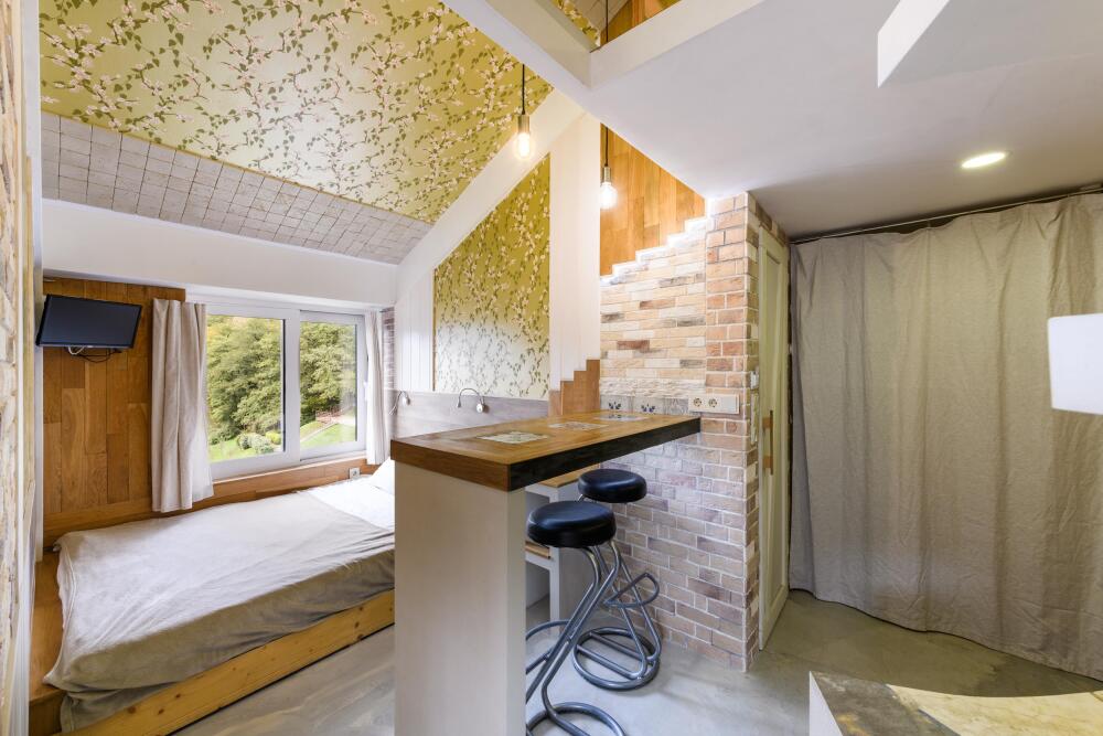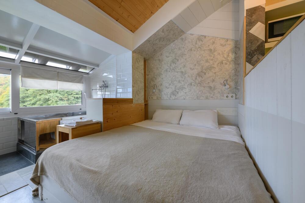 Просторная комната с панорамными окнами и большой кроватью, где можно нежиться и смотреть на кроны деревьев. Студия также отличается удобной планировкой с уютной мини кухней с необходимым инвентарем и оборудованием для приготовления блюд.. Есть холодильник, микроволновка, электрический чайник, электро плита, обеденная группа. В комнате установлена большая кровать, телевизор, обеденный стол. Санузел с душем.
