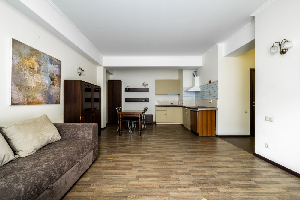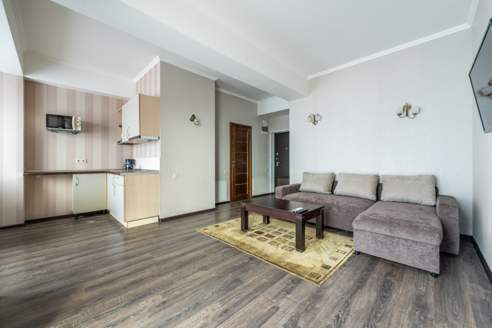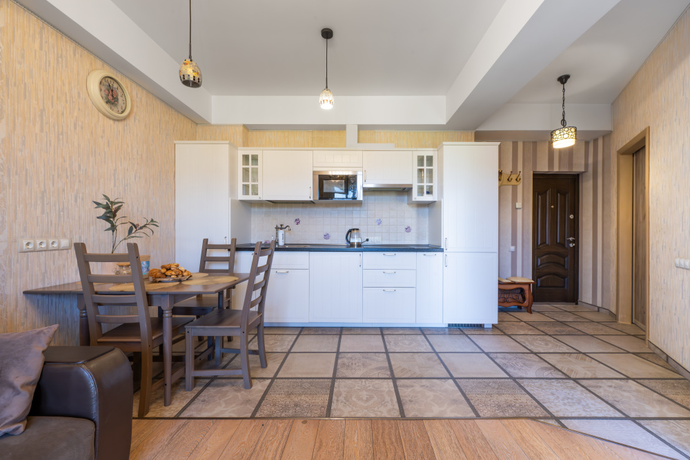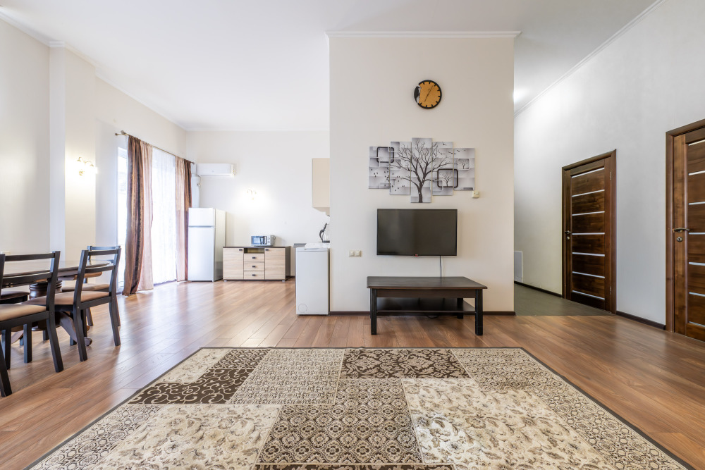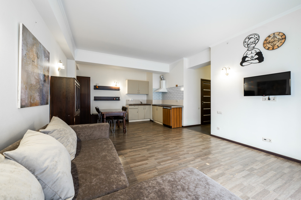 Вас ожидает полноценная кухня с плитой и посудой, холодильник , духовой шкаф. В гостиной вы найдете уютную мебель, ЖК телевизор со спутниковыми каналами, систему обогрева и кондиционирования воздуха, теплые полы, работающий Wi-fi, а также фен, гладильную доску и утюг. Апартаменты предлагают 5-6 спальных мест - 2 в спальной зоне , 2 на удобном раскладывающемся диване в гостиной и 2 на раскладывающем диване в гостиной комнате со свои сан узлом .