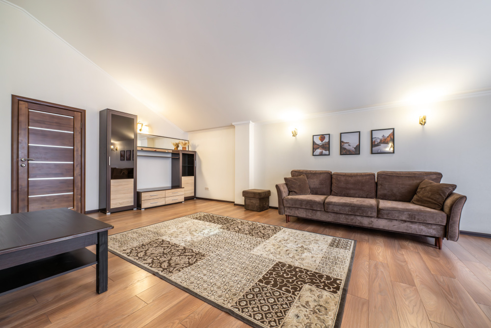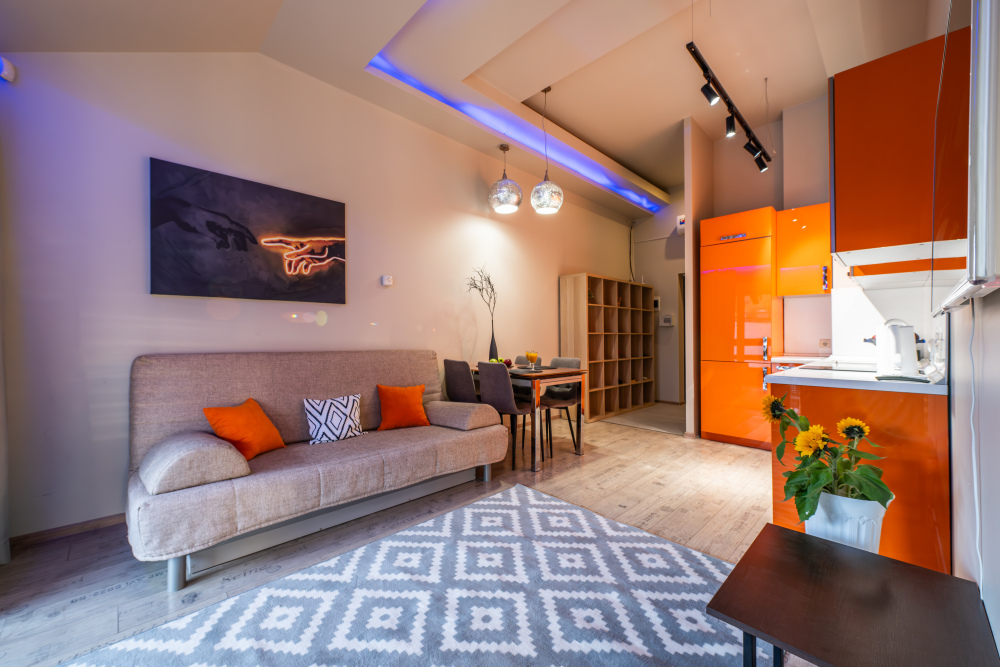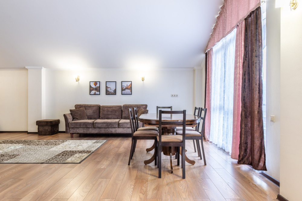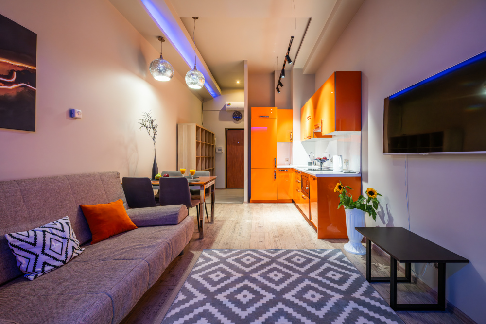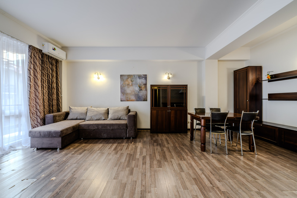 Вас ожидает полноценная кухня с плитой и посудой, холодильник , духовой шкаф. В гостиной вы найдете уютную мебель, ЖК телевизор со спутниковыми каналами, систему обогрева и кондиционирования воздуха, теплые полы, работающий Wi-fi, а также фен, гладильную доску и утюг. Апартаменты предлагают 5-6 спальных мест - 2 в спальной зоне , 2 на удобном раскладывающемся диване в гостиной и 2 на раскладывающем диване в гостиной комнате со свои сан узлом .