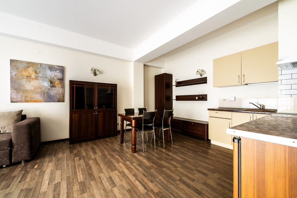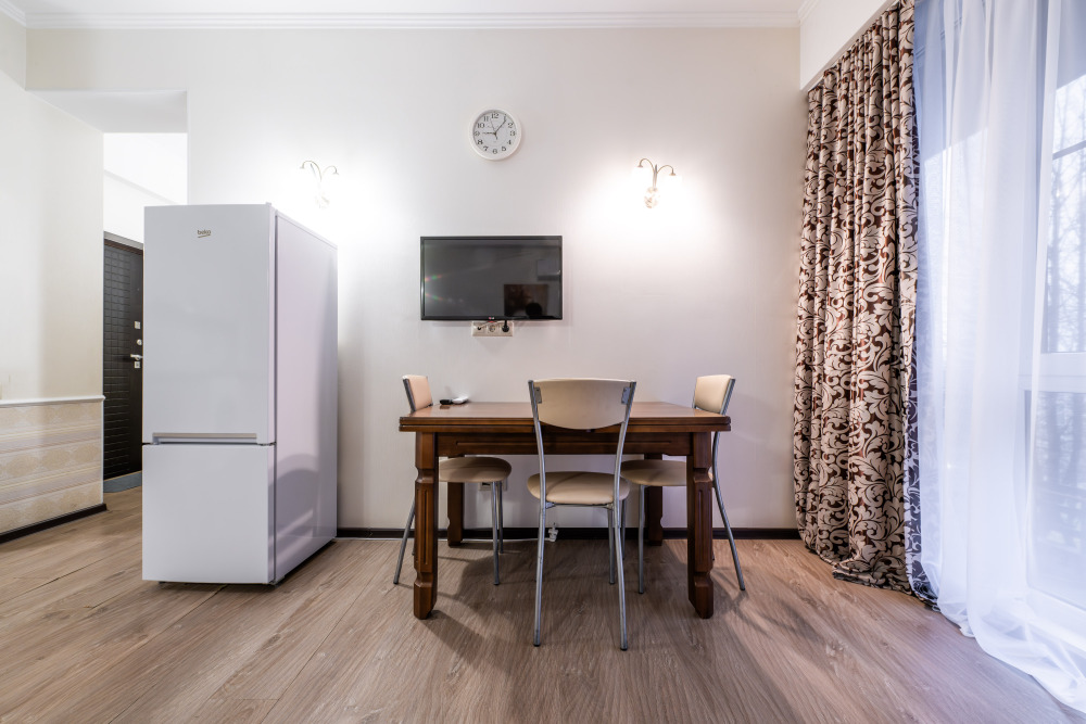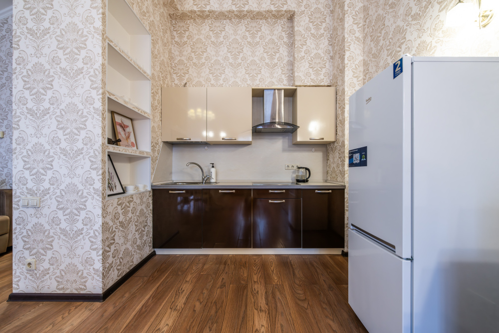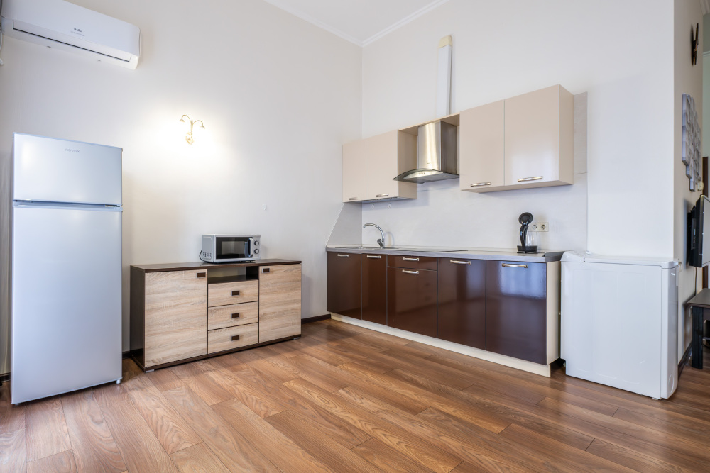 Апартаменты 45 м2 - Оснащенные всей нужной мебелью и техникой: полноценная кухня с плитой и посудой, холодильник.