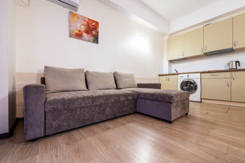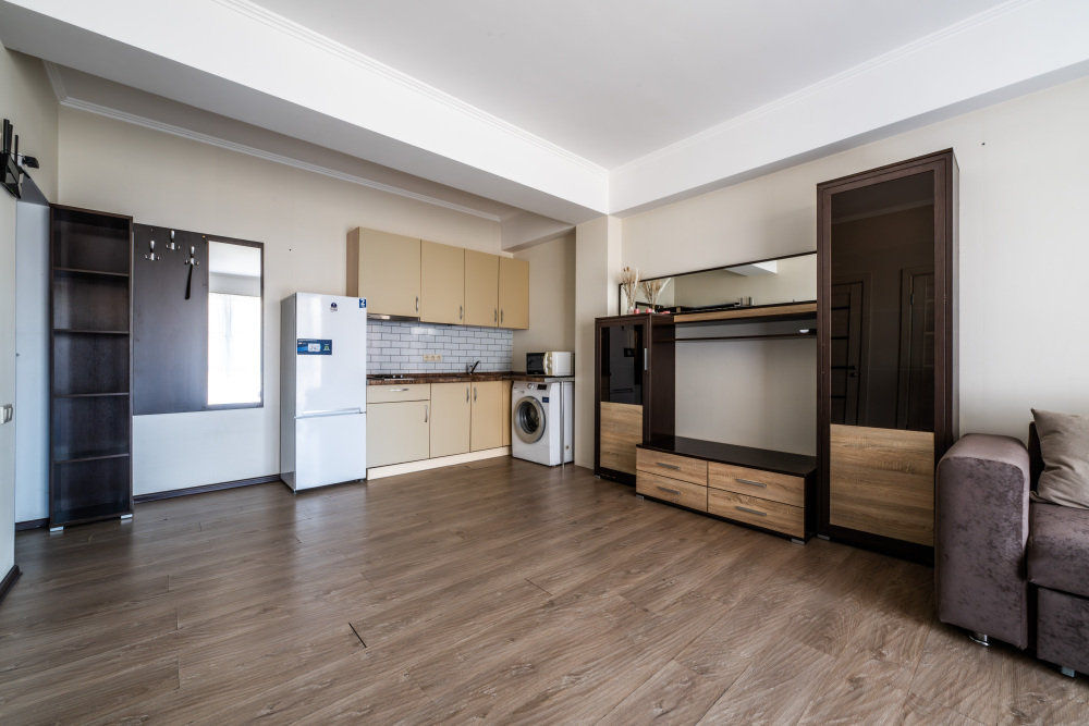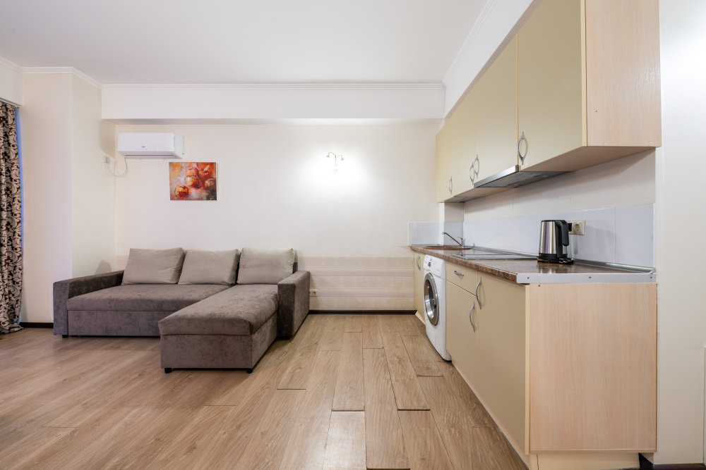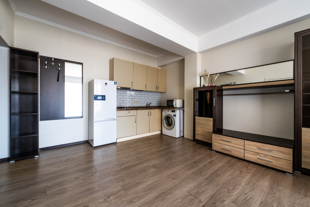 Просторный Студия с зоной гостиной, кухни и спальни. Кухня полностью укомплектована: кастрюли, сковороды, тарелки, приборы, в общем, все необходимое.