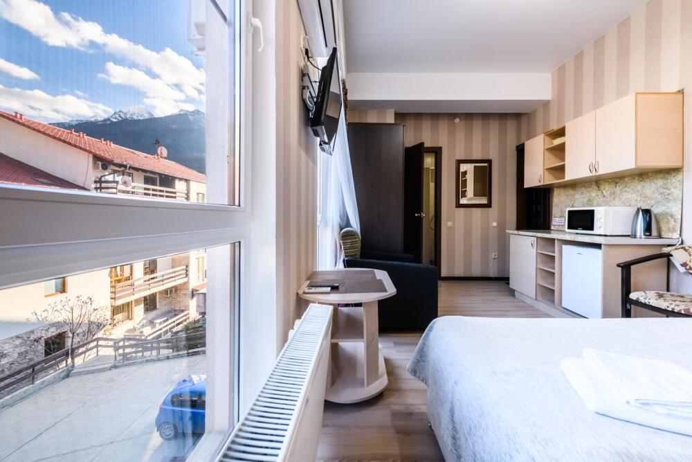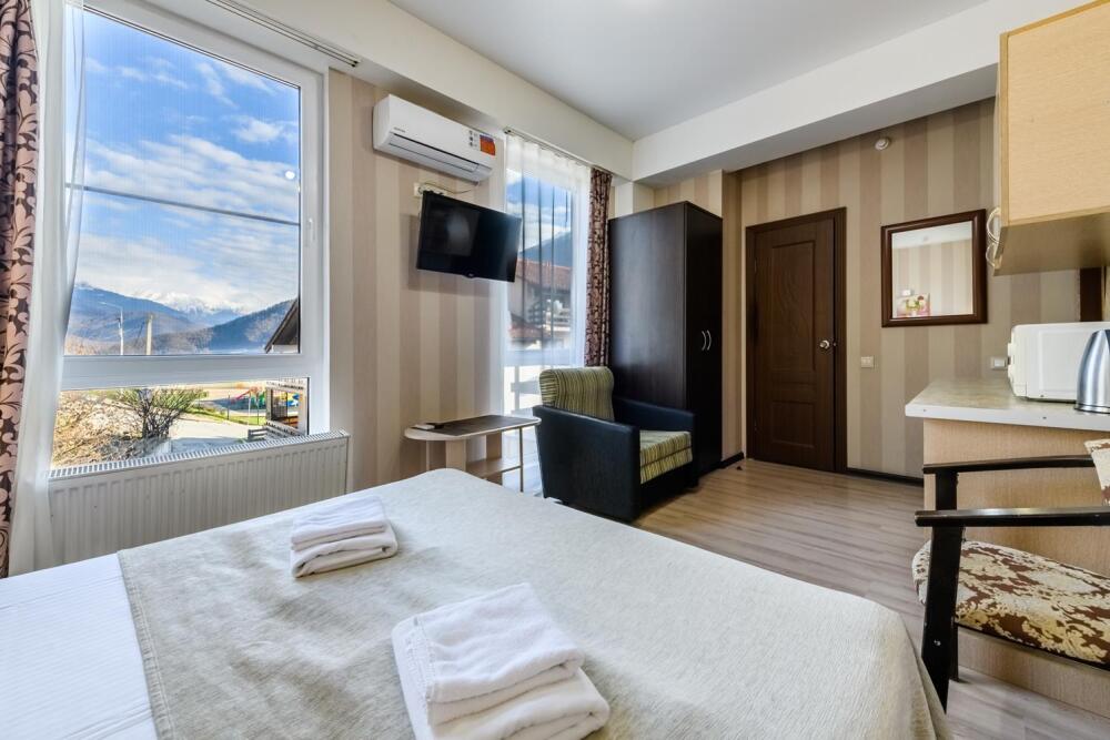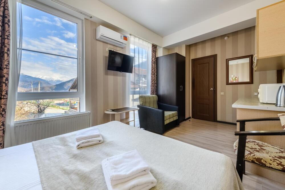Улучшенная Студия с видами на горы 27 м2, Главным преимуществом этих Студий является «виды на горы» - просторная комната с панорамными окнами и большой кроватью, где можно нежиться и смотреть на горные вершины. Студия также отличается удобной планировкой с уютной мини кухней с необходимым инвентарем и оборудованием для приготовления блюд.. Есть холодильник, микроволновка, электрический чайник, обеденная группа. В комнате установлена большая кровать,2 доп места- раскладные кресла, телевизор, письменный стол. Санузел с душем.