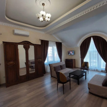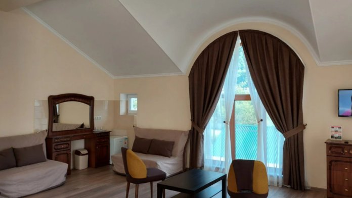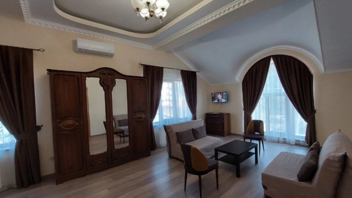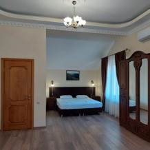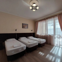 В номере односпальные кровати, которые крепятся вместе и получается полноценная двуспальная кровать, диван, кухня оборудована техникой и посудой, есть WI-FI, телевизор, холодильник, стиральная машина, кондиционер, шкаф, стулья, санузел, душевая кабина, фен, лицевое, банное, ножное полотенца, мыло, шампунь, гель для душа. По требованию выдаем пляжные полотенца. Гладильные принадлежности. Балкон оборудован для отдыха.